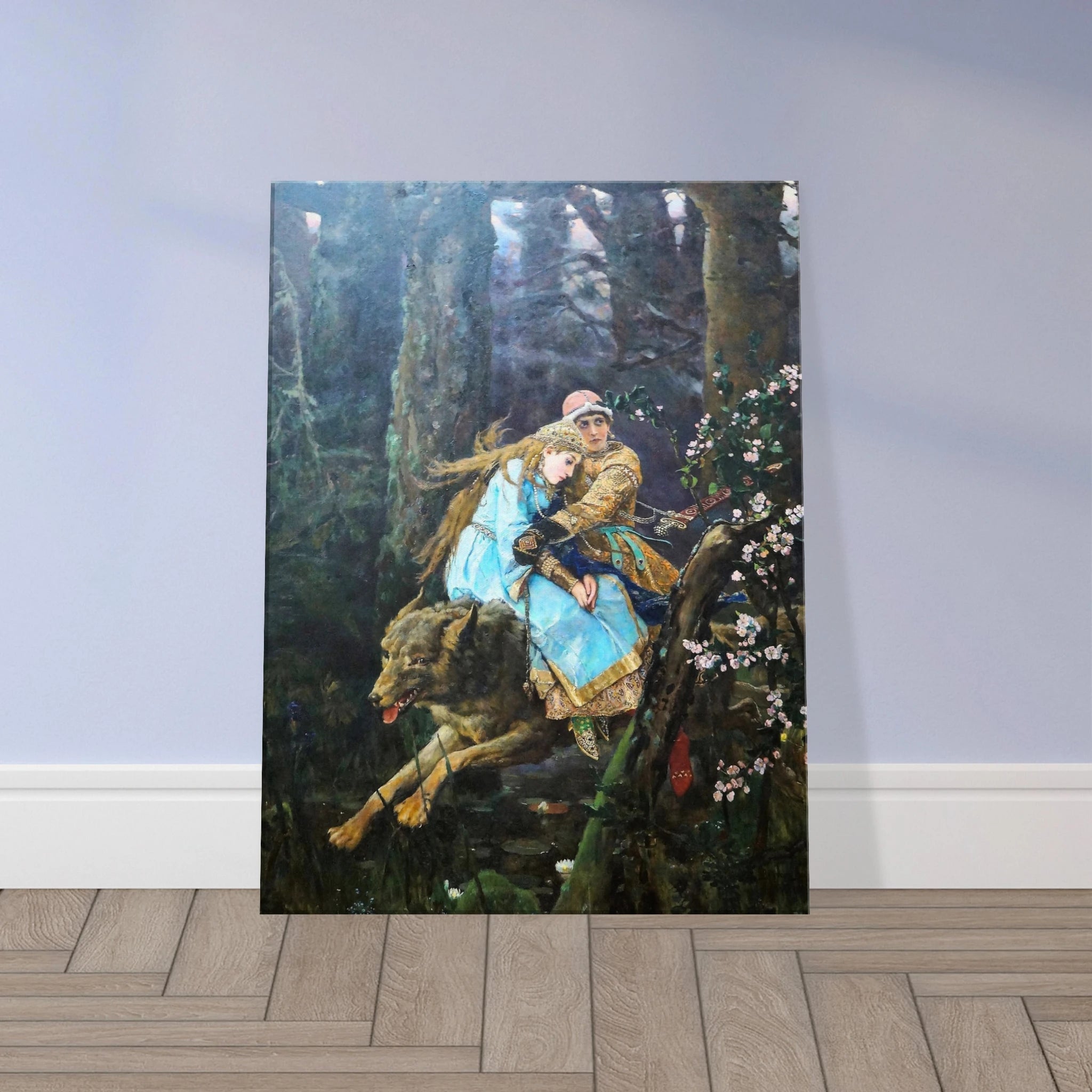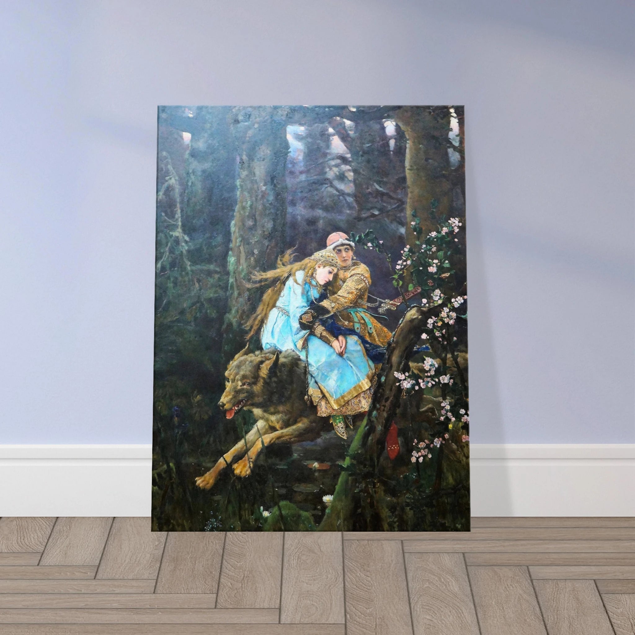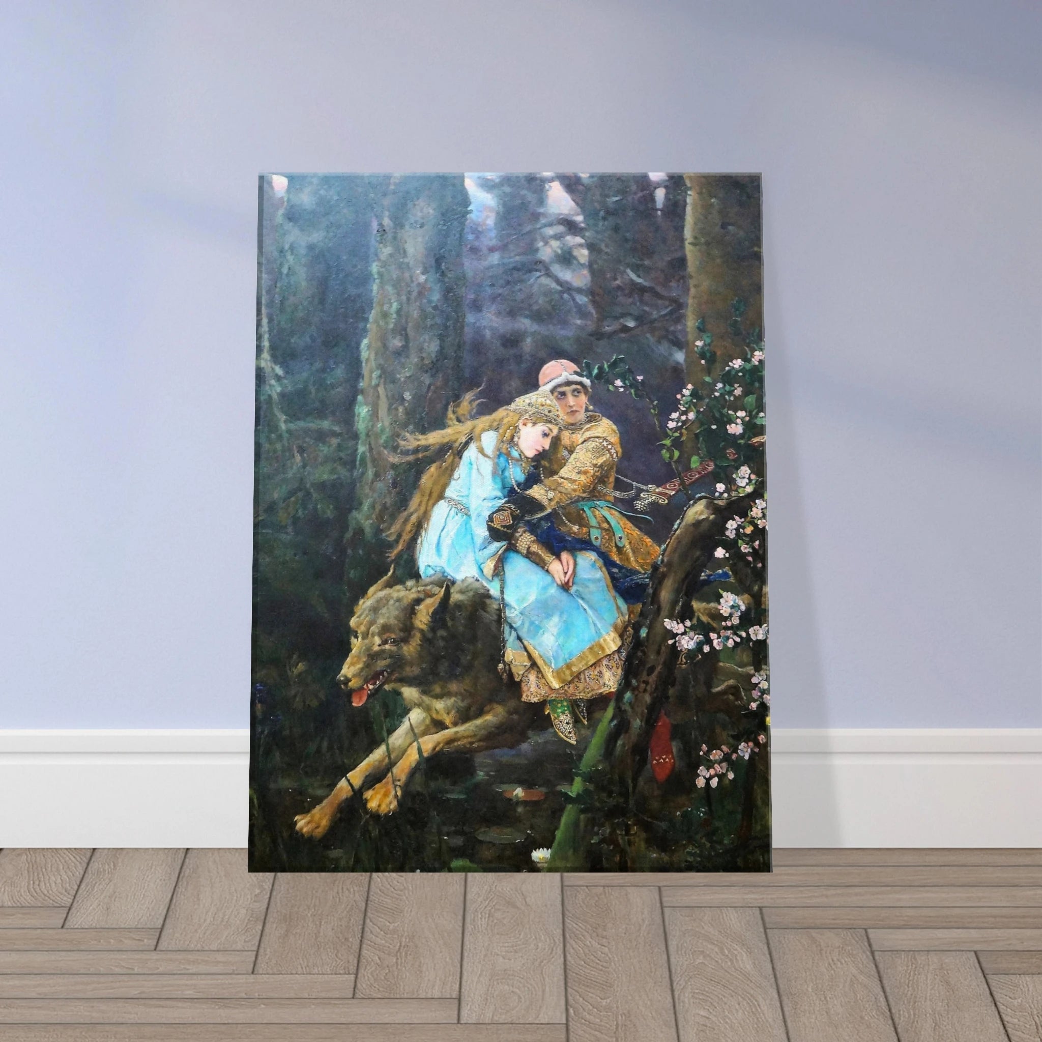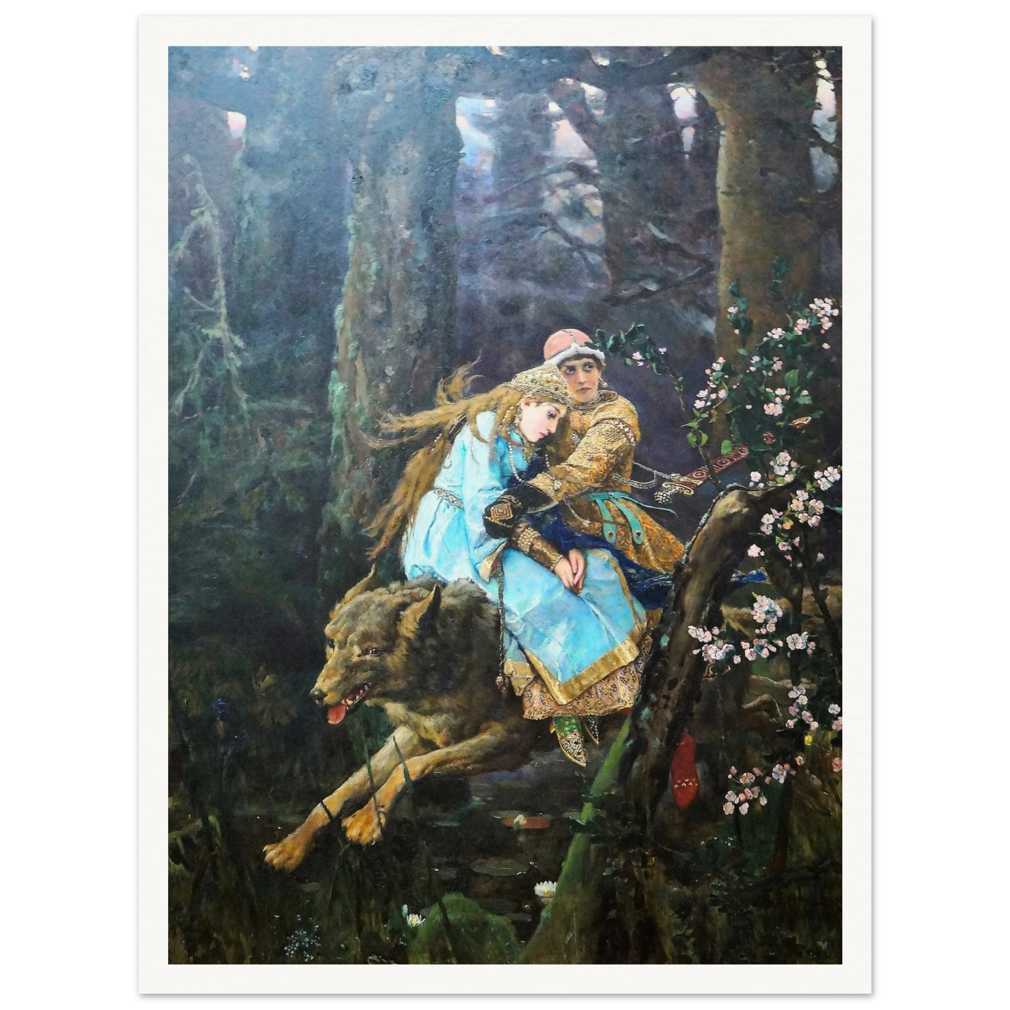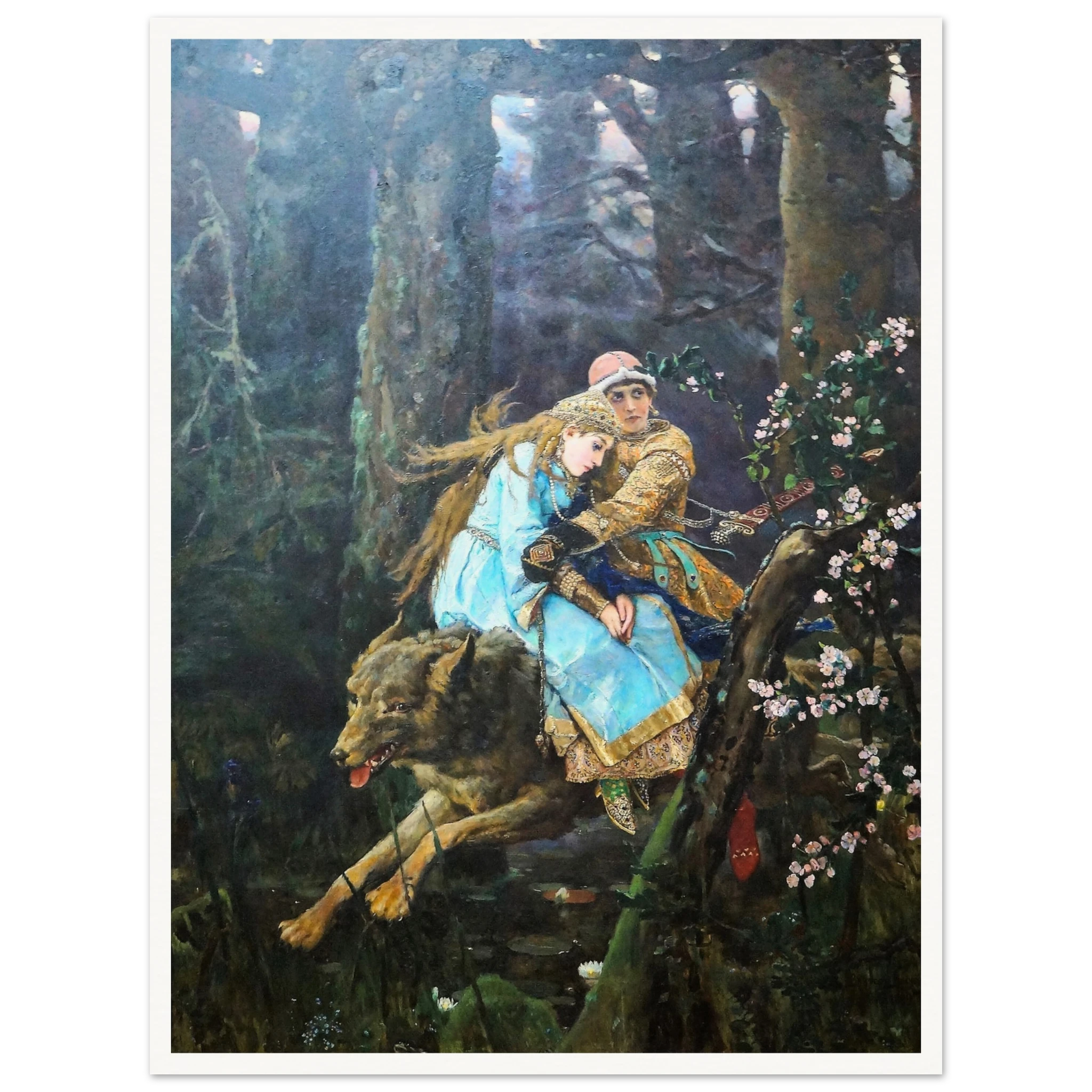Esta cautivadora pintura del reconocido artista Viktor Vasnetsov presenta una representación heroica de Ivan Tsarevich montado en un majestuoso lobo gris. Esta icónica obra maestra de 1889 es un testimonio de la experiencia de Vasnetsov para capturar figuras míticas e históricas con asombrosos detalles. Una obra imprescindible para los entusiastas y coleccionistas del arte.