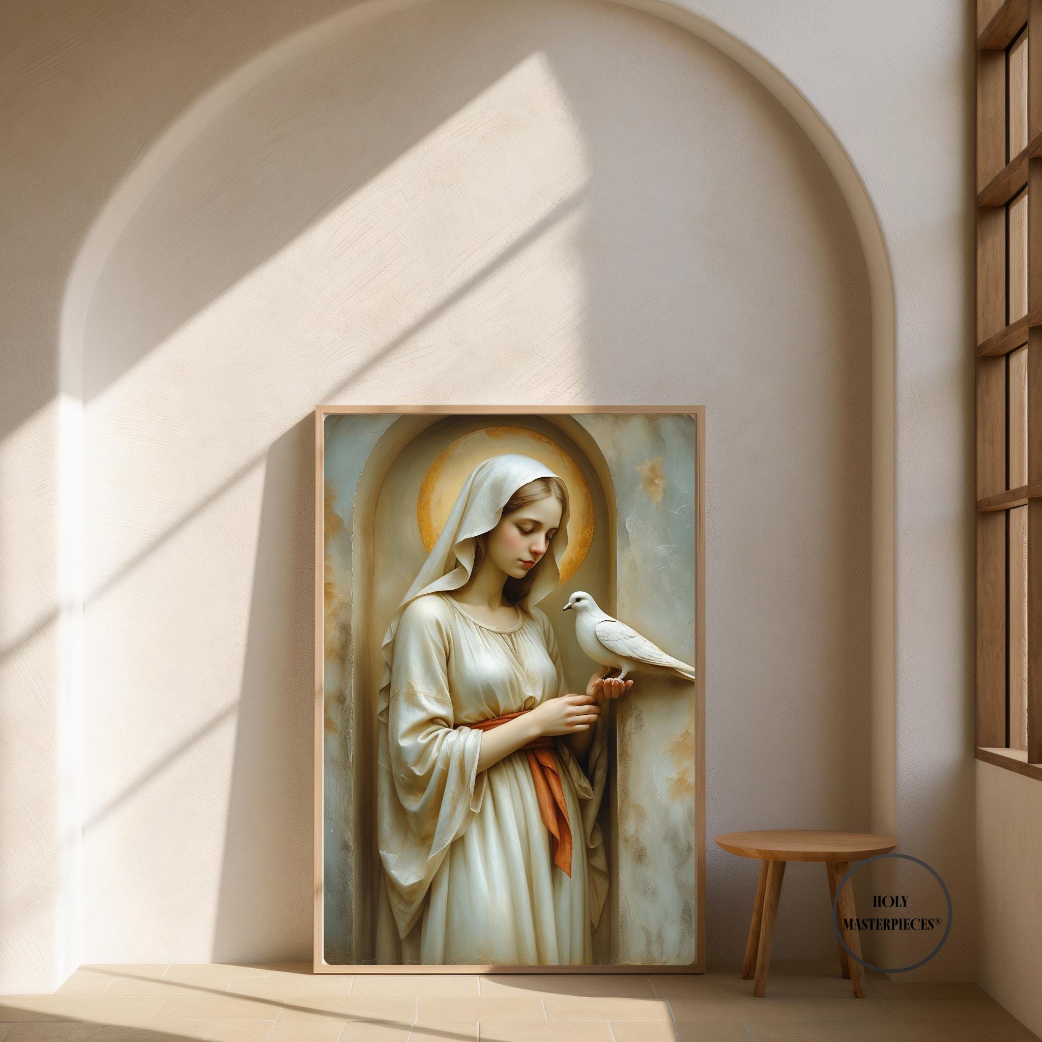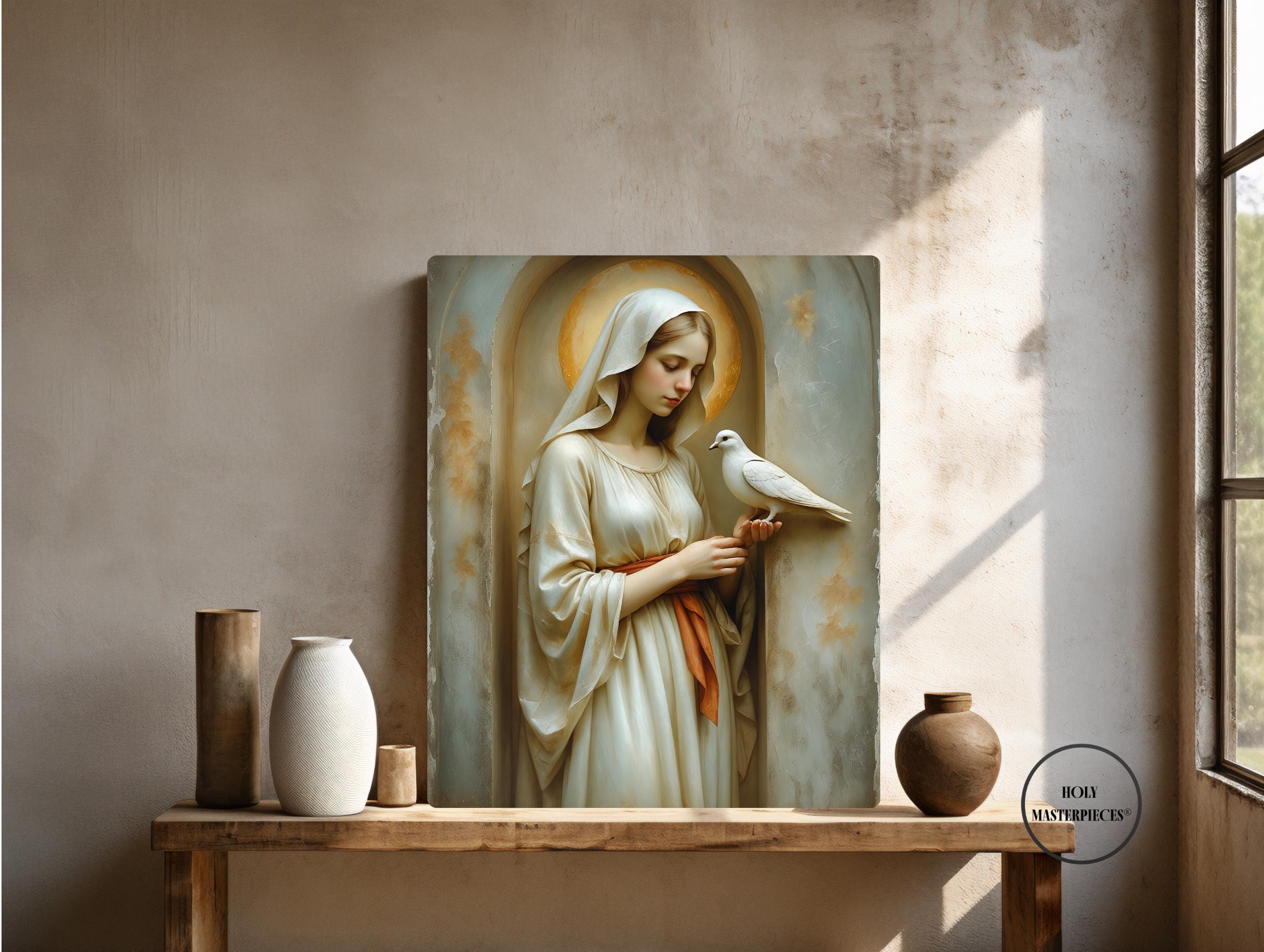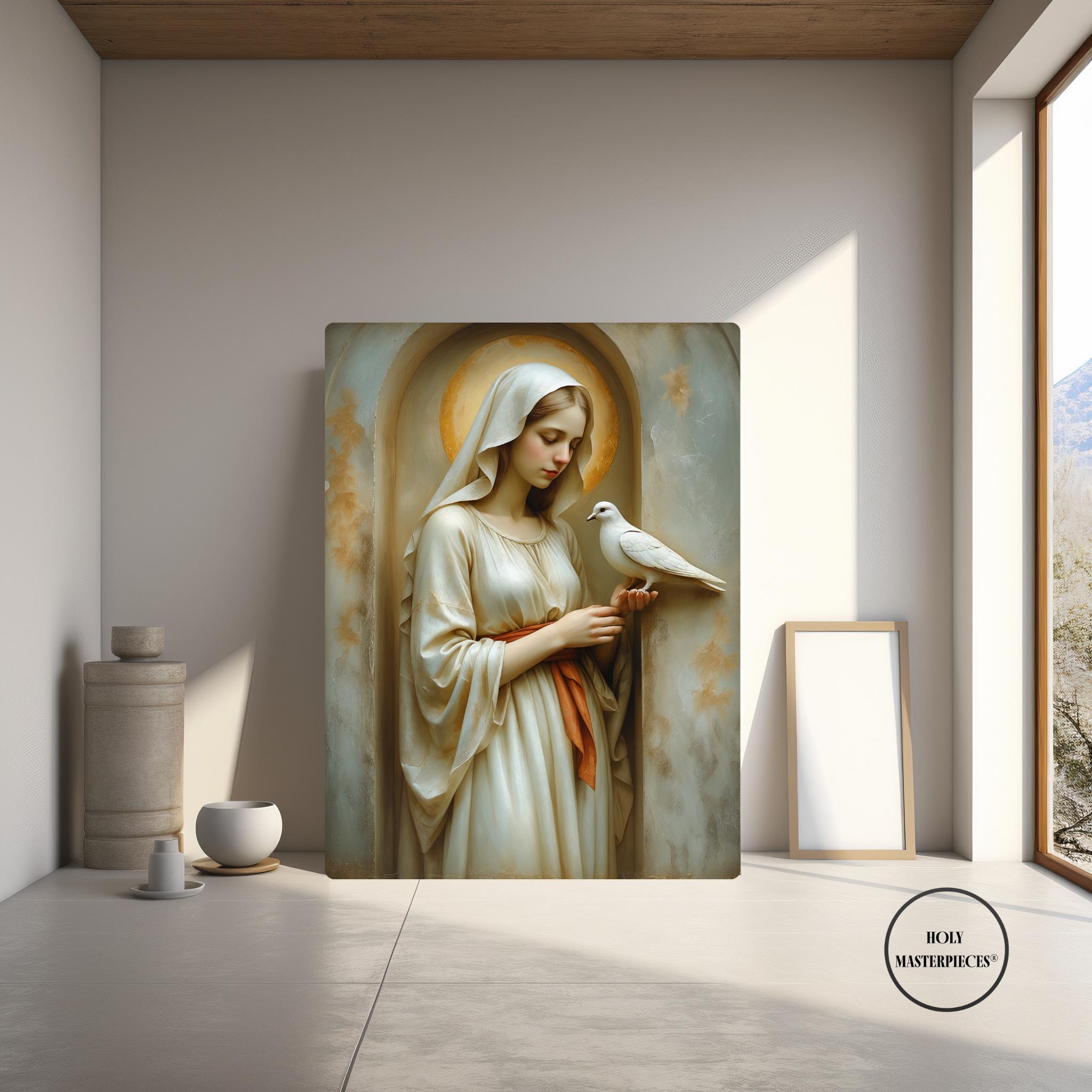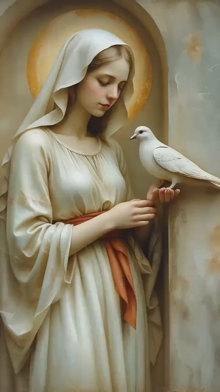 This devotional artwork presents the Blessed Virgin shown in gentle stillness as a white dove rests softly upon her hand. Her head is inclined downward, her gaze calm and contemplative, expressing quiet receptivity and peace. The dove, symbol of the Holy Spirit, purity, and divine presence, is rendered with delicate restraint, emphasizing harmony rather than motion or narrative action.