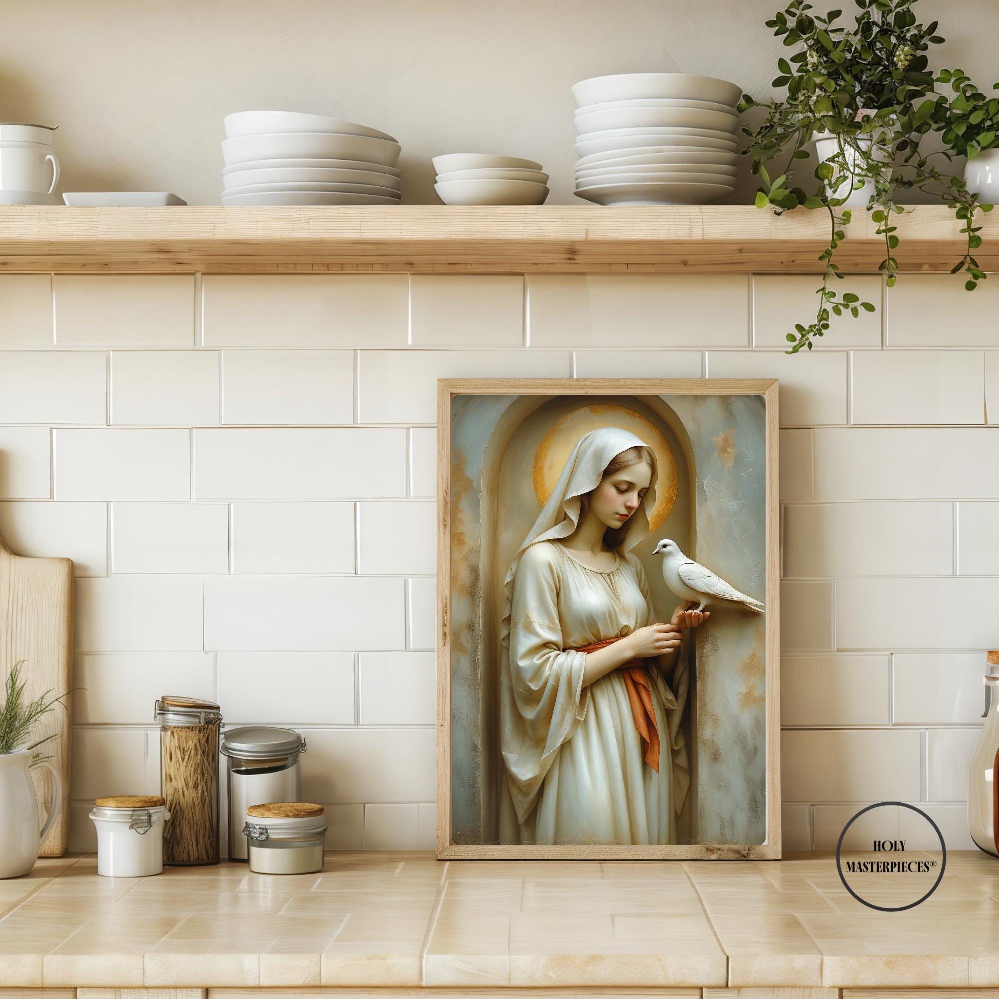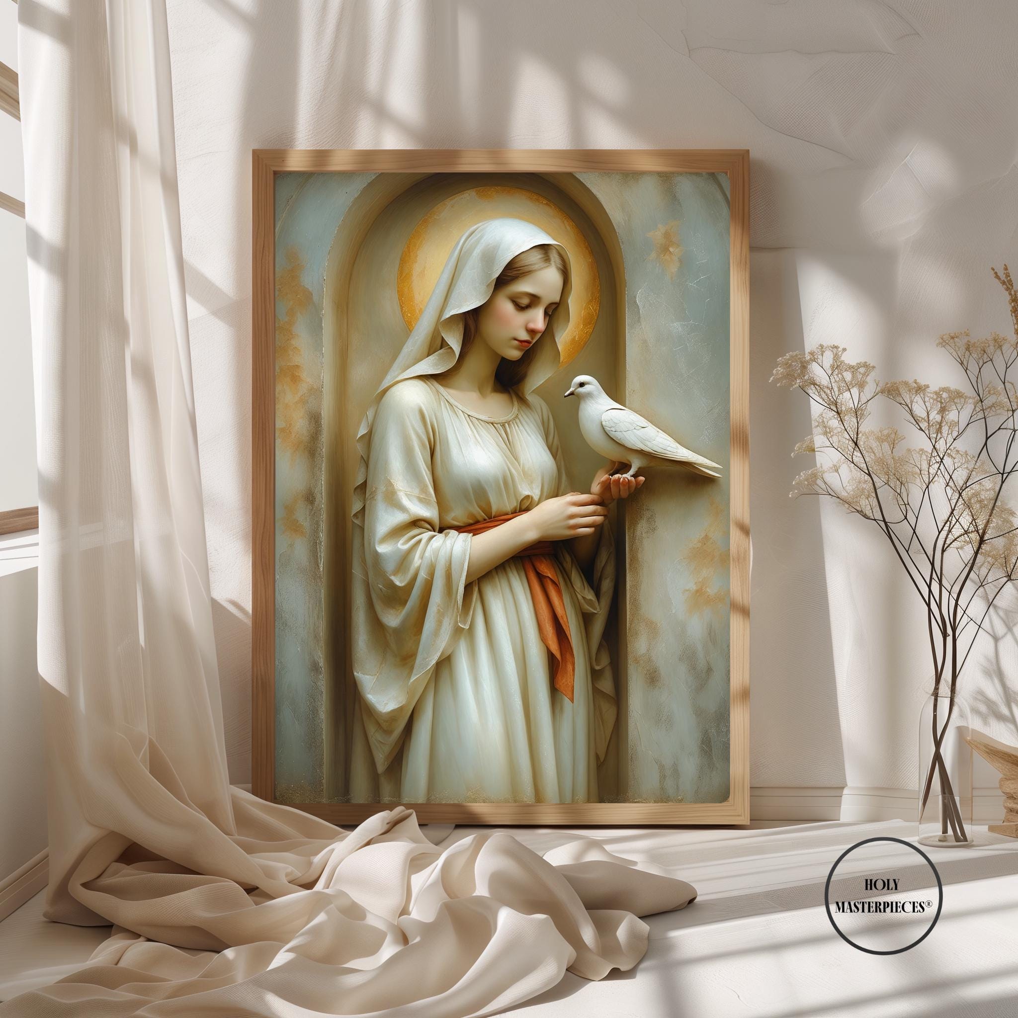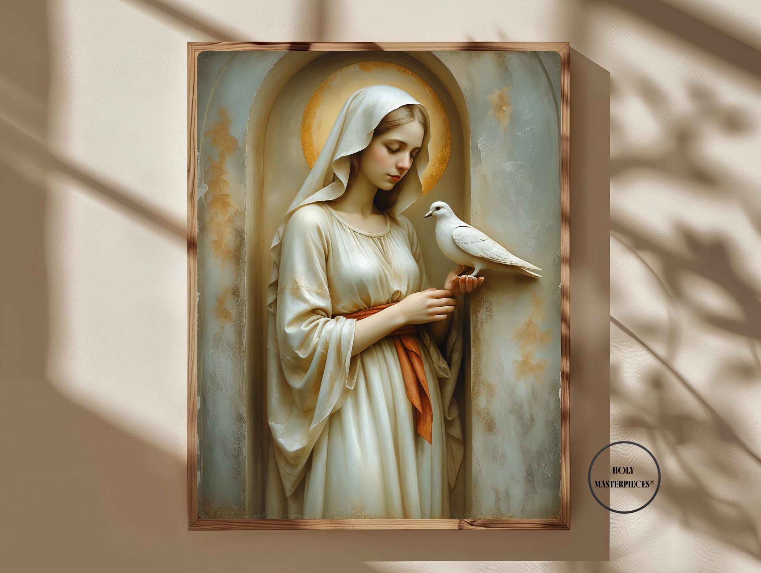 This devotional artwork presents the Blessed Virgin shown in gentle stillness as a white dove rests softly upon her hand. Her head is inclined downward, her gaze calm and contemplative, expressing quiet receptivity and peace. The dove, symbol of the Holy Spirit, purity, and divine presence, is rendered with delicate restraint, emphasizing harmony rather than motion or narrative action.