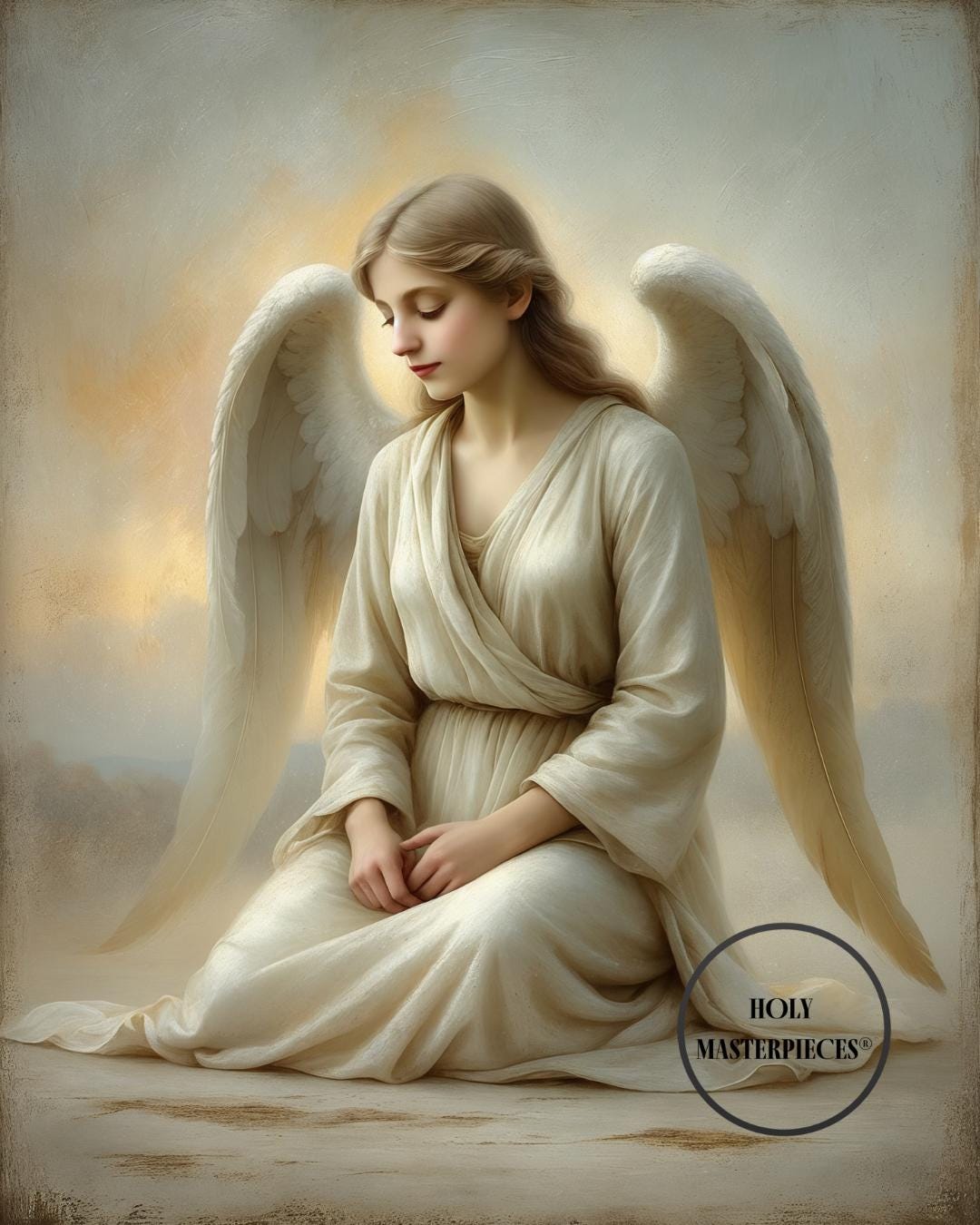 Soft ivory robes fall in natural, flowing folds enriched with delicate oil-textured brushwork and subtle tonal variation. The wings curve gracefully behind the figure, framing her without dominating the composition. A warm halo of early morning light radiates softly around her head, blending seamlessly into the muted sky and reinforcing the sense of divine quiet.