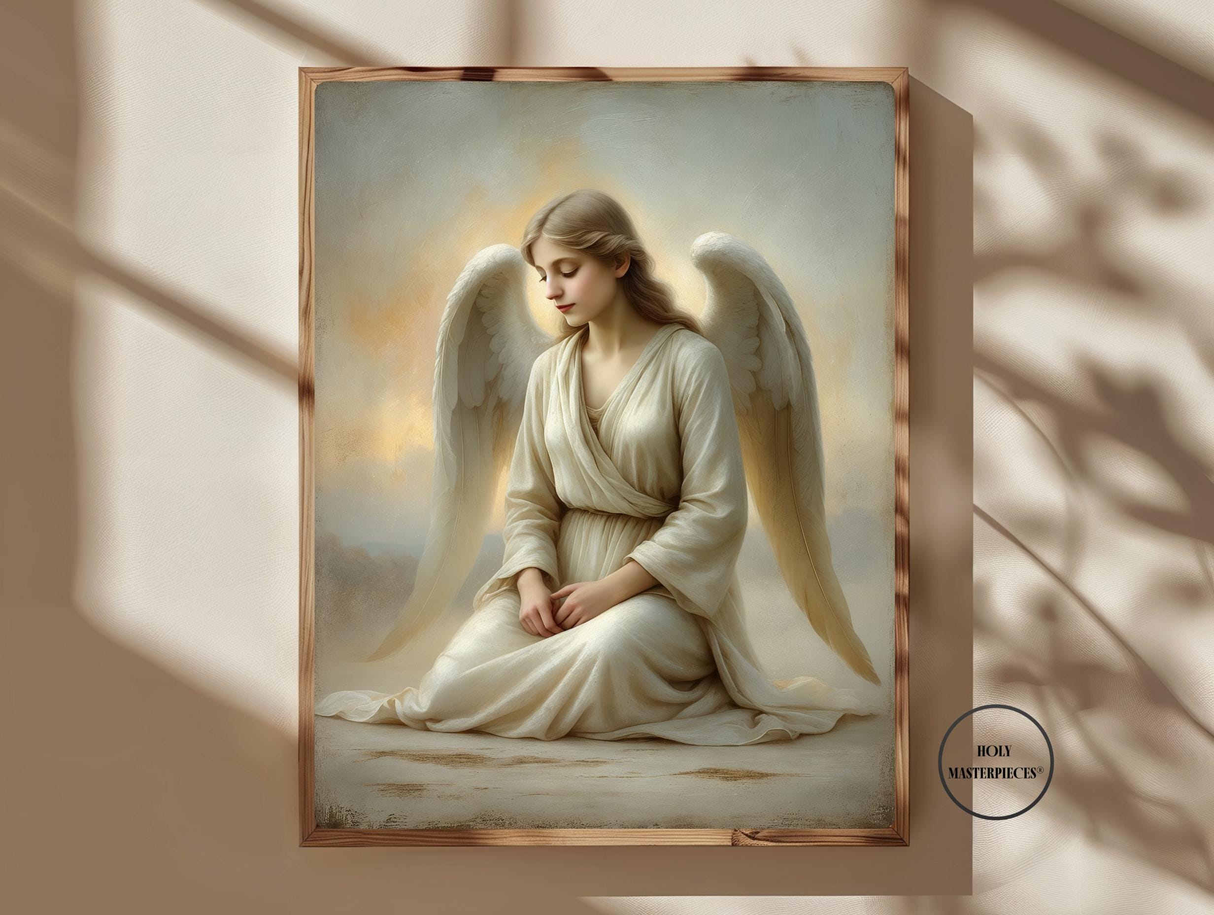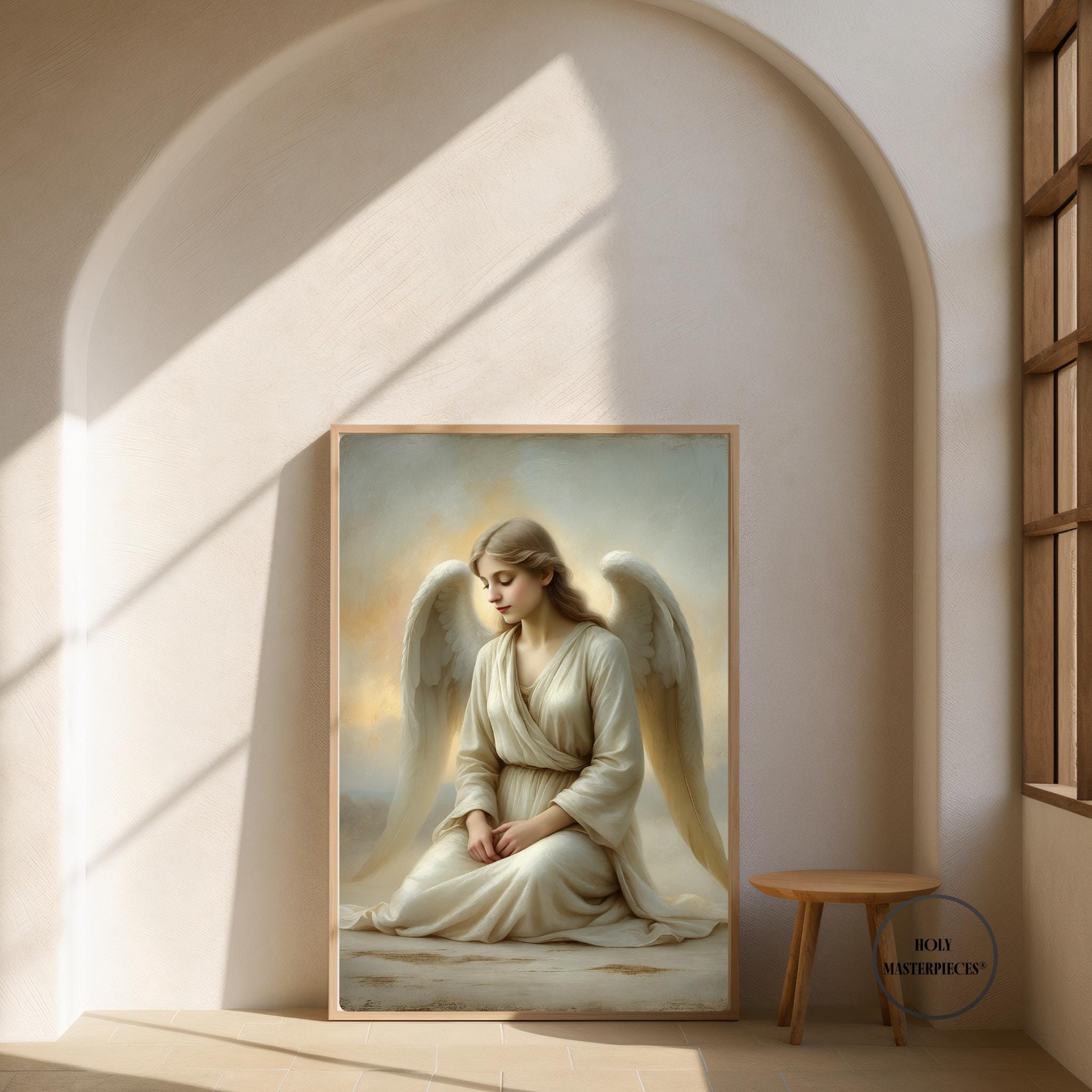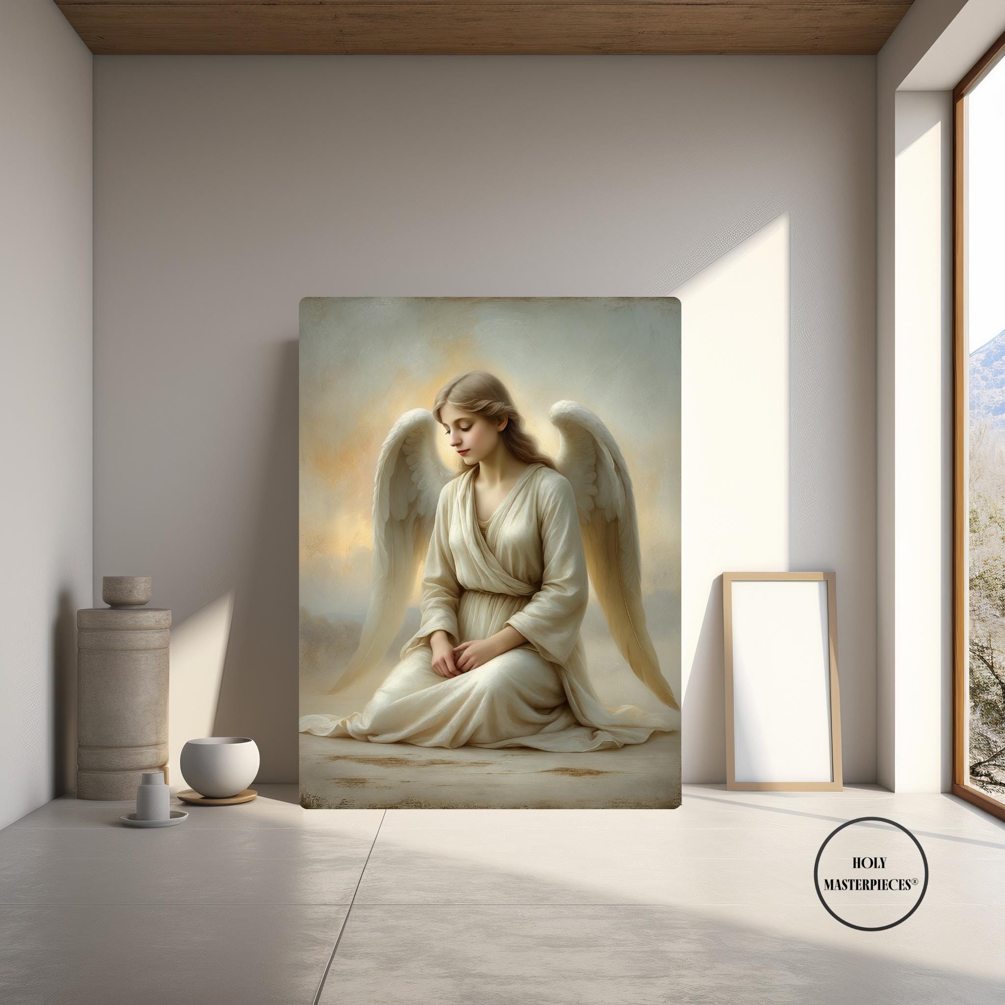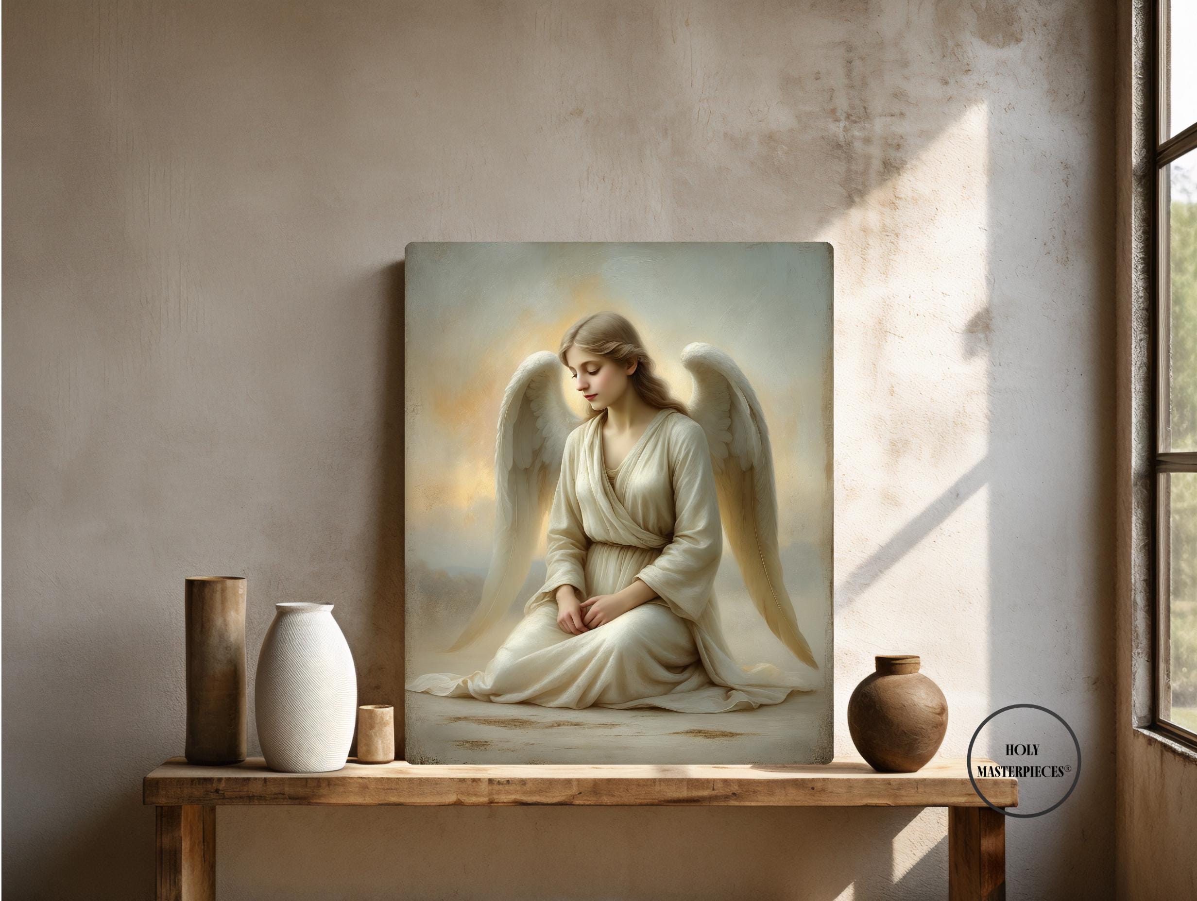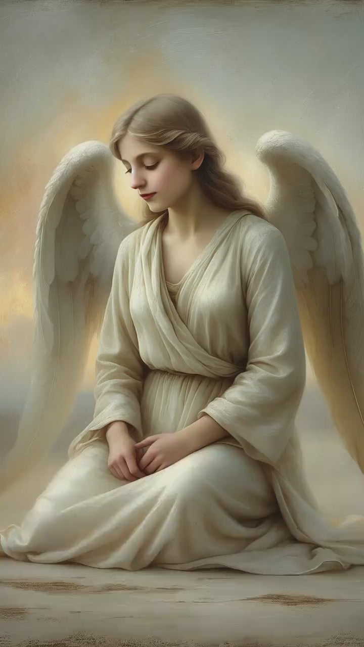 Angel at Dawn depicts a serene angel seated in quiet stillness as first light gently breaks around her. With head bowed and hands resting softly in her lap, the figure conveys humility, peace, and contemplative devotion. There is no dramatic movement — only calm presence — capturing the sacred stillness associated with the beginning of a new day. This refined Catholic angel wall art piece is designed to bring gentle reassurance and prayerful atmosphere into the home.