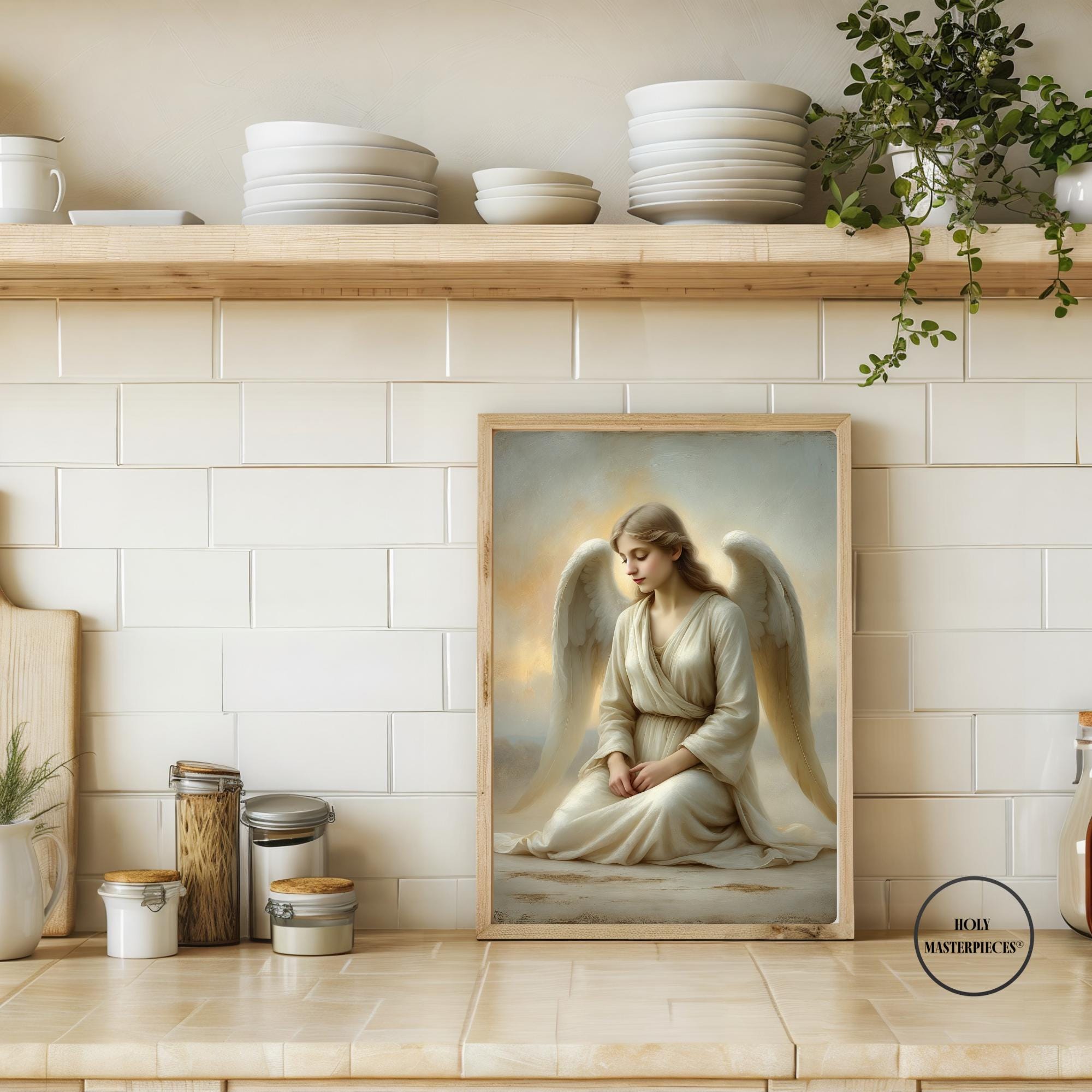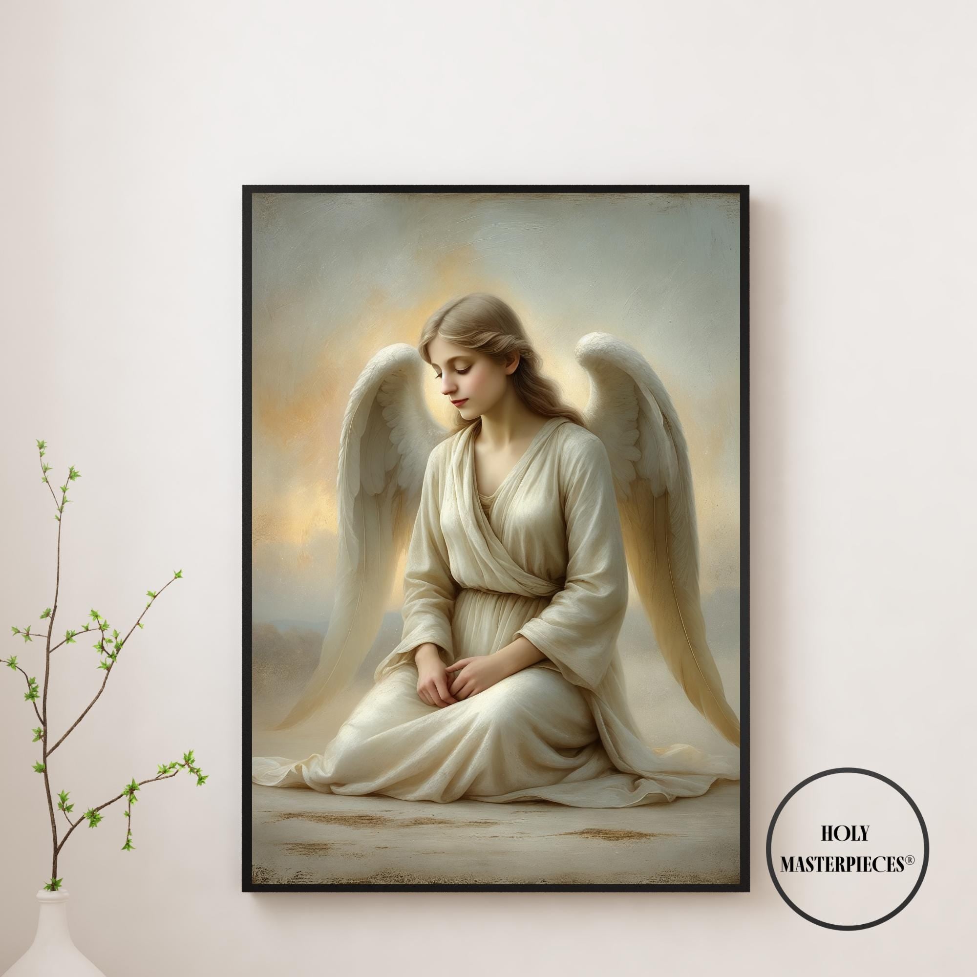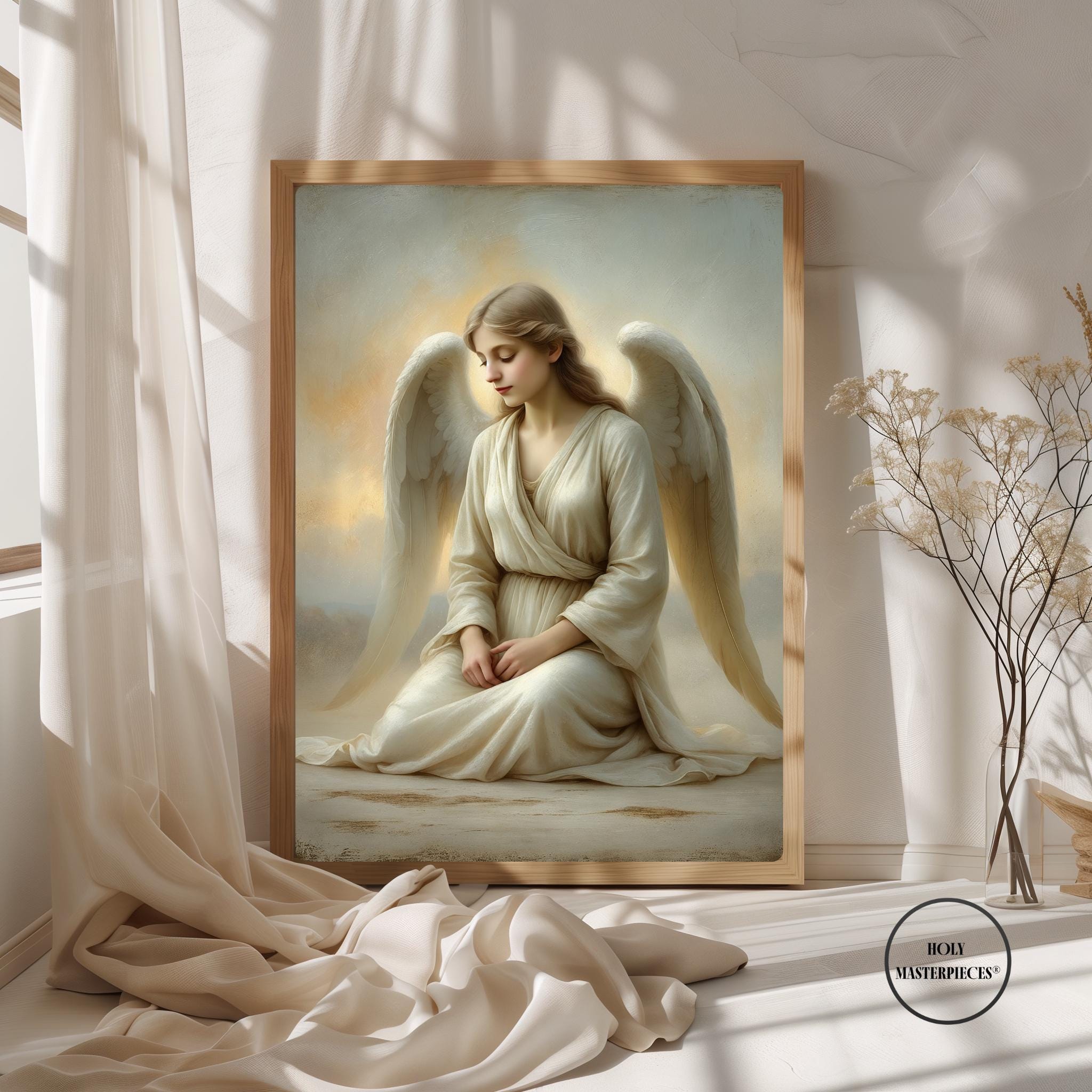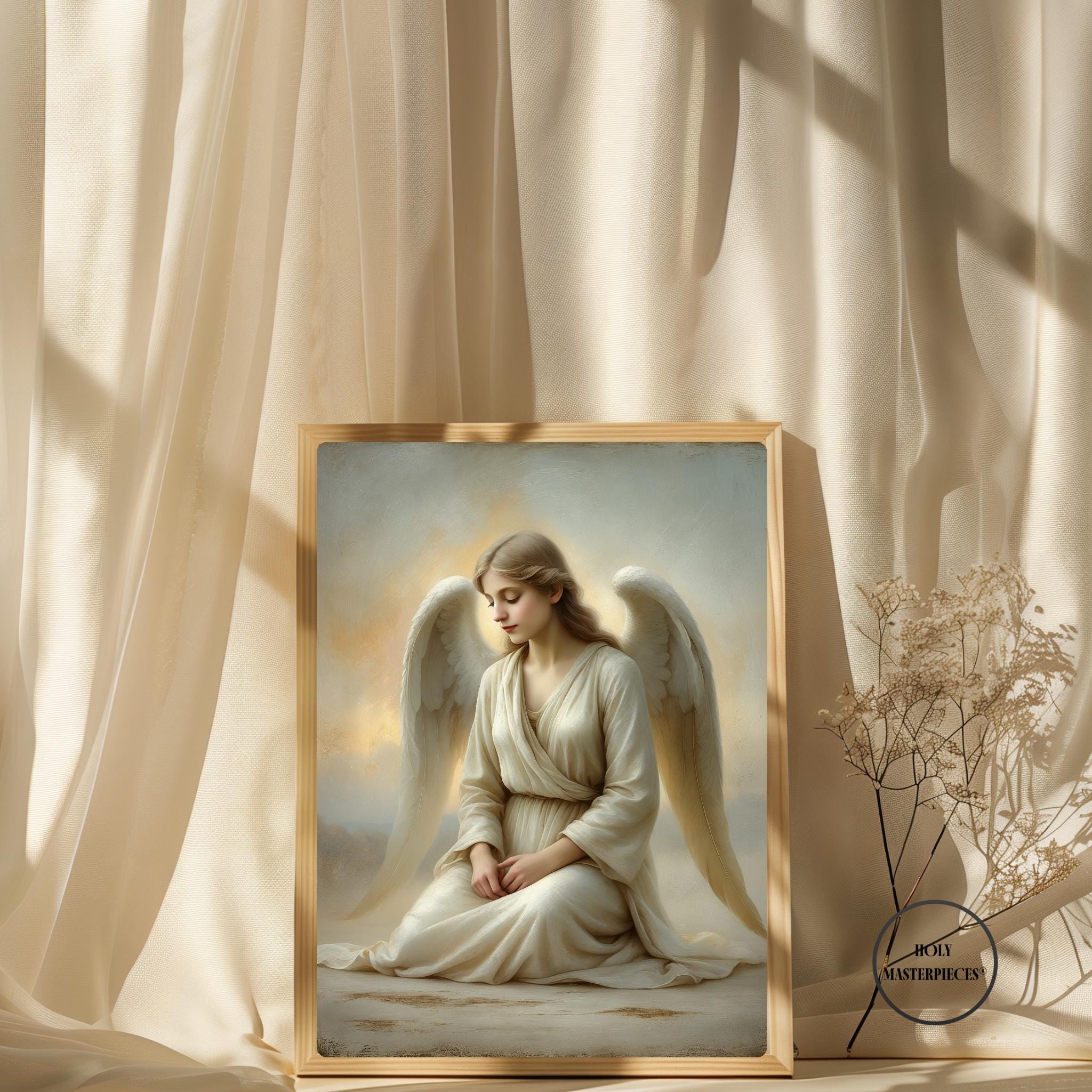 Angel at Dawn depicts a serene angel seated in quiet stillness as first light gently breaks around her. With head bowed and hands resting softly in her lap, the figure conveys humility, peace, and contemplative devotion. There is no dramatic movement — only calm presence — capturing the sacred stillness associated with the beginning of a new day. This refined Catholic angel wall art piece is designed to bring gentle reassurance and prayerful atmosphere into the home.