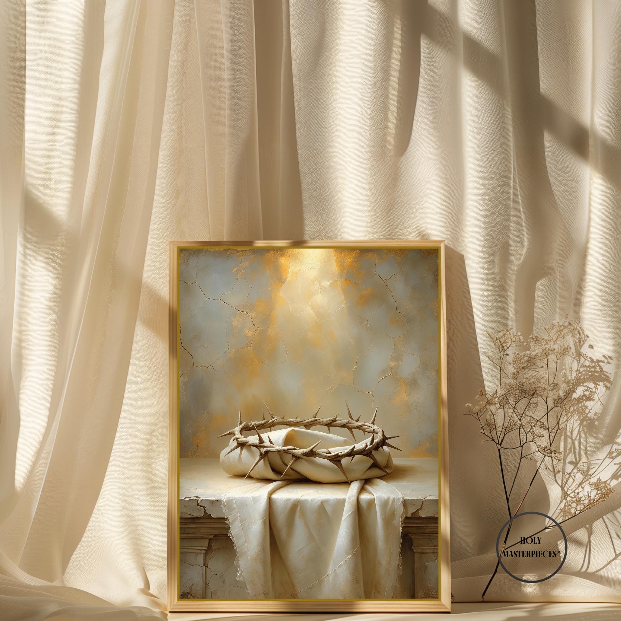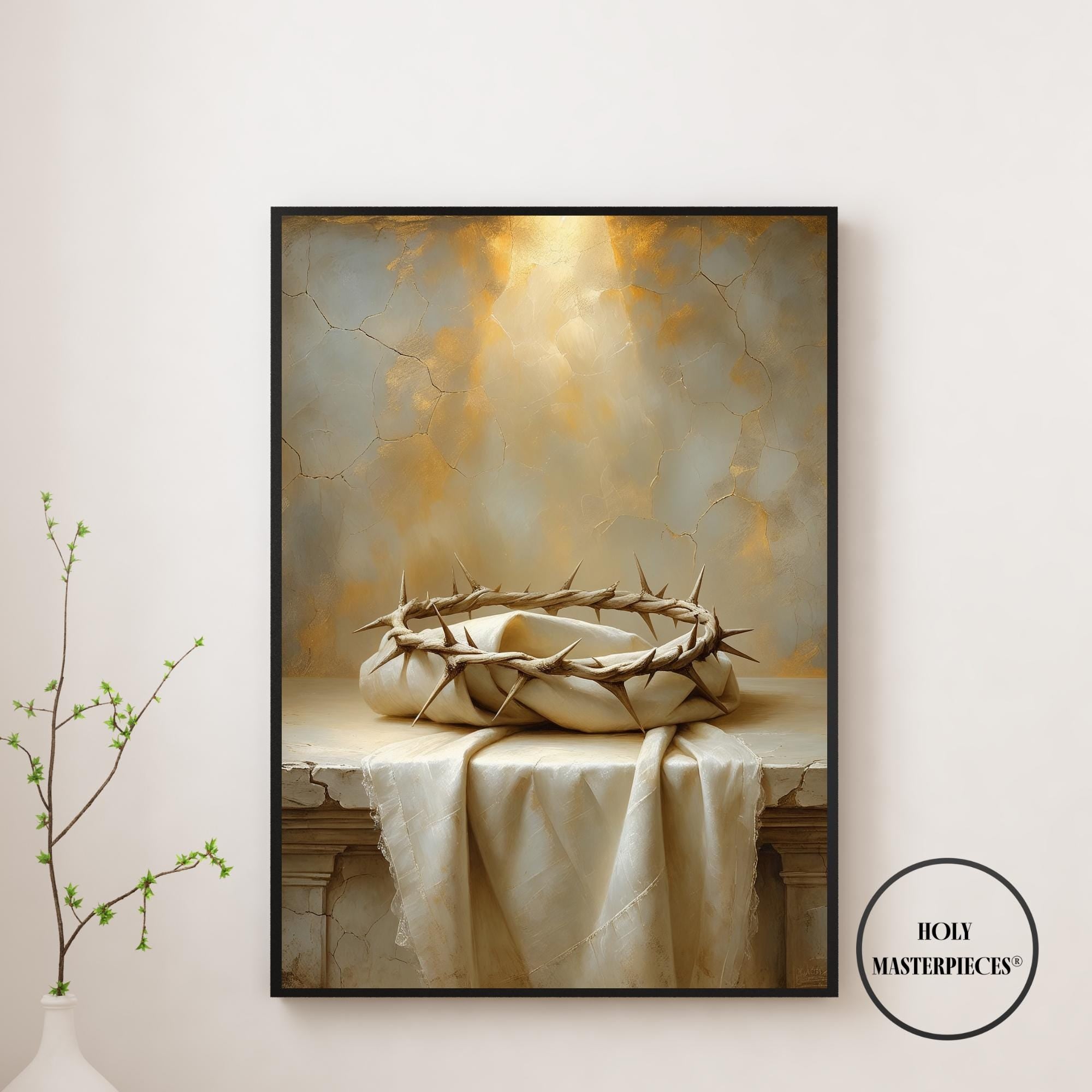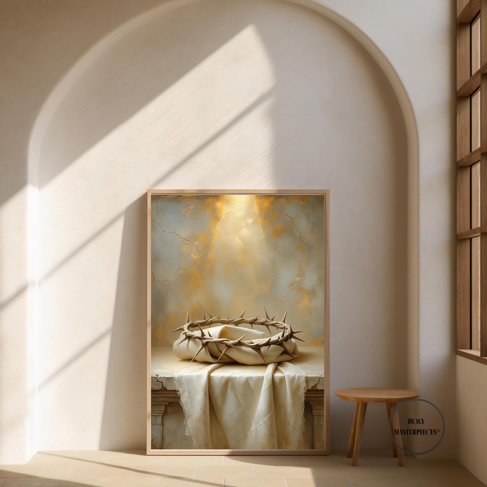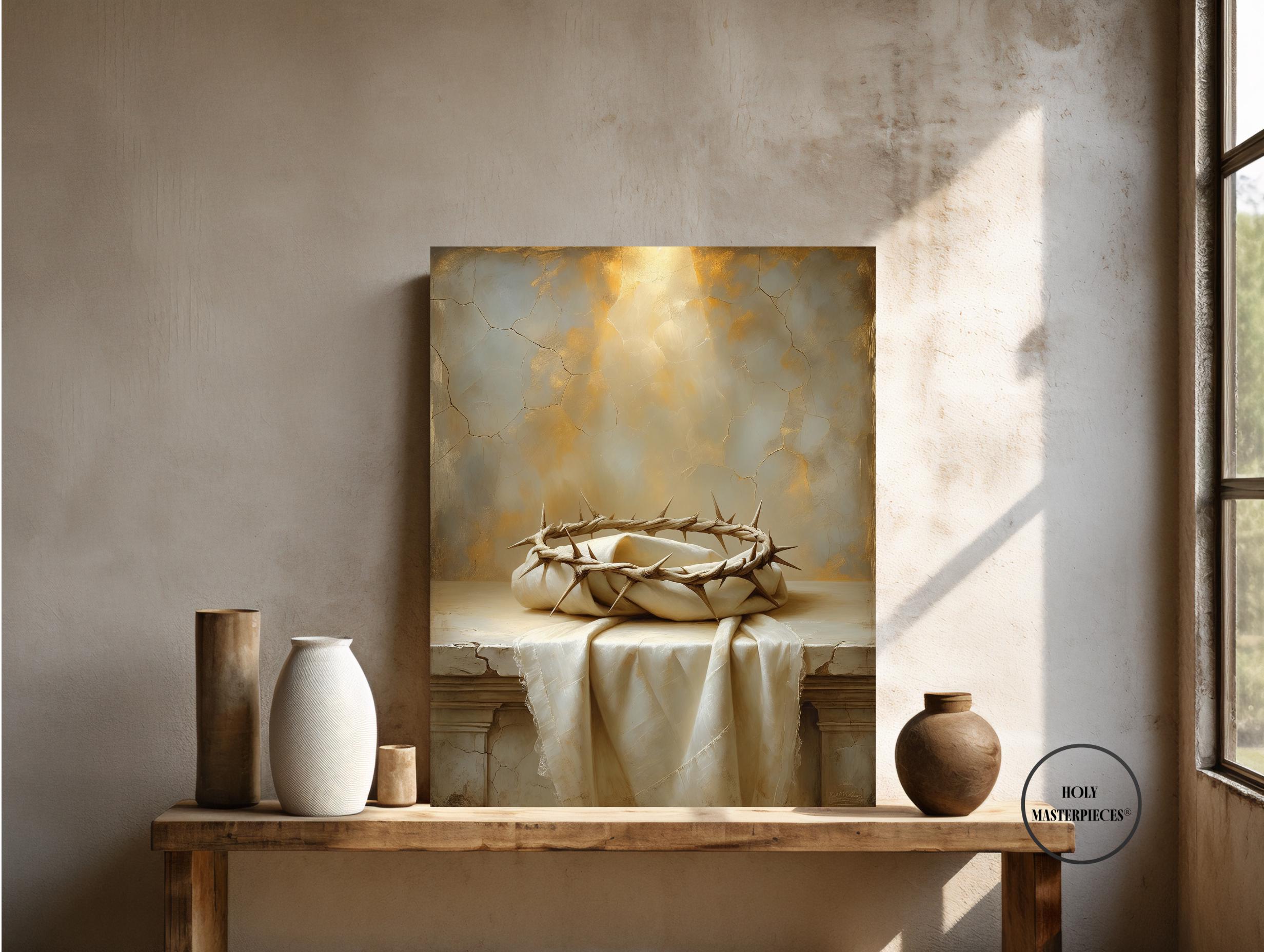 This artwork features a simple crown of thorns resting on folded ivory linen, illuminated by warm, diffused light. The composition is quiet and contemplative, designed to invite prayer and reflection. Perfect for Lent, Good Friday, Holy Saturday, and Easter devotion. Ideal for prayer rooms, chapels, Catholic homes, and sacred spaces.