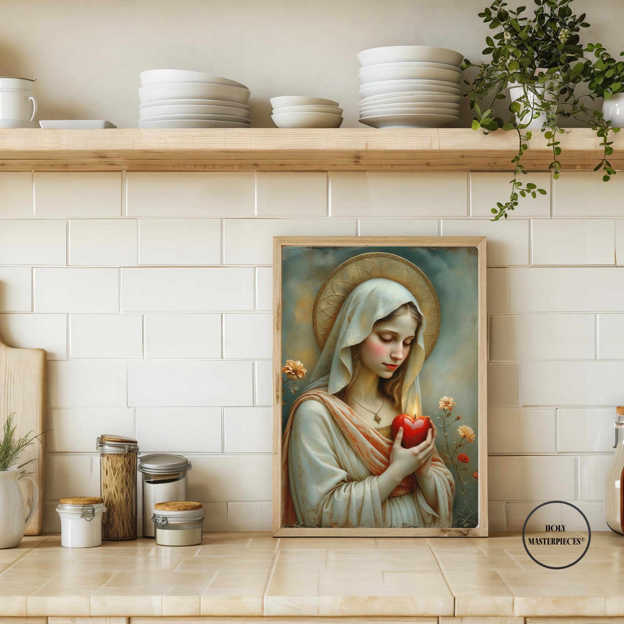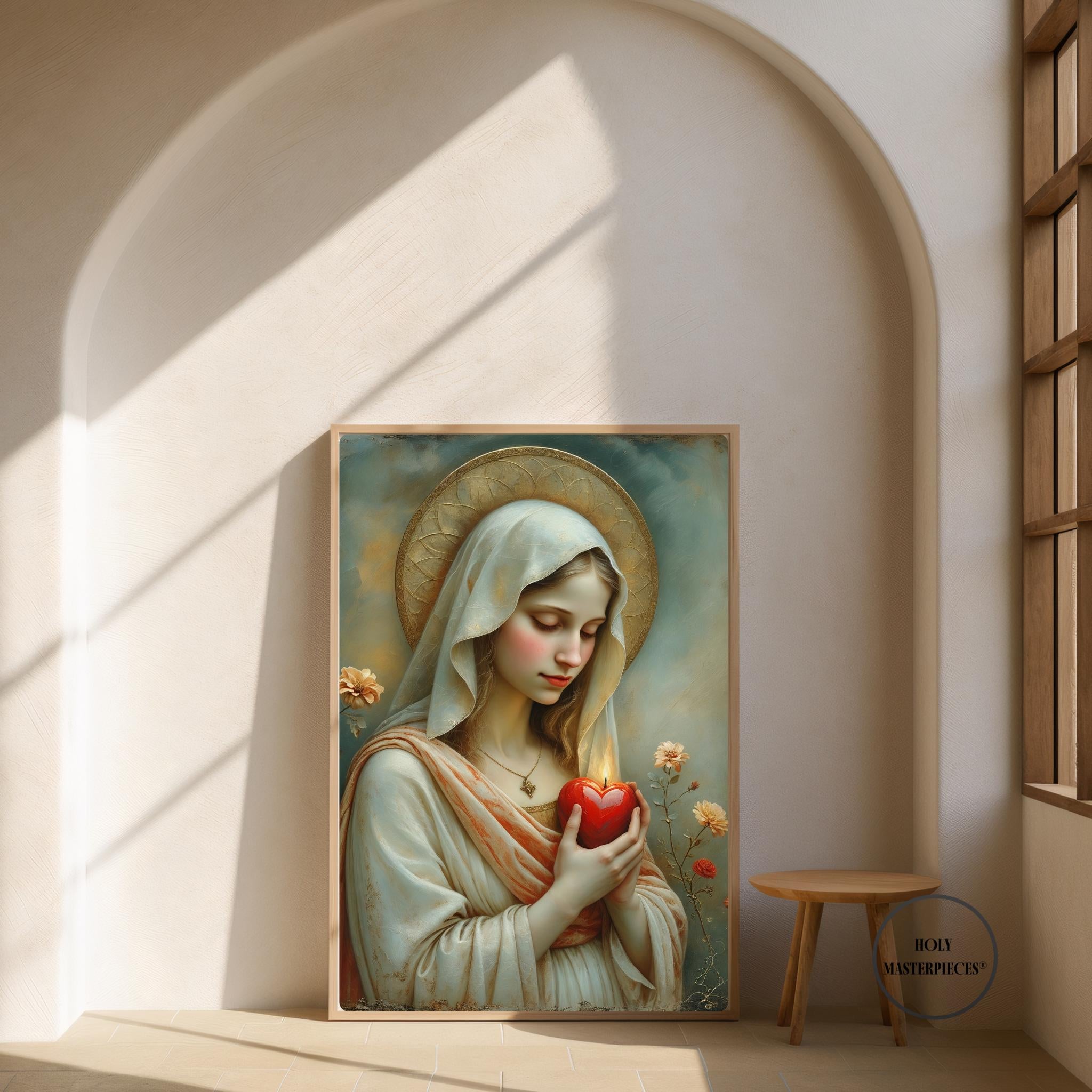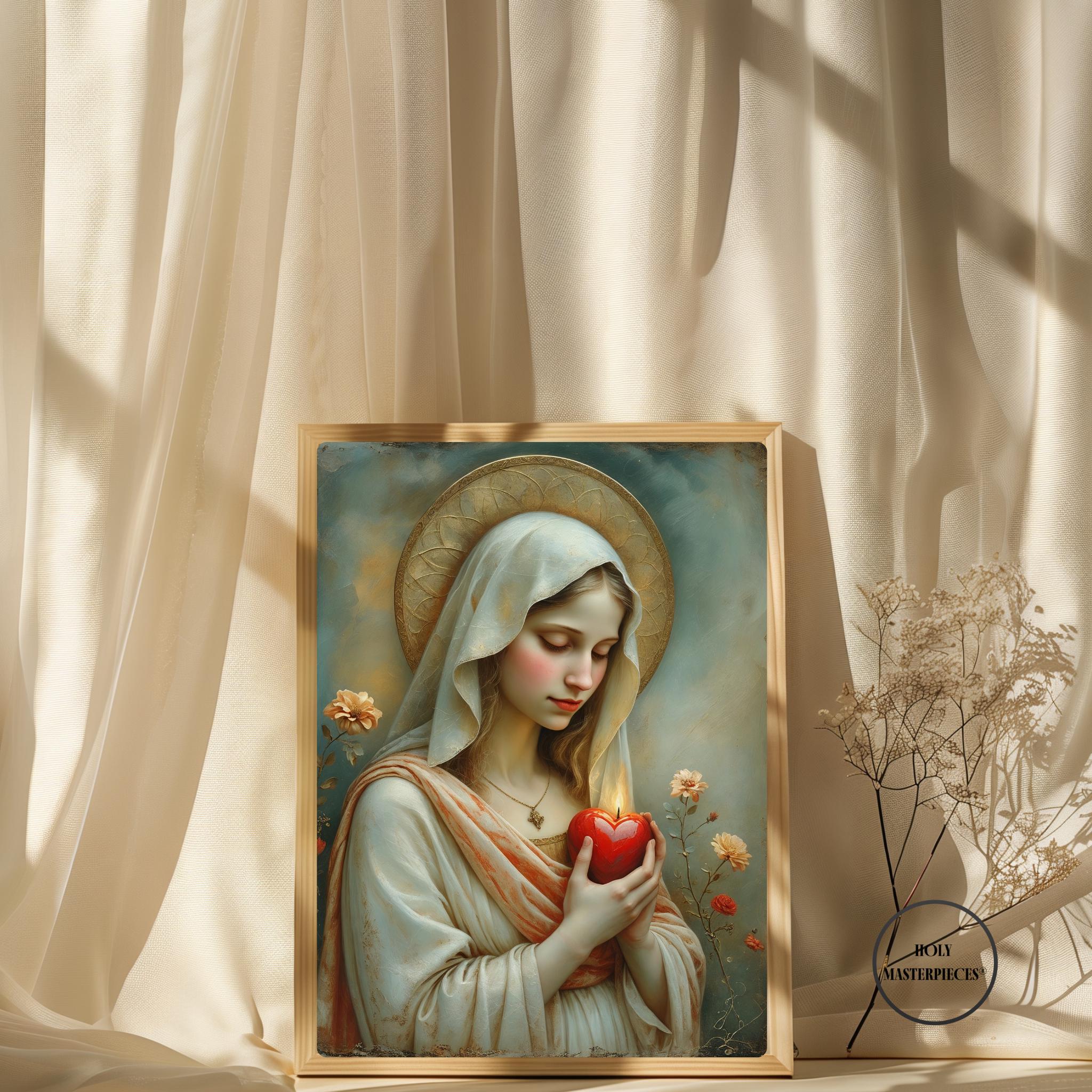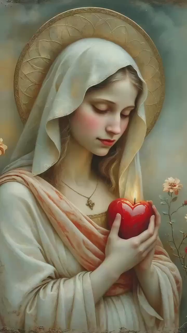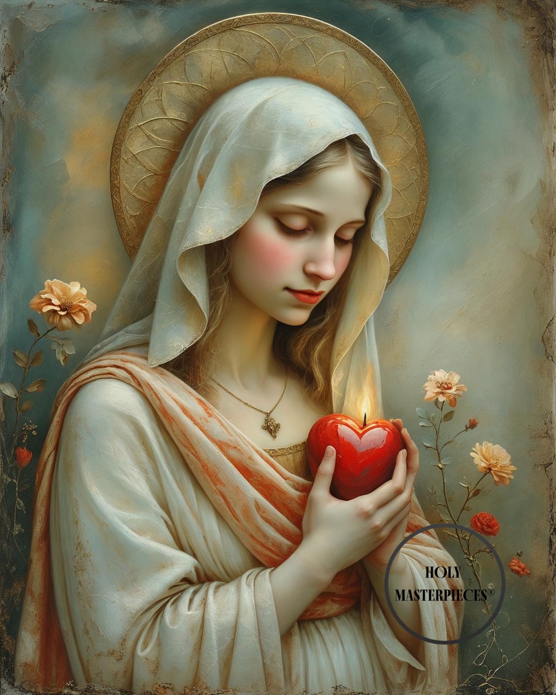 This sacred Marian artwork presents the Blessed Virgin in quiet devotion, gently holding a luminous red heart aflame with divine love. The heart symbolizes Mary’s pure and faithful union with God, her sorrowful compassion, and her burning charity offered silently for the salvation of souls. With eyes lowered and posture calm, the image invites contemplation of interior prayer and sacred surrender.