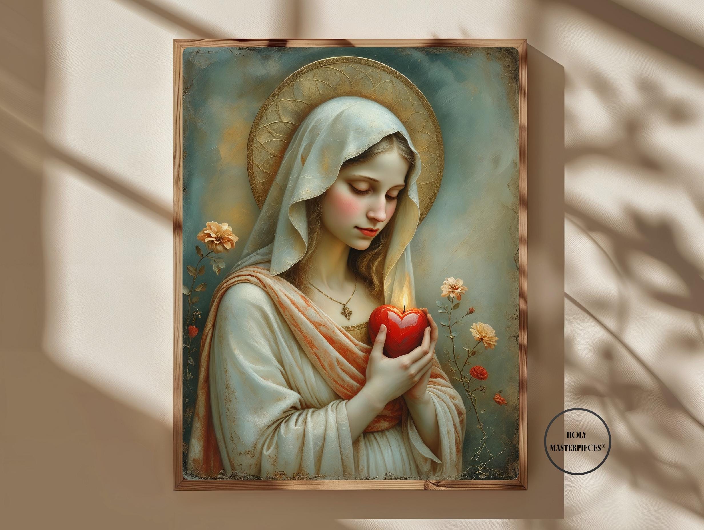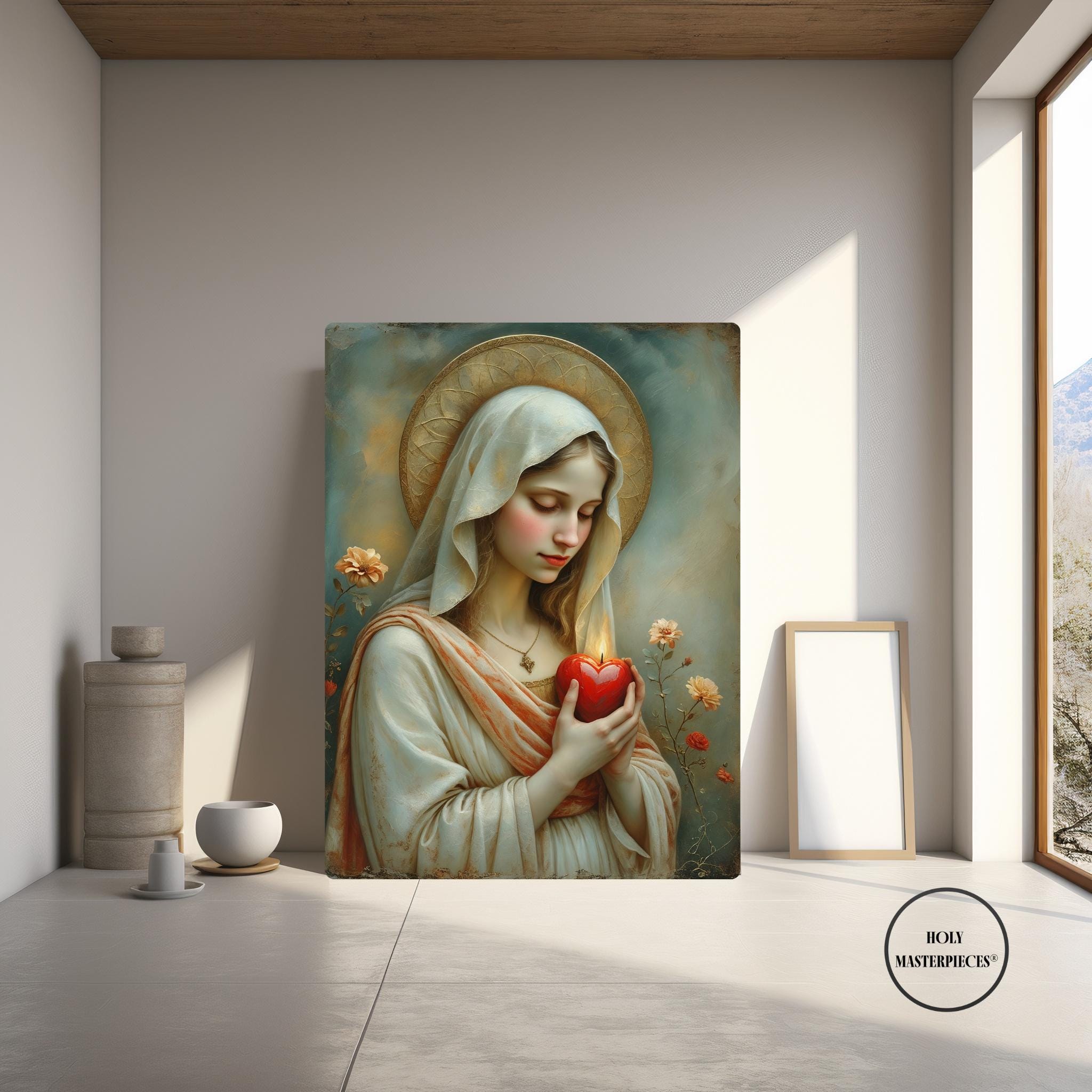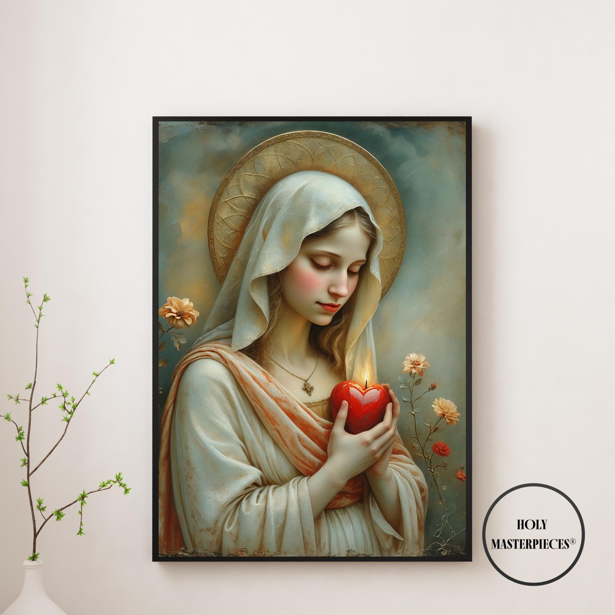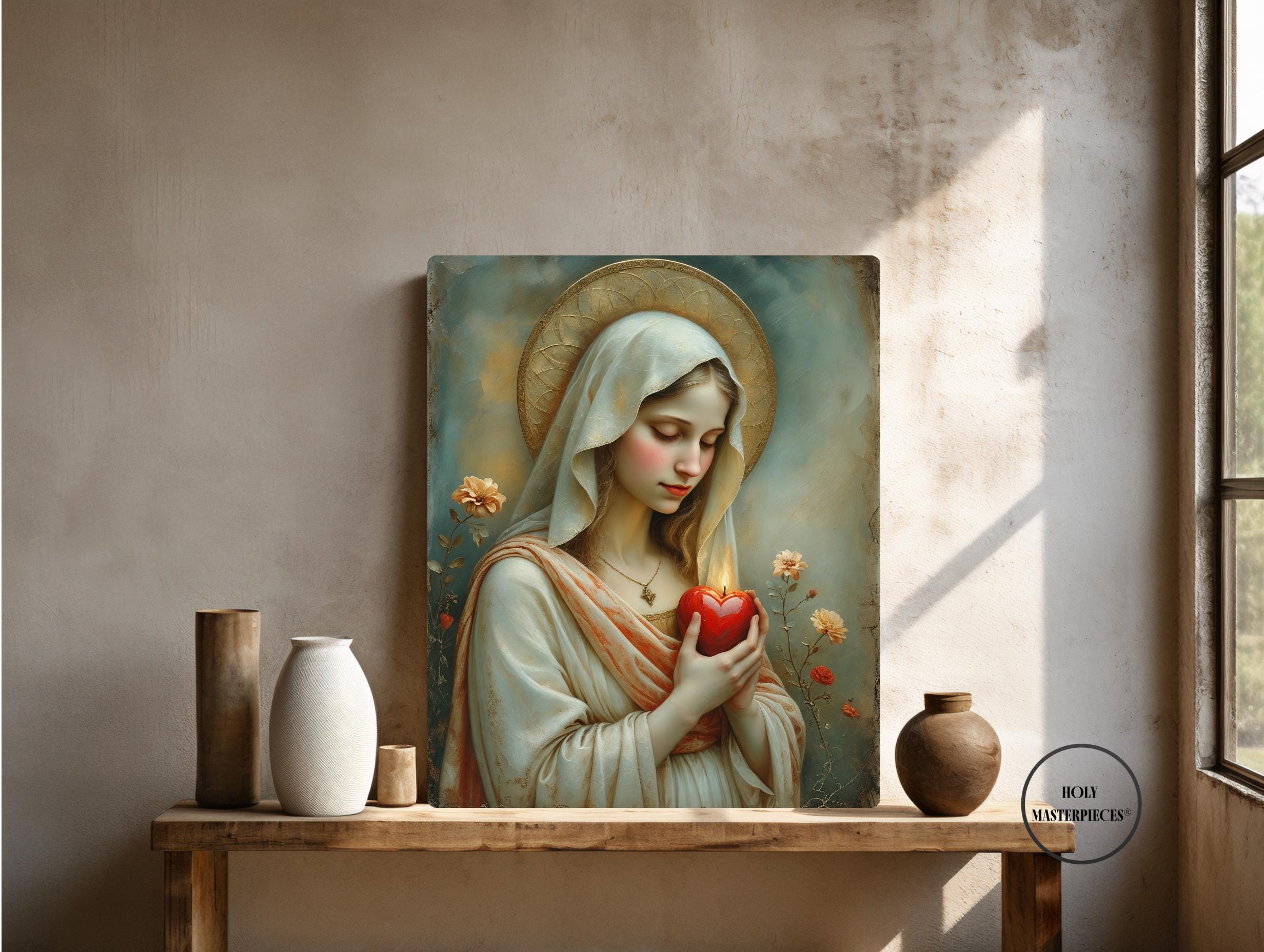 This sacred Marian artwork presents the Blessed Virgin in quiet devotion, gently holding a luminous red heart aflame with divine love. The heart symbolizes Mary’s pure and faithful union with God, her sorrowful compassion, and her burning charity offered silently for the salvation of souls. With eyes lowered and posture calm, the image invites contemplation of interior prayer and sacred surrender.