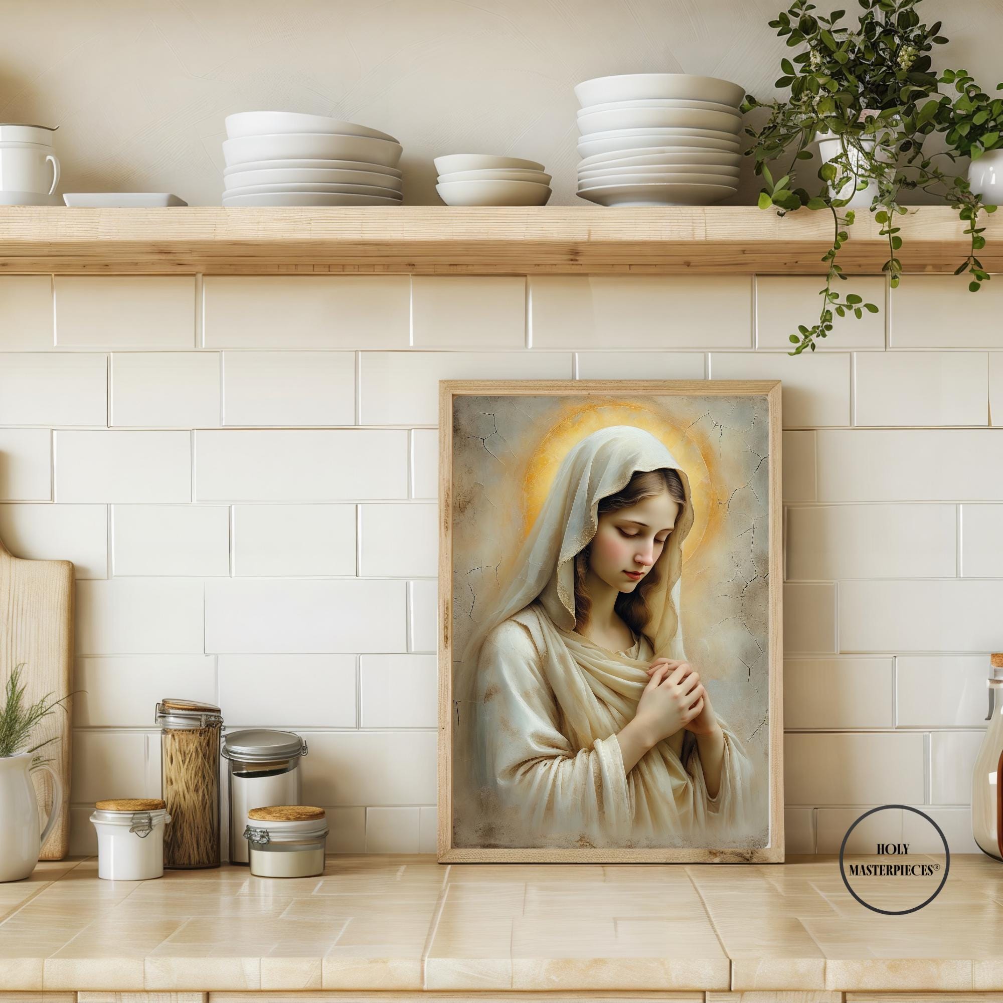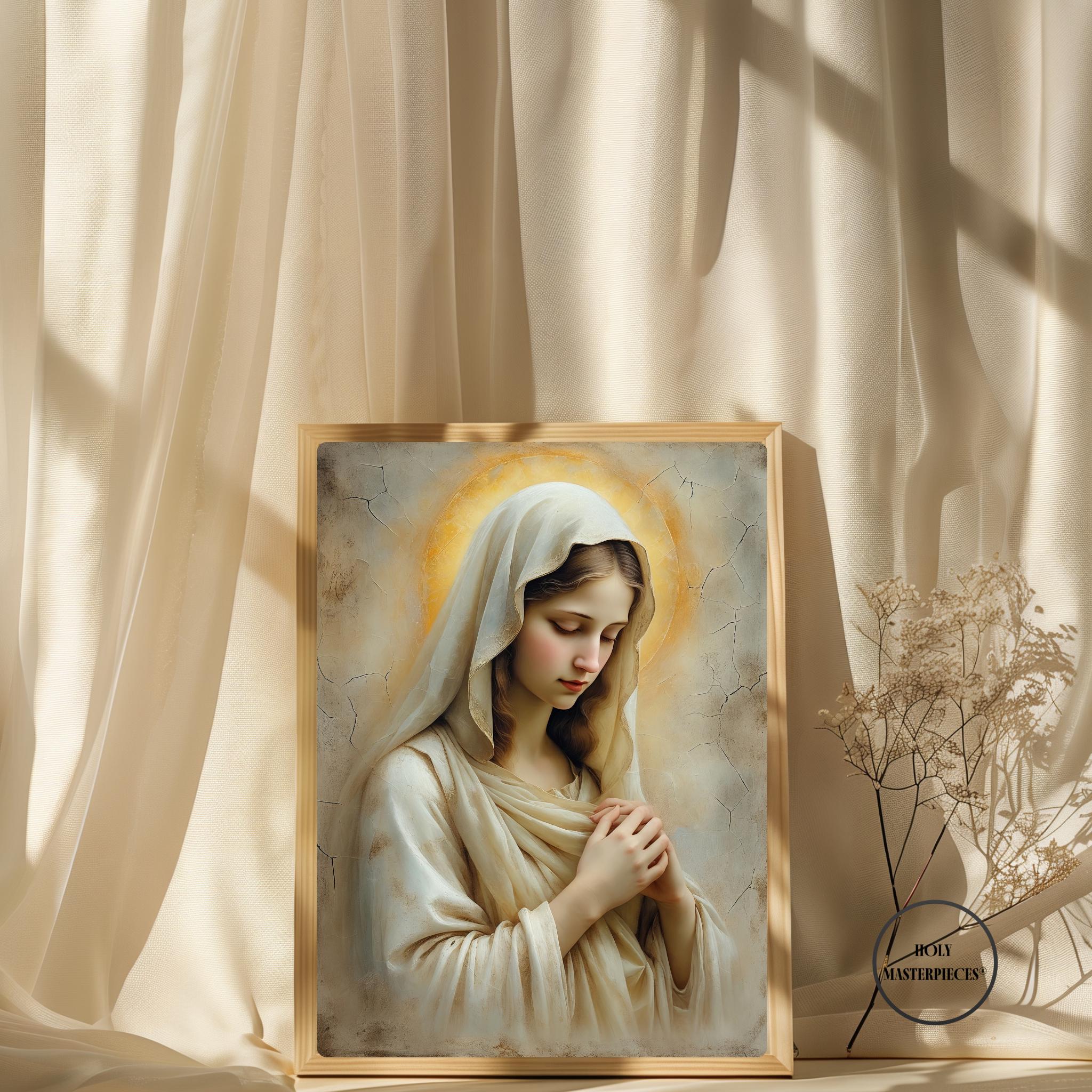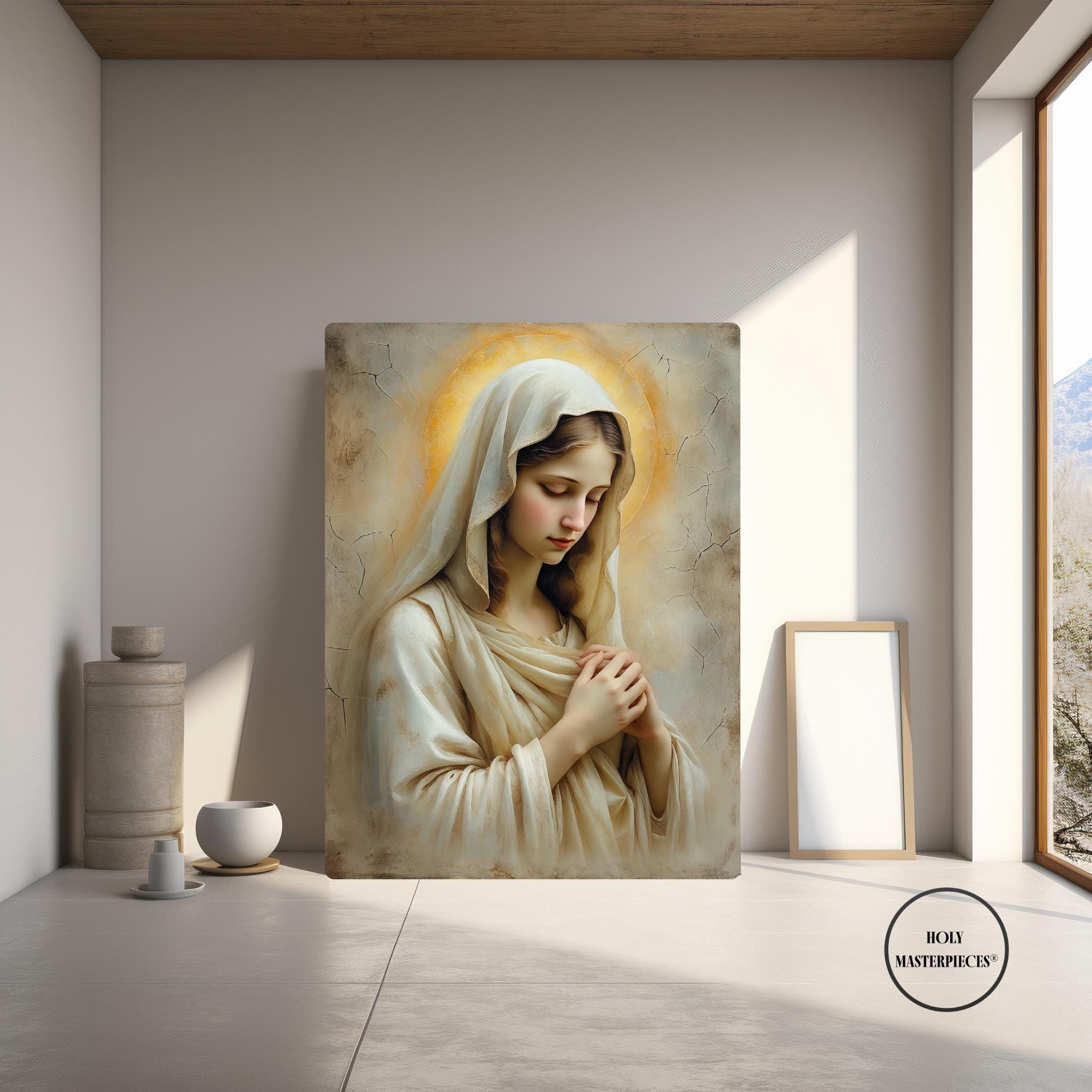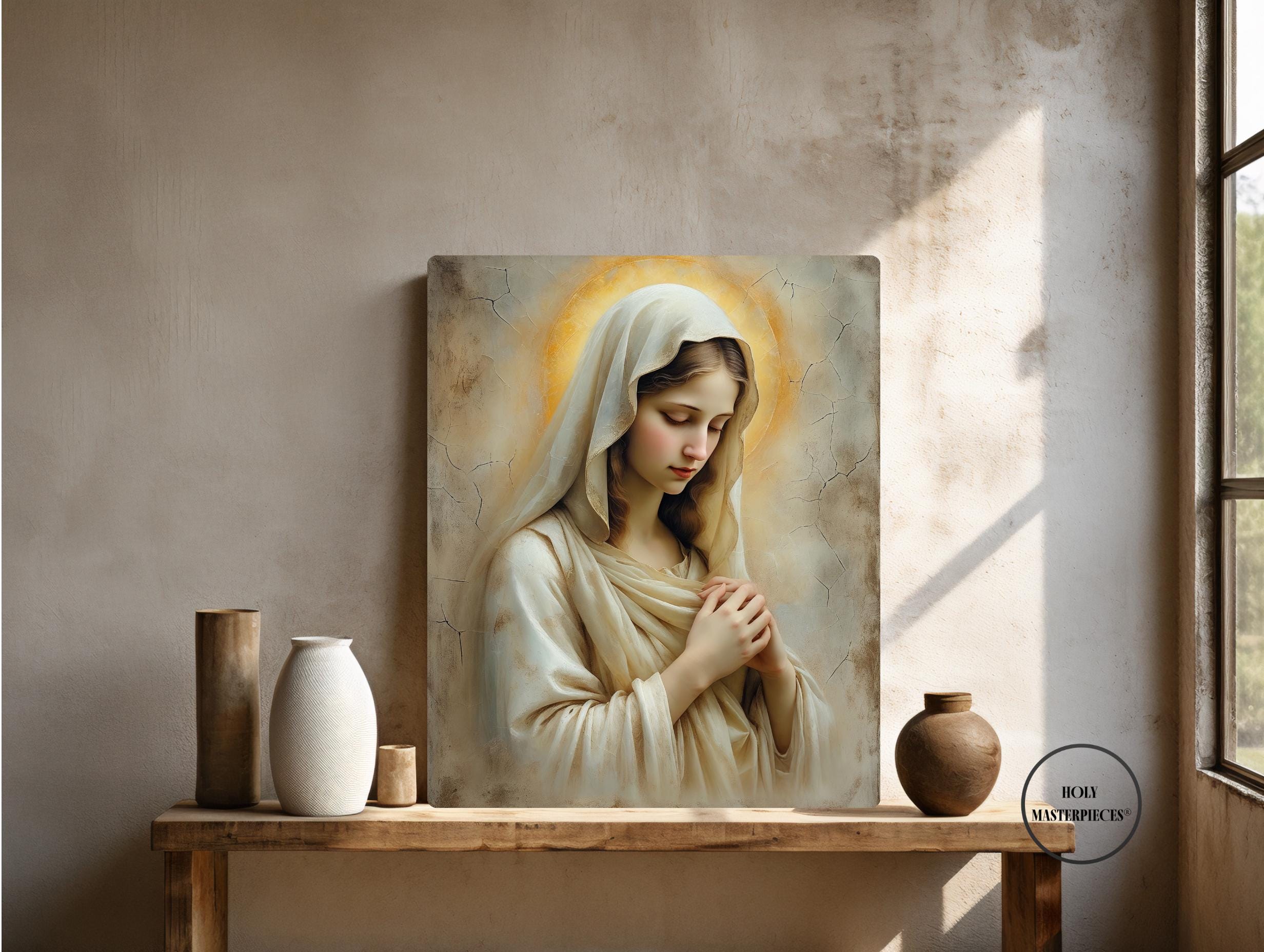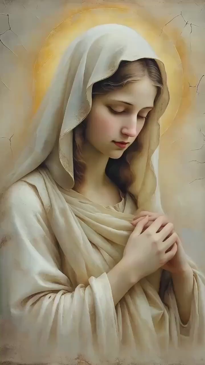 Inspired by the tradition of a classical 17th-century Western sacred oil painting, the composition is rendered with softened edges, a muted palette, and a warm devotional glow. Her veil, painted in delicate ivory tones, rests against an aged cracked-plaster background, while gentle chiaroscuro lighting surrounds her figure in reverent calm. The overall atmosphere is timeless and contemplative, created to support prayer and sacred reflection.