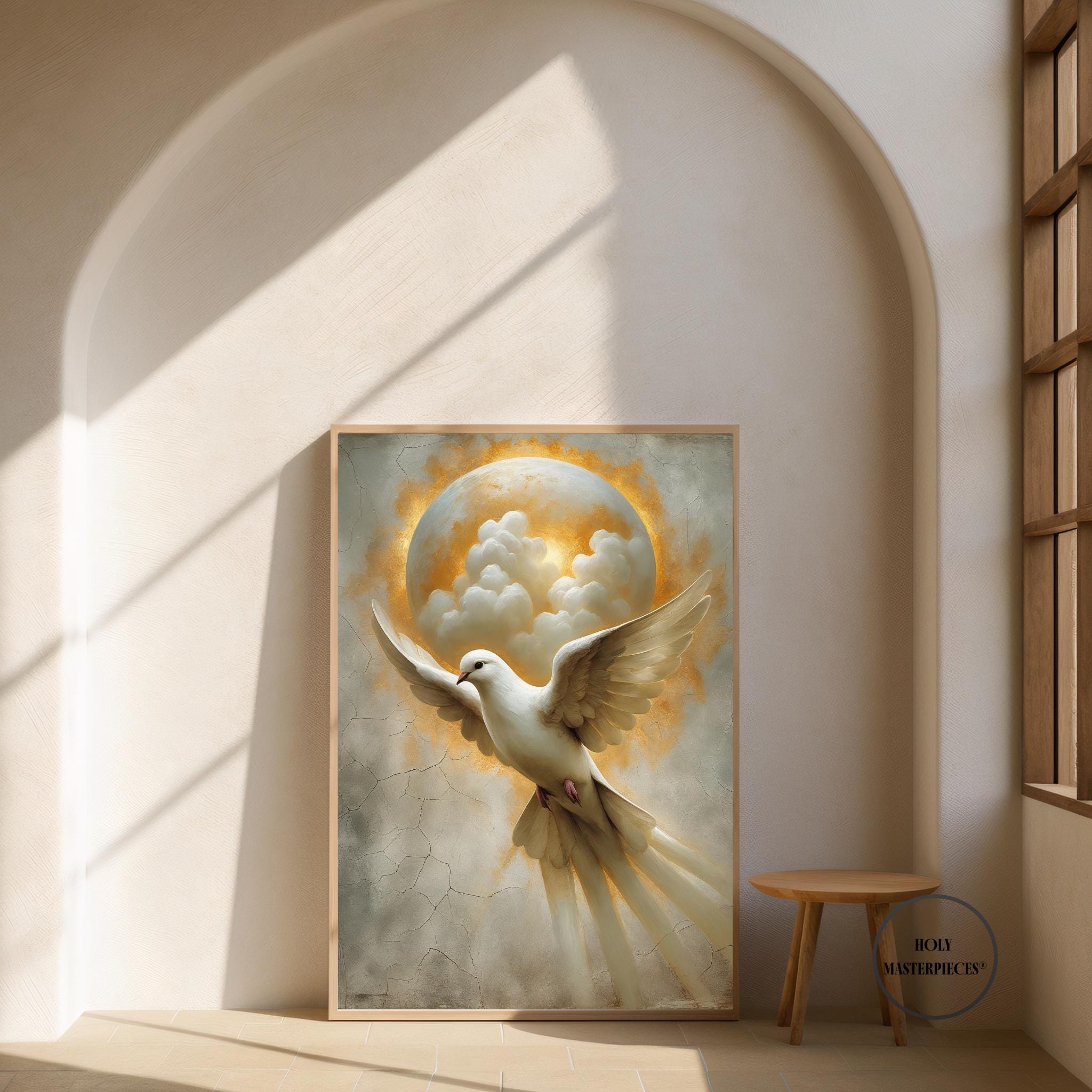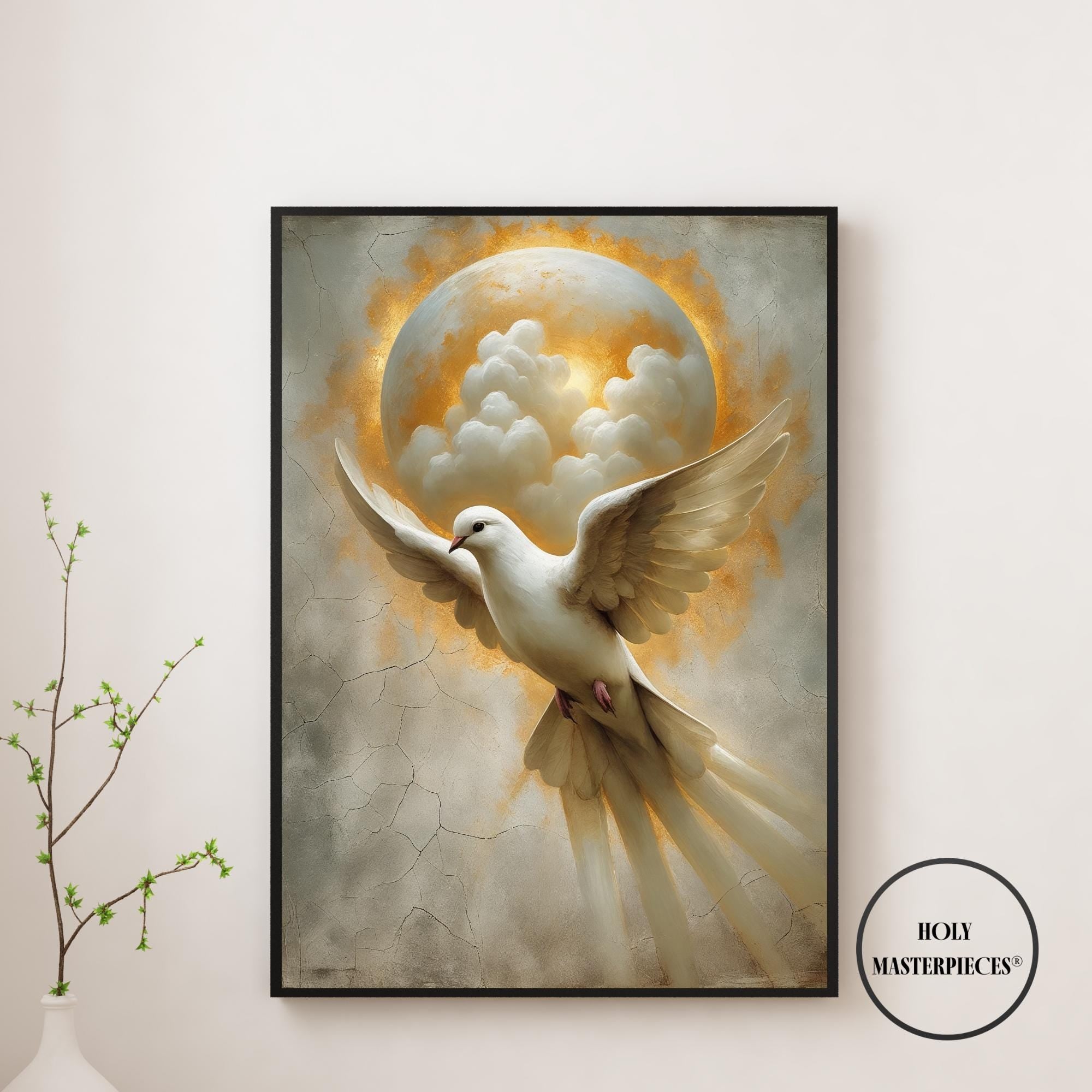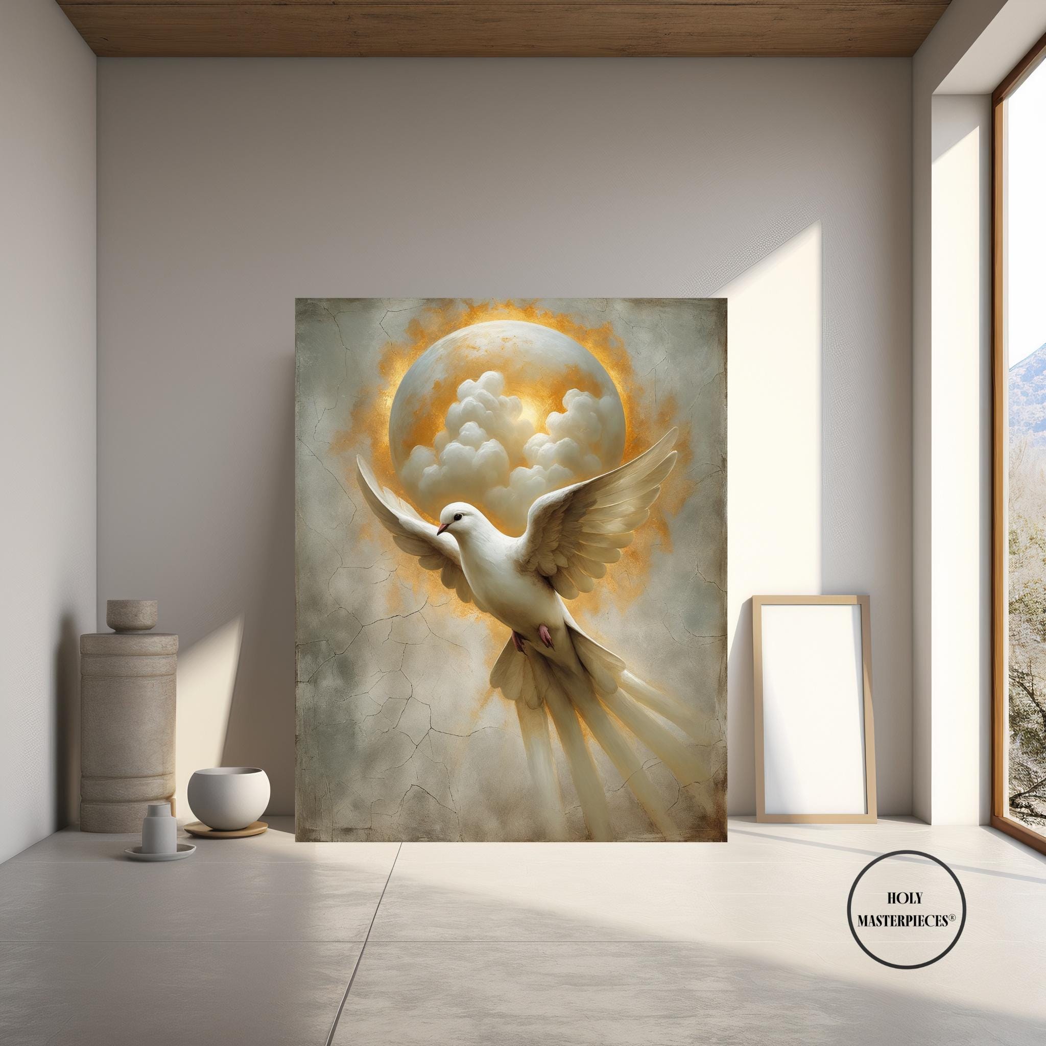 This artwork features a glowing dove descending before an aged cracked-plaster backdrop, rendered in a timeless sacred style perfect for Easter, Pentecost, Confirmation, prayer rooms, chapels, and devotional Christian spaces.
