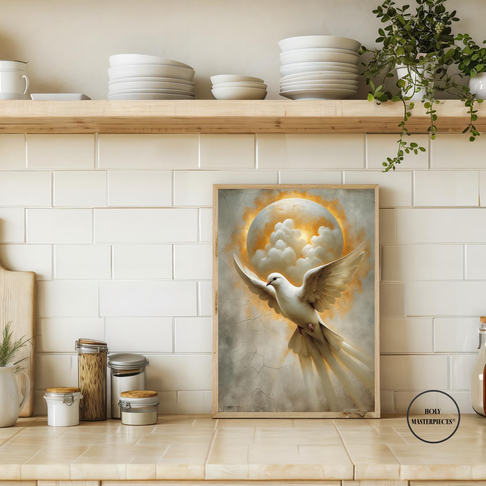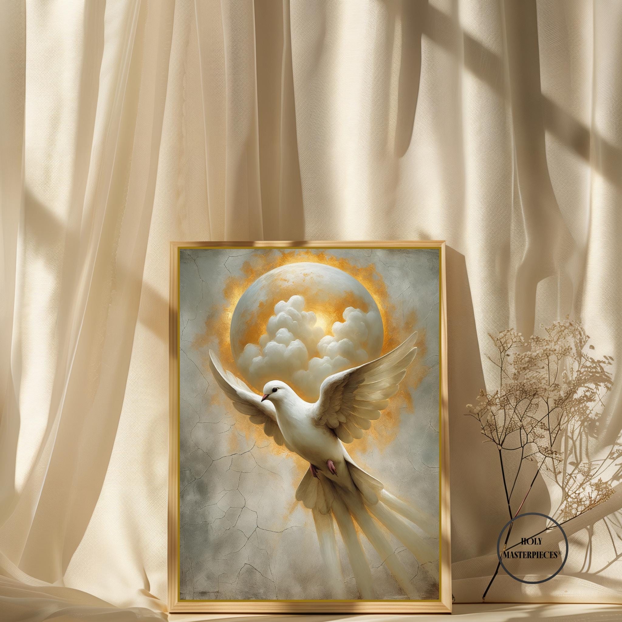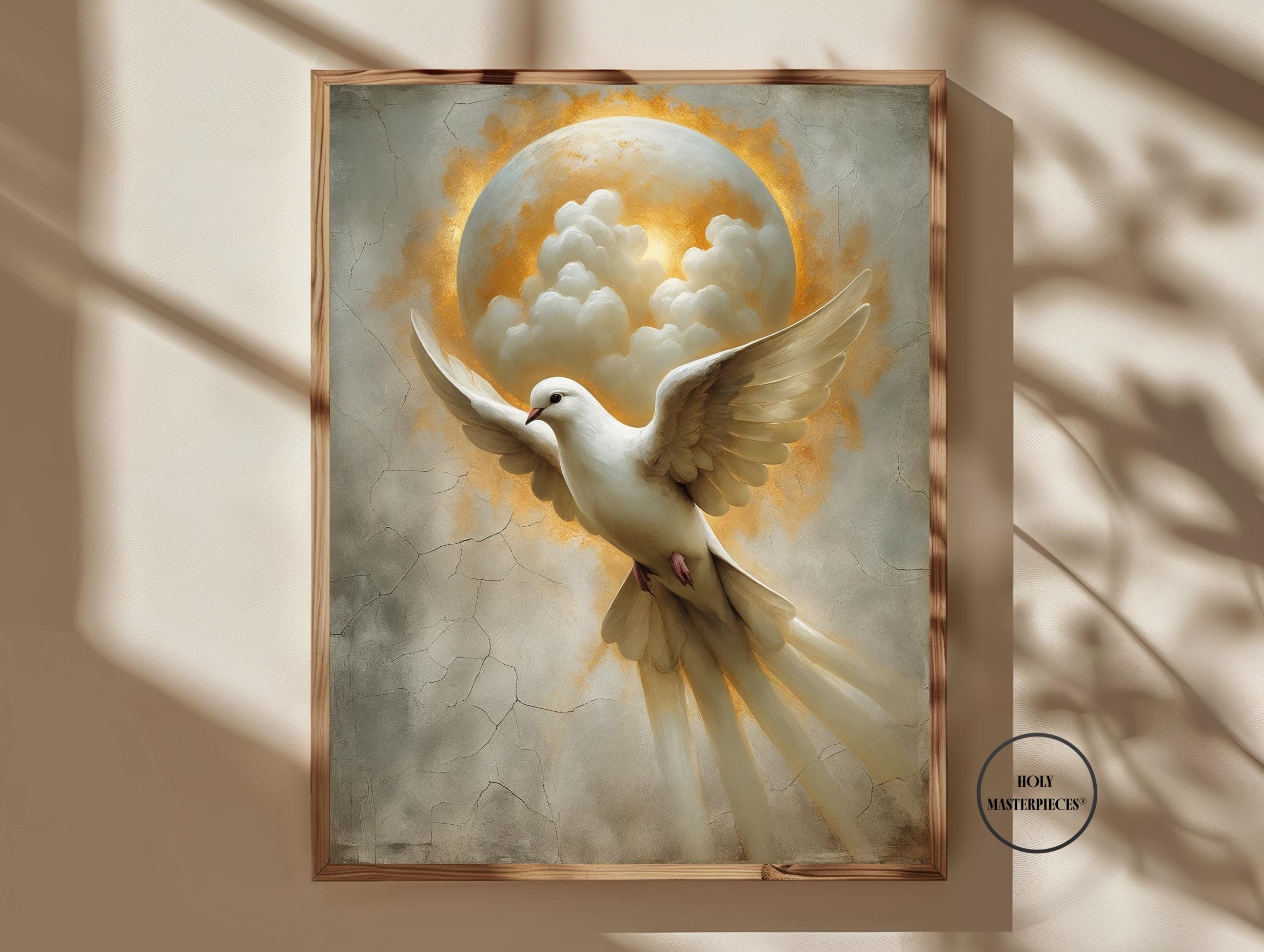 This artwork features a glowing dove descending before an aged cracked-plaster backdrop, rendered in a timeless sacred style perfect for Easter, Pentecost, Confirmation, prayer rooms, chapels, and devotional Christian spaces.