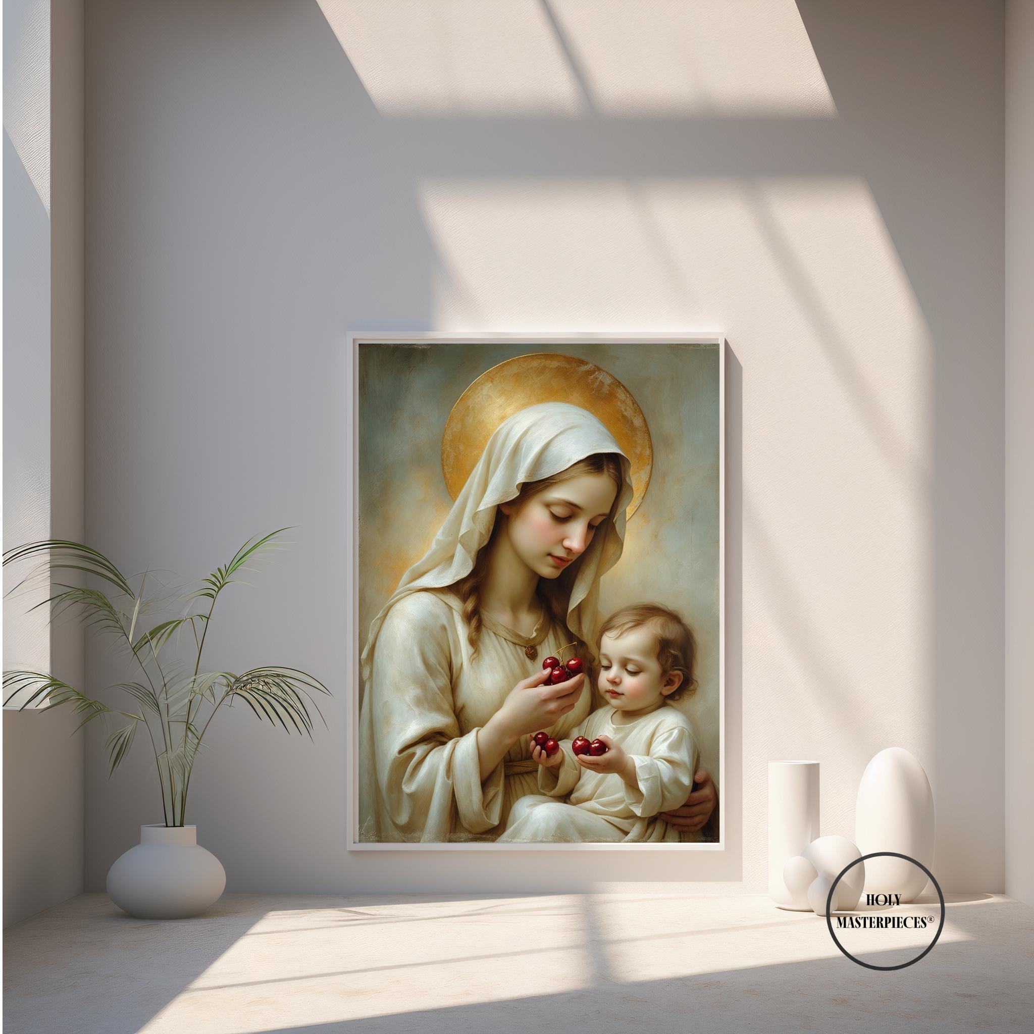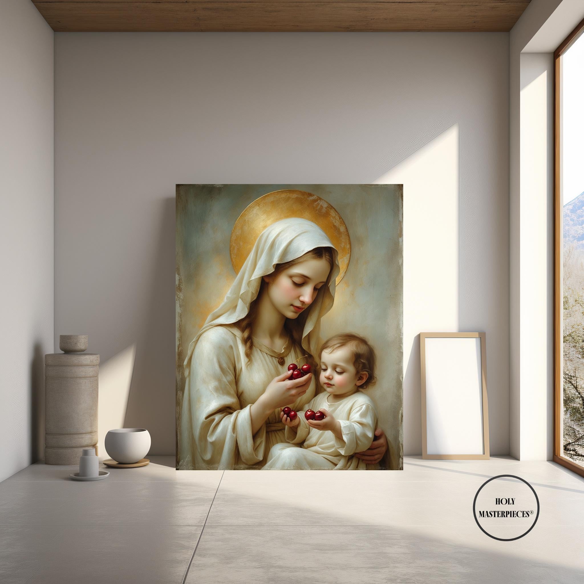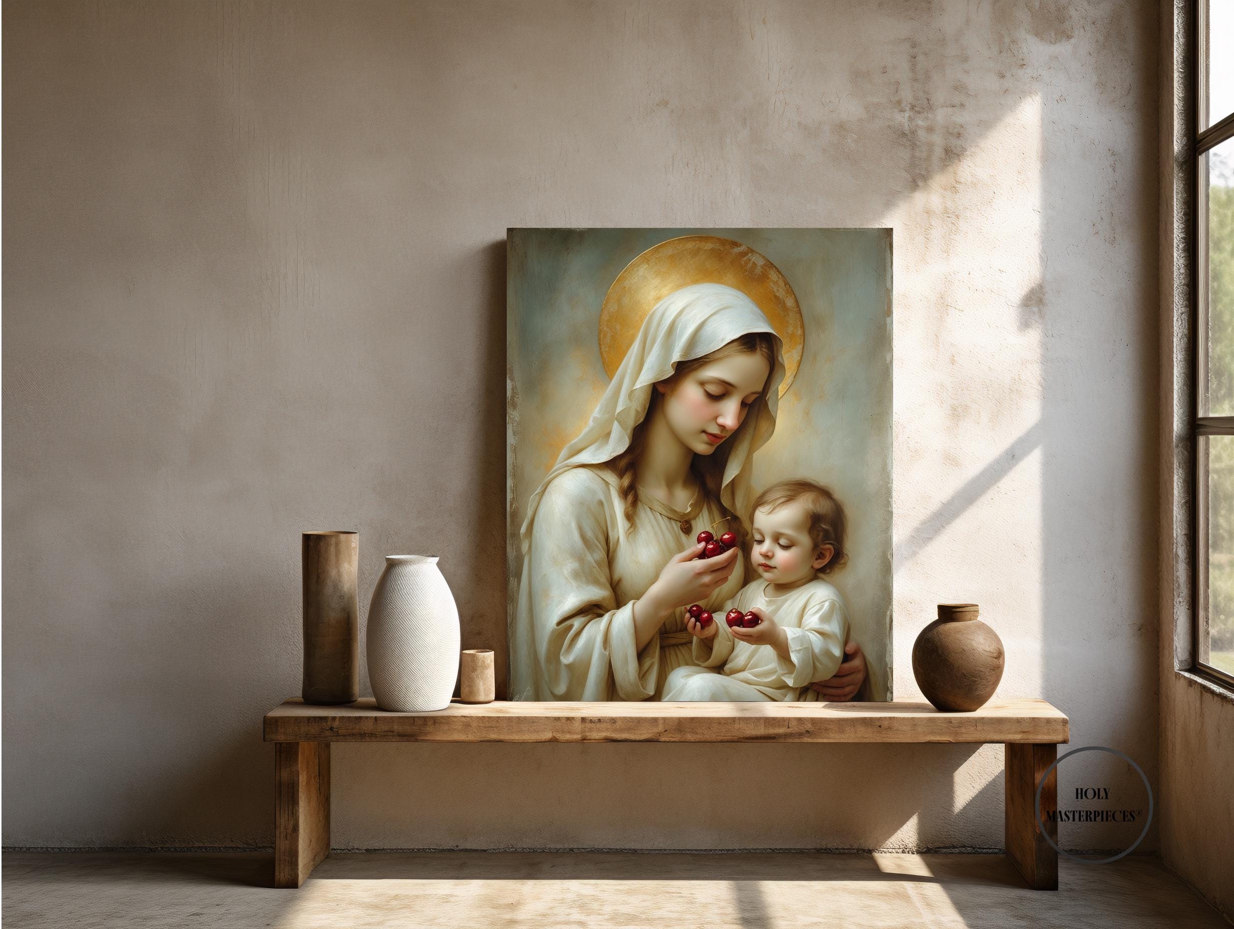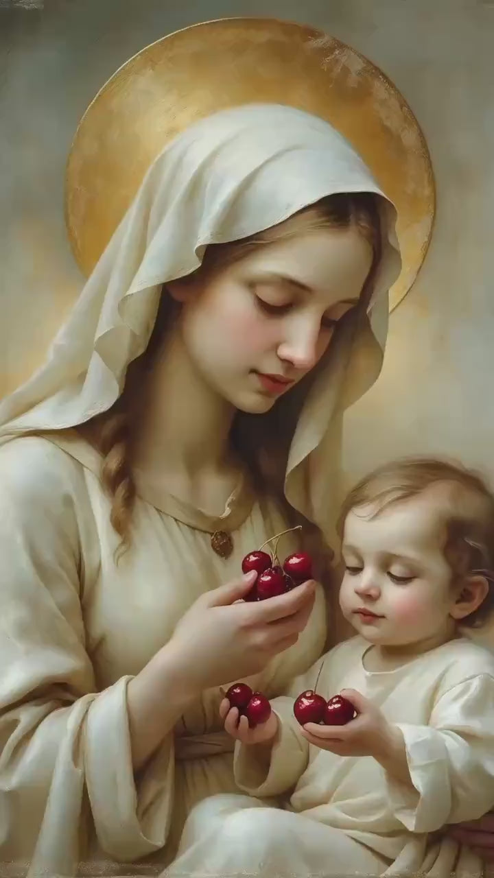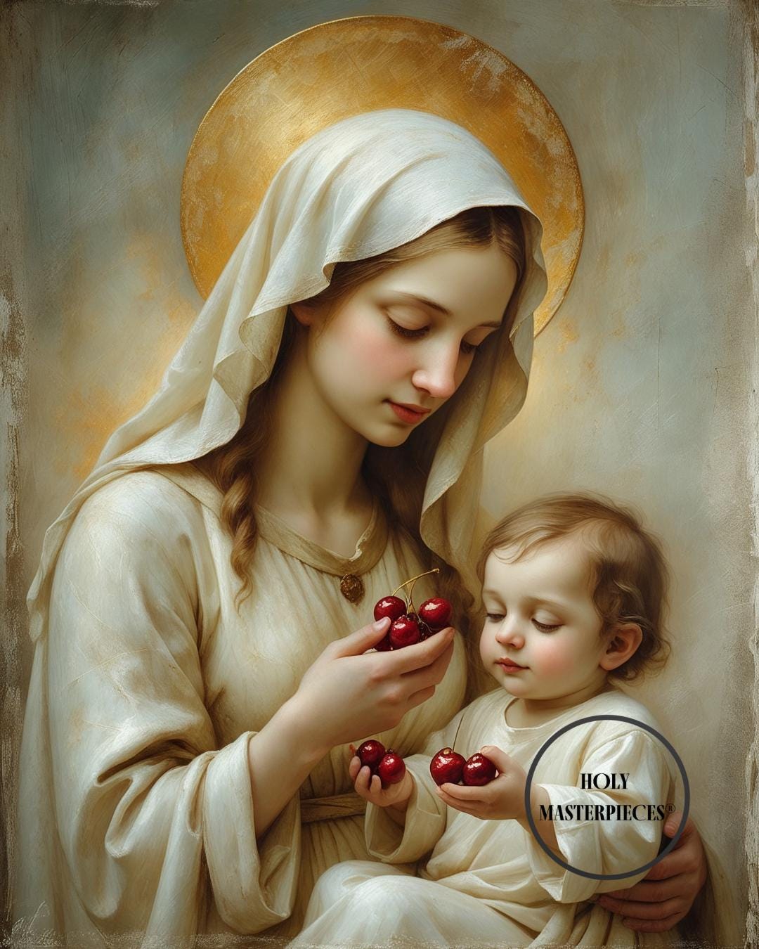 A tender and contemplative depiction of the Madonna and Child, inspired by the traditional theme of the Madonna of the Cherries. The Virgin Mary is shown in quiet maternal devotion as she gently offers a small cluster of cherries to the Infant Christ — a symbol of sweetness, innocence, and the promise of redemption.