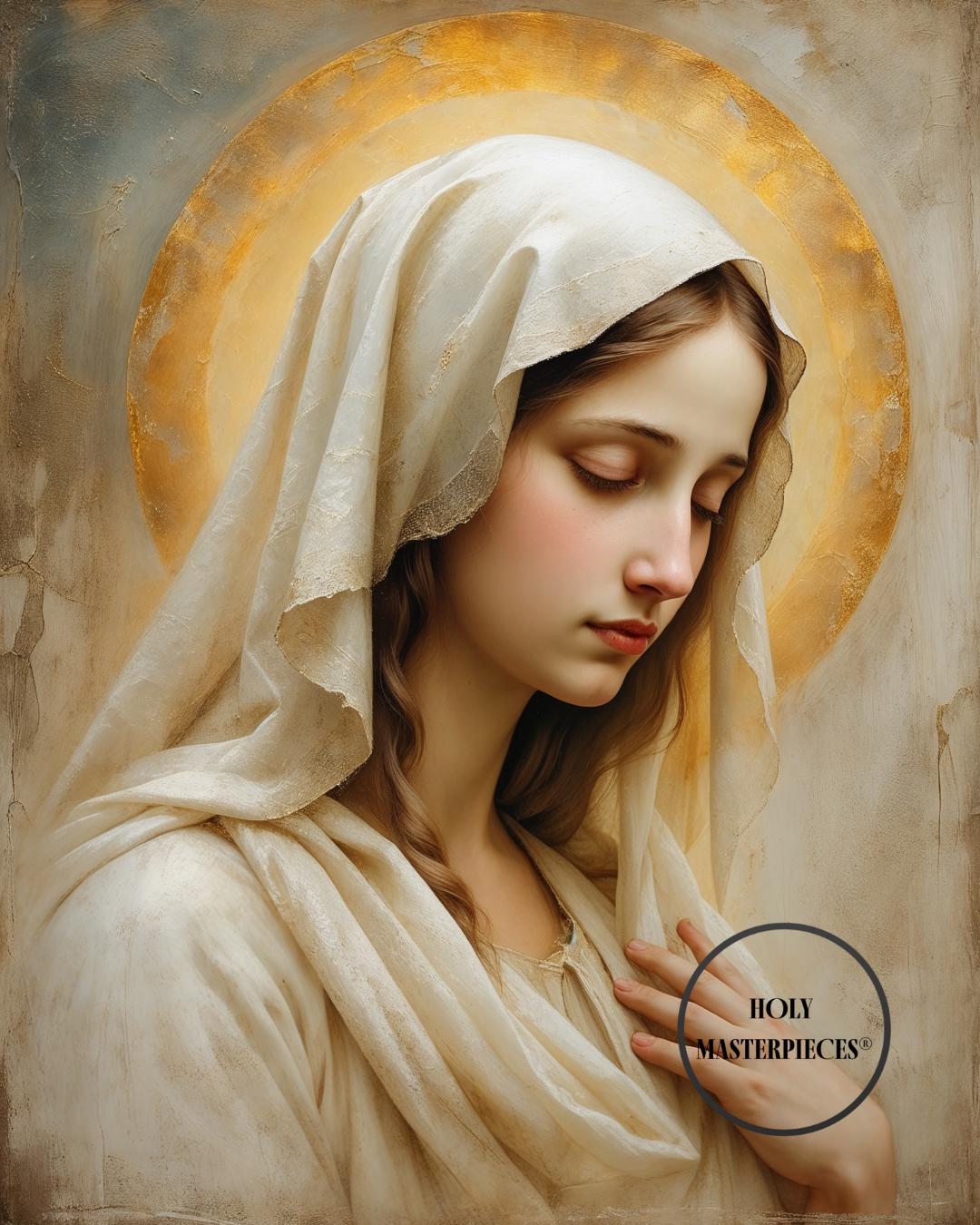 A serene and timeless portrait of the Blessed Virgin Mary, created in a classical 17th-century inspired style with soft painterly textures and a warm golden glow.