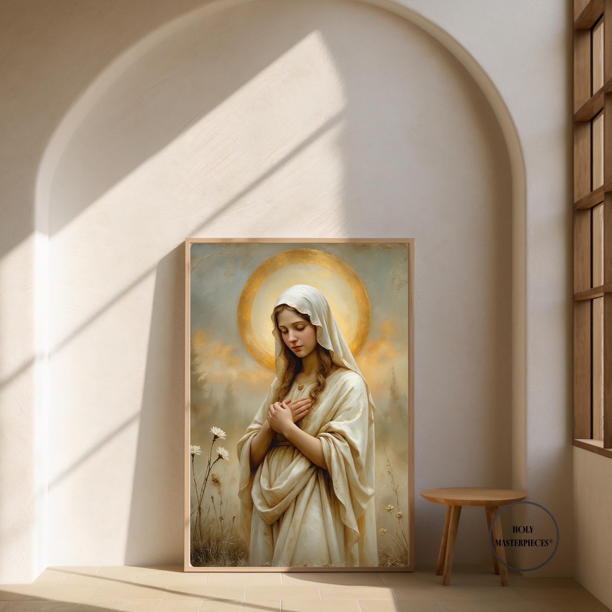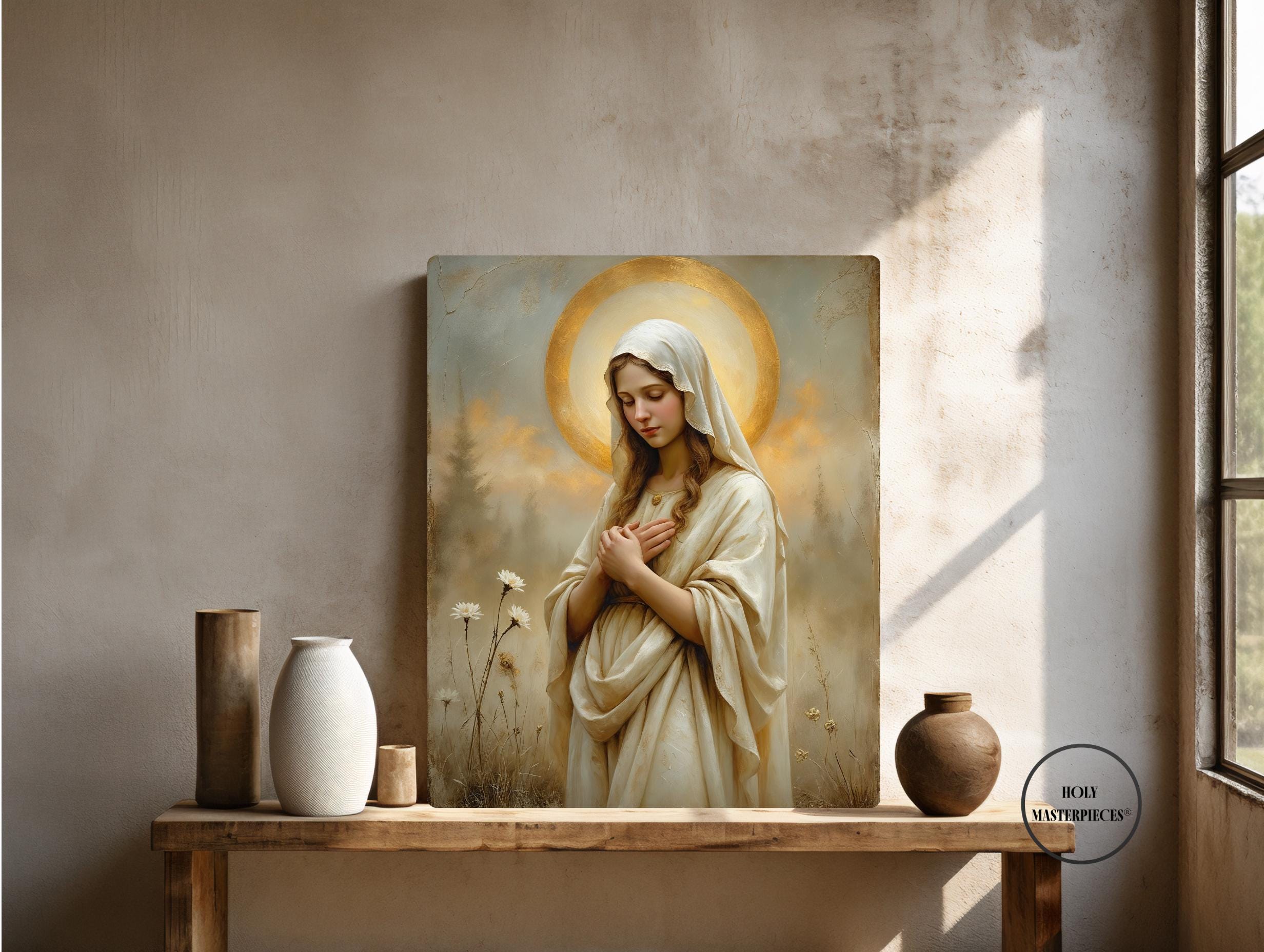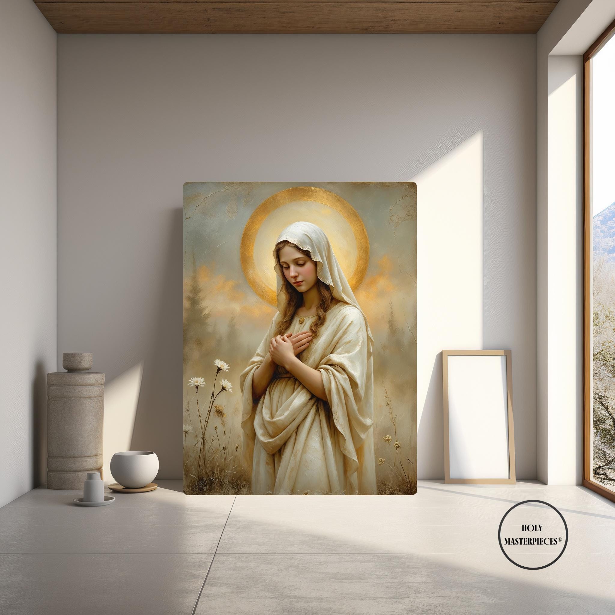 A peaceful and uplifting artwork perfect for prayer rooms, chapels, Marian devotion, and serene Christian home décor.