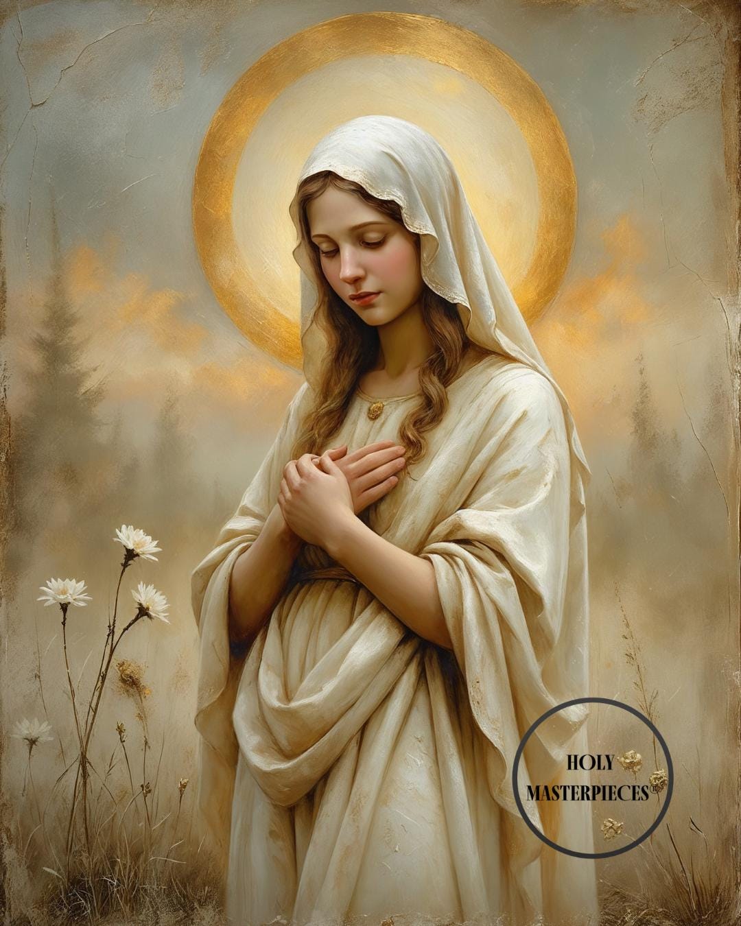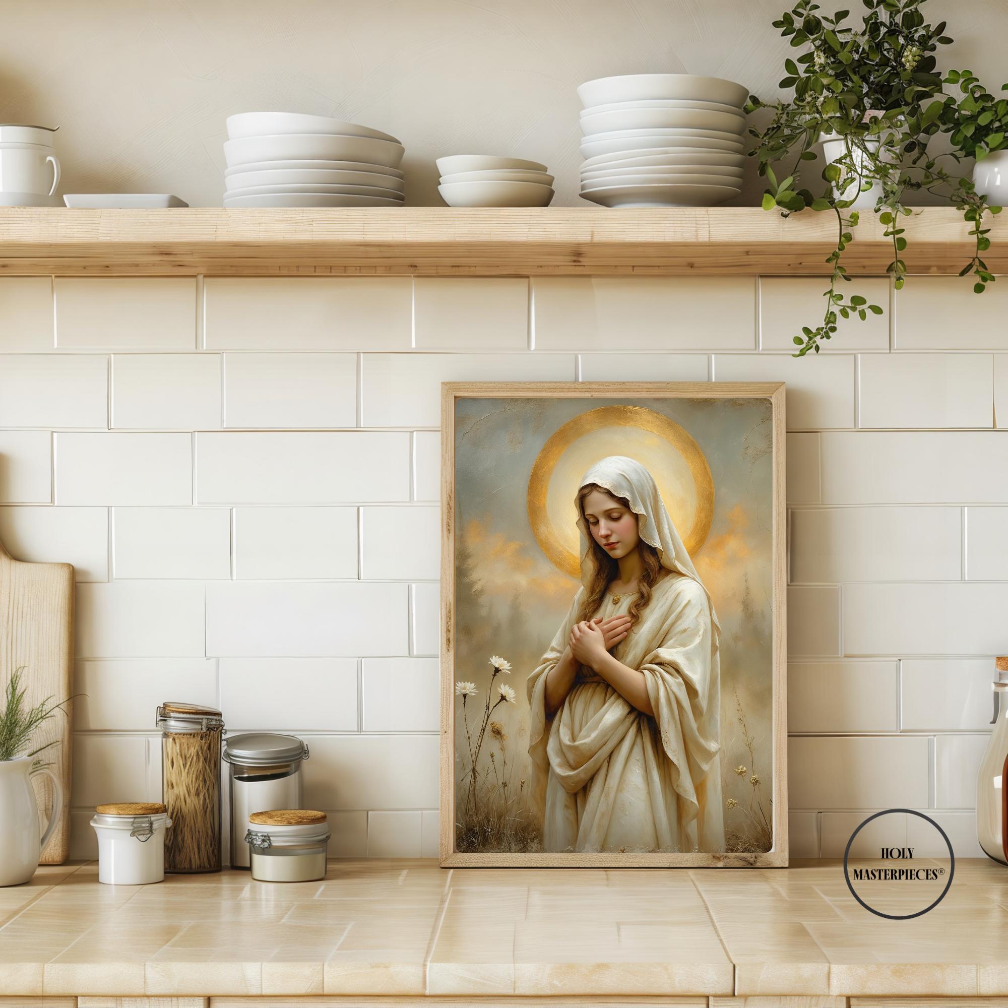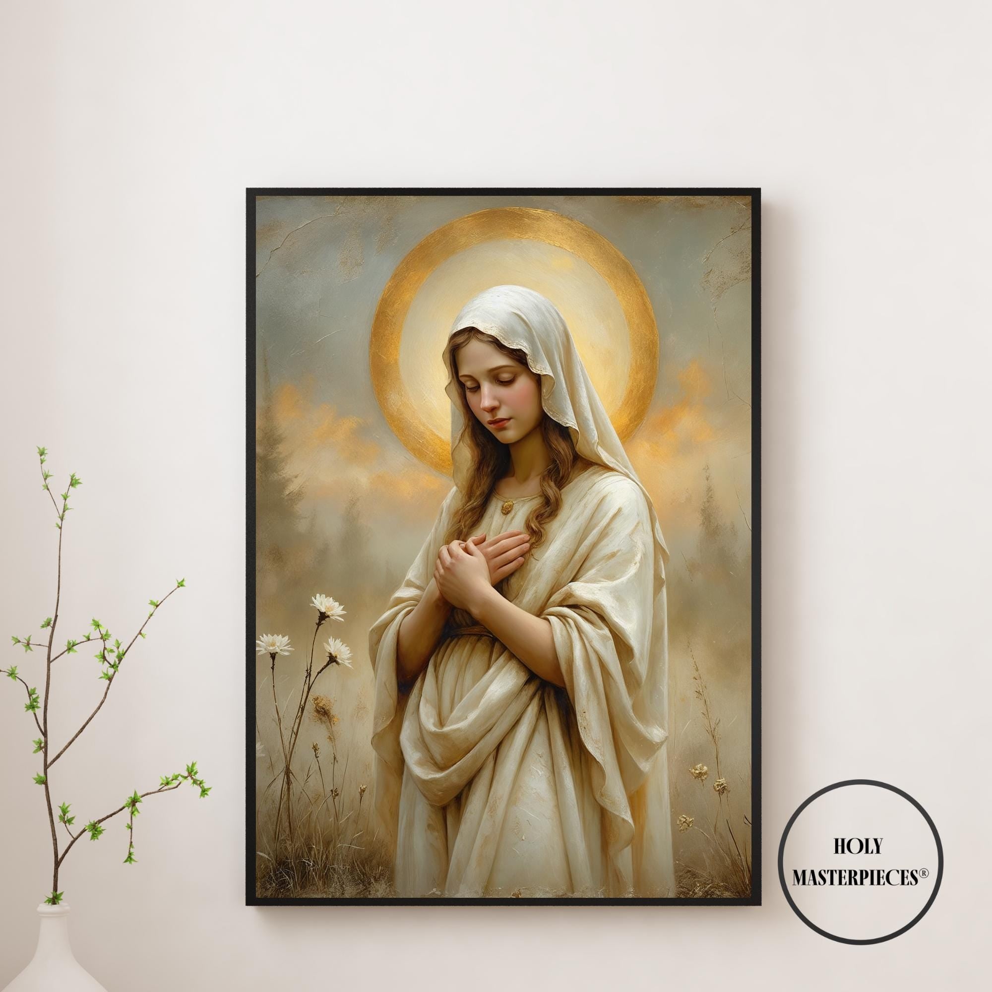 A peaceful and uplifting artwork perfect for prayer rooms, chapels, Marian devotion, and serene Christian home décor.