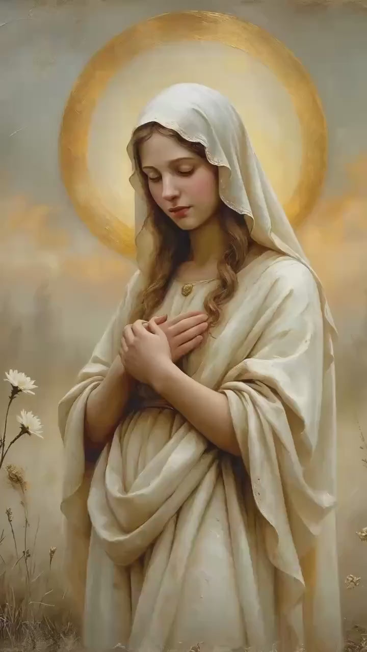 Her pale ivory veil, muted tones, and the cracked-plaster background blend to create a timeless sacred atmosphere reminiscent of ancient frescoes.