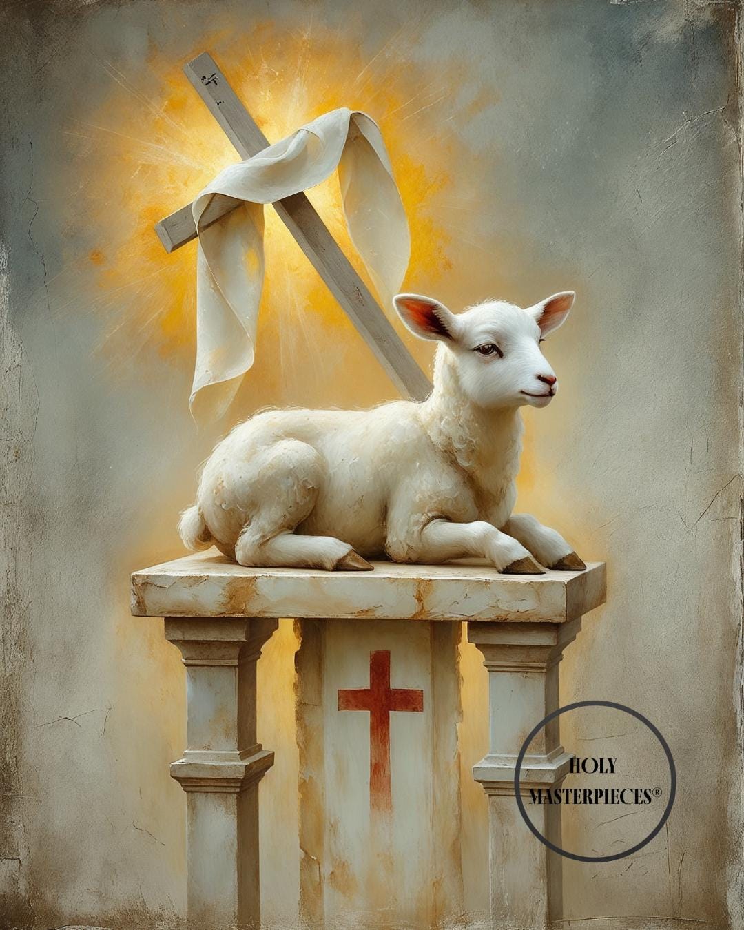 The artwork features the Lamb of God resting peacefully upon a simple stone altar, illuminated by warm golden light. Behind the lamb stands a wooden cross draped with soft ivory linen, symbolizing Christ’s victory over death. Each element is portrayed in softened, painterly form without modern detail, creating a reverent classical composition perfect for Lent, Holy Week, and Easter devotion.