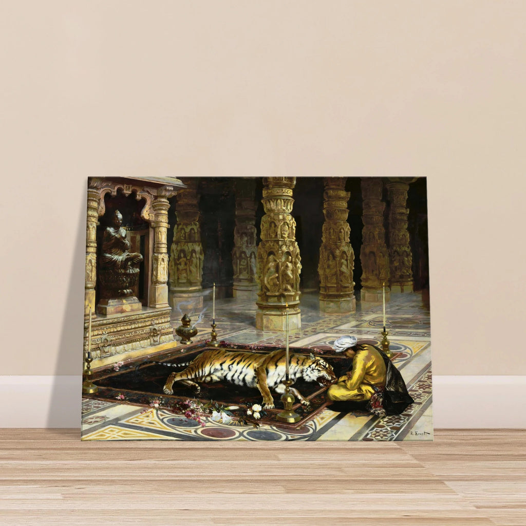 Questo dipinto, creato da Rudolf Ernst nel 1860, ritrae una maestosa tigre in tutto il suo splendore. L'artista, noto per i suoi dettagli intricati e lo stile orientalista, cattura la bellezza e la potenza di questo animale in uno straordinario realismo. Un must per i collezionisti d'arte e per coloro che apprezzano i dipinti raffinati.