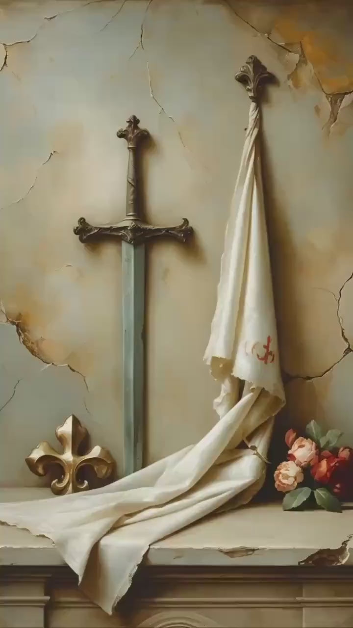 A noble and symbolic sacred still-life honoring Saint Joan of Arc, the Maid of Orléans and patron saint of France. A weathered medieval sword stands upright in the center, symbolizing her courage and divine mission. A white battle banner hangs beside it, softly draped and aged with faint red embroidery. A bronze fleur-de-lis rests on the altar, recalling Joan’s French heritage and heavenly purpose. Muted antique roses add gentle warmth to the composition.