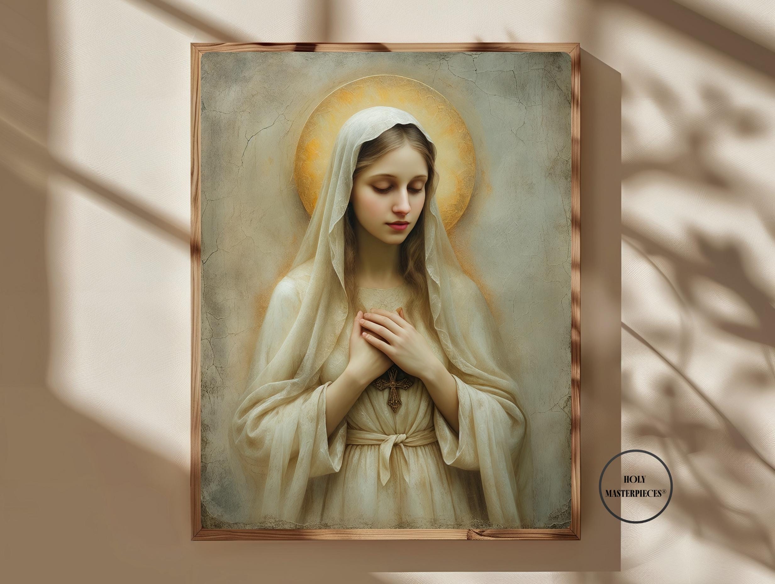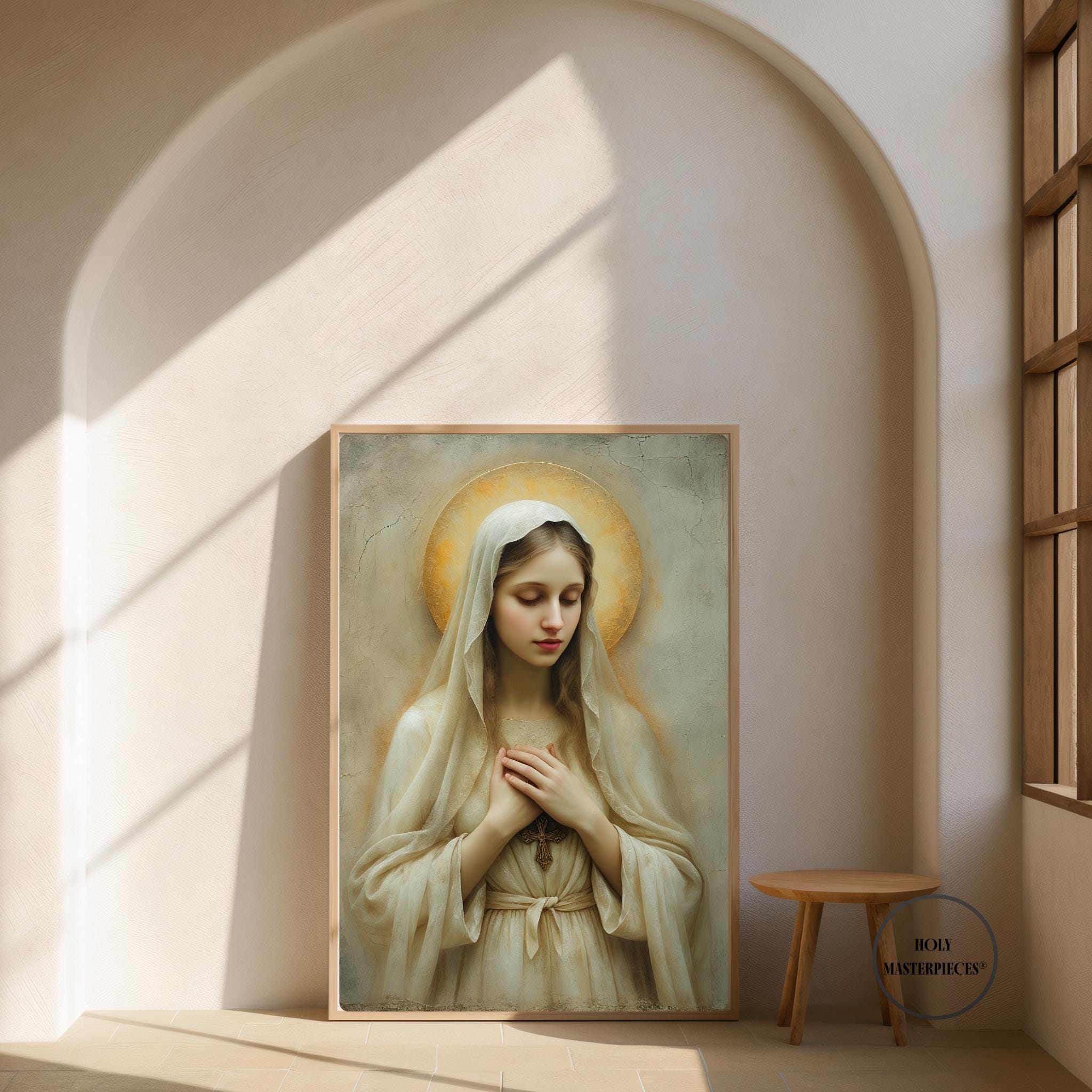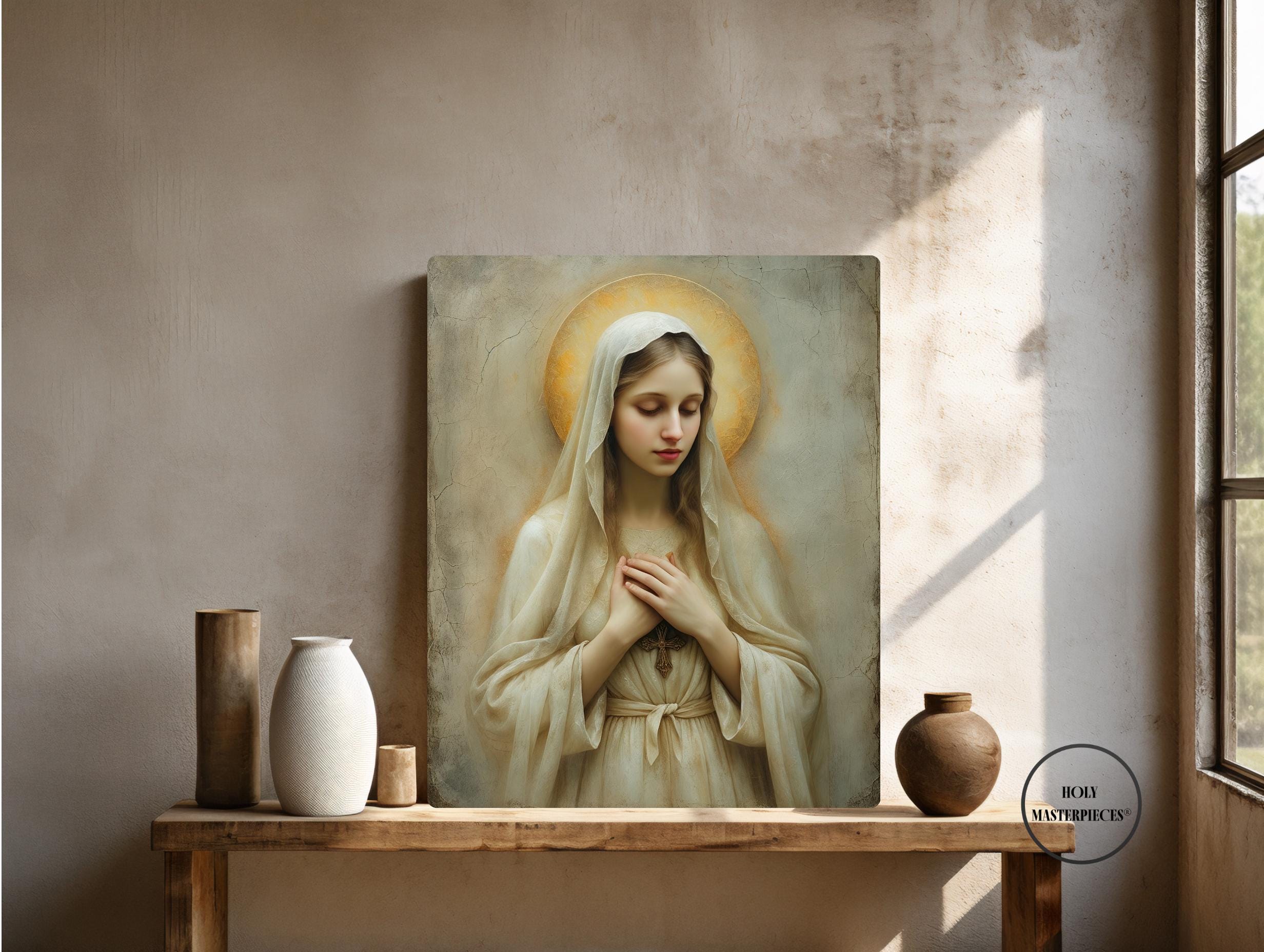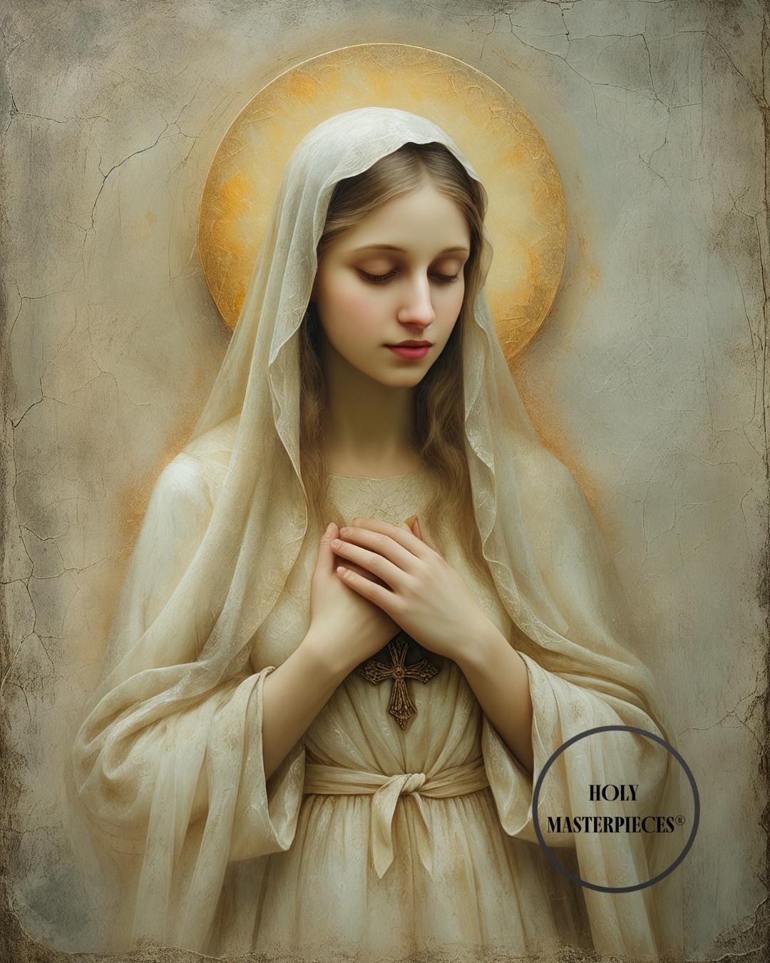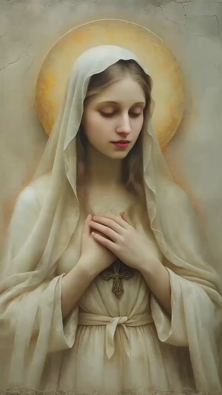Created in the tradition of a classical 17th-century Western sacred oil painting, the composition is defined by a muted palette, soft painterly texture, and gentle sacred chiaroscuro. Mary is draped in an ivory-toned veil, her presence illuminated by a warm devotional glow against an aged cracked-plaster background. The softened edges and timeless atmosphere make this piece especially suited for prayer spaces and moments of reflection.