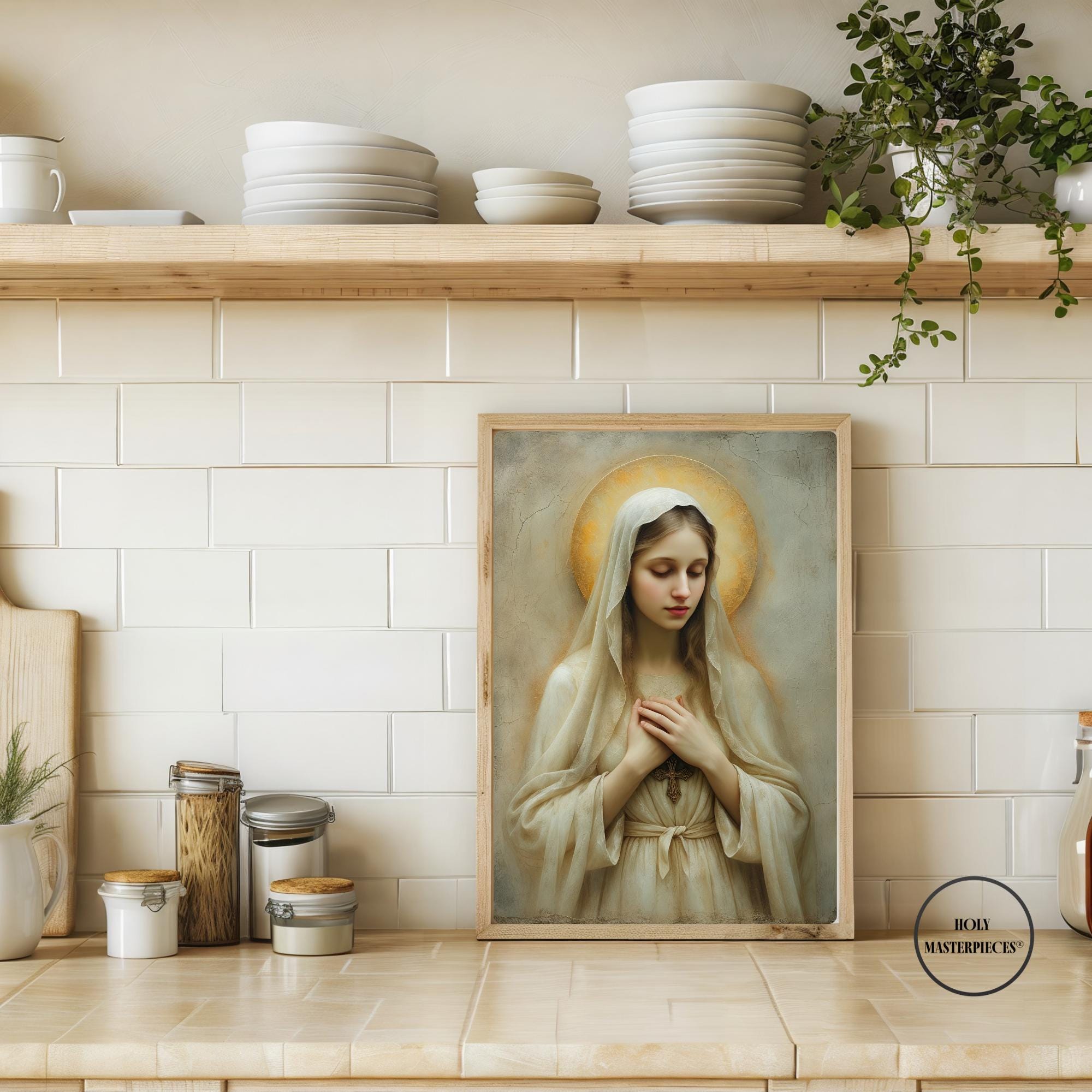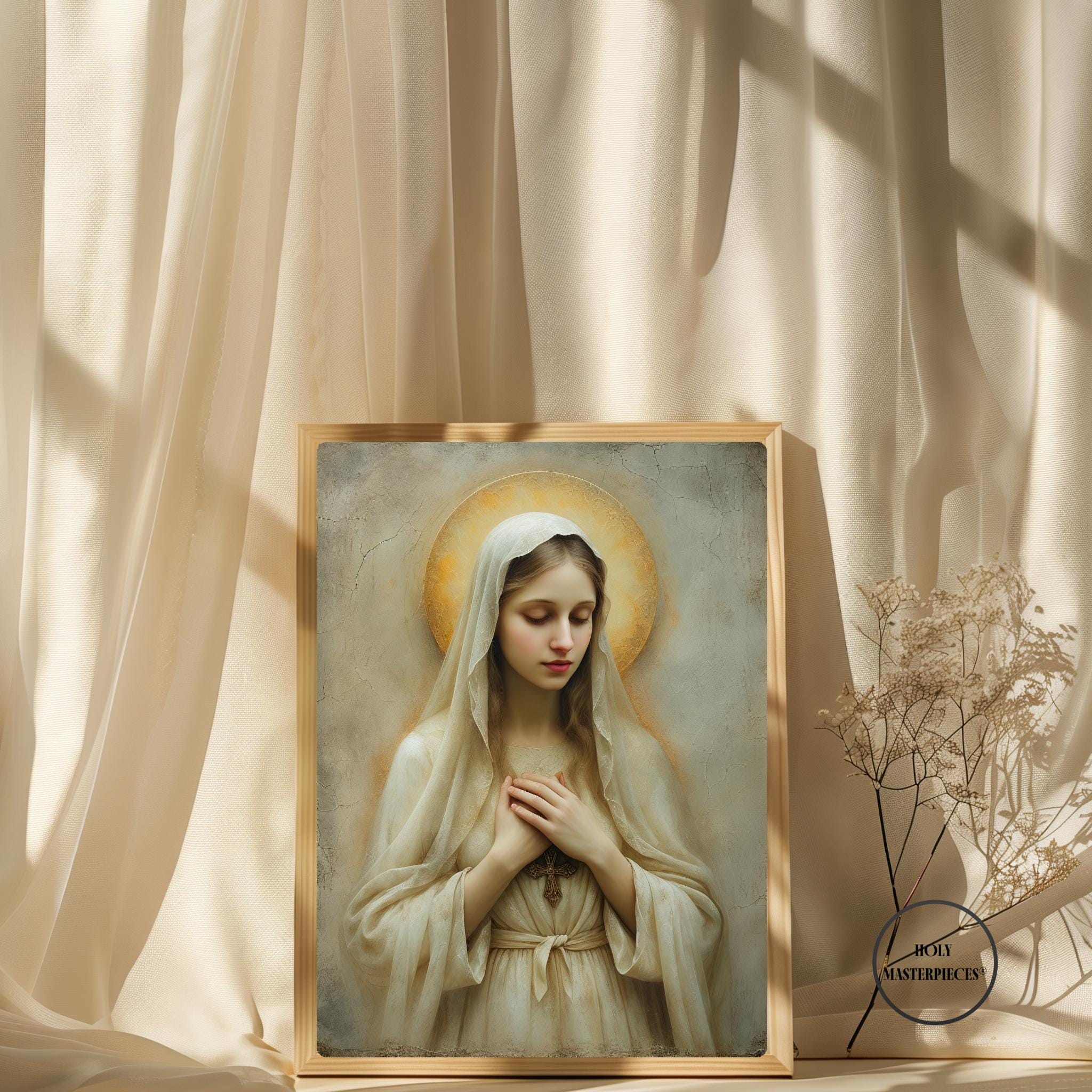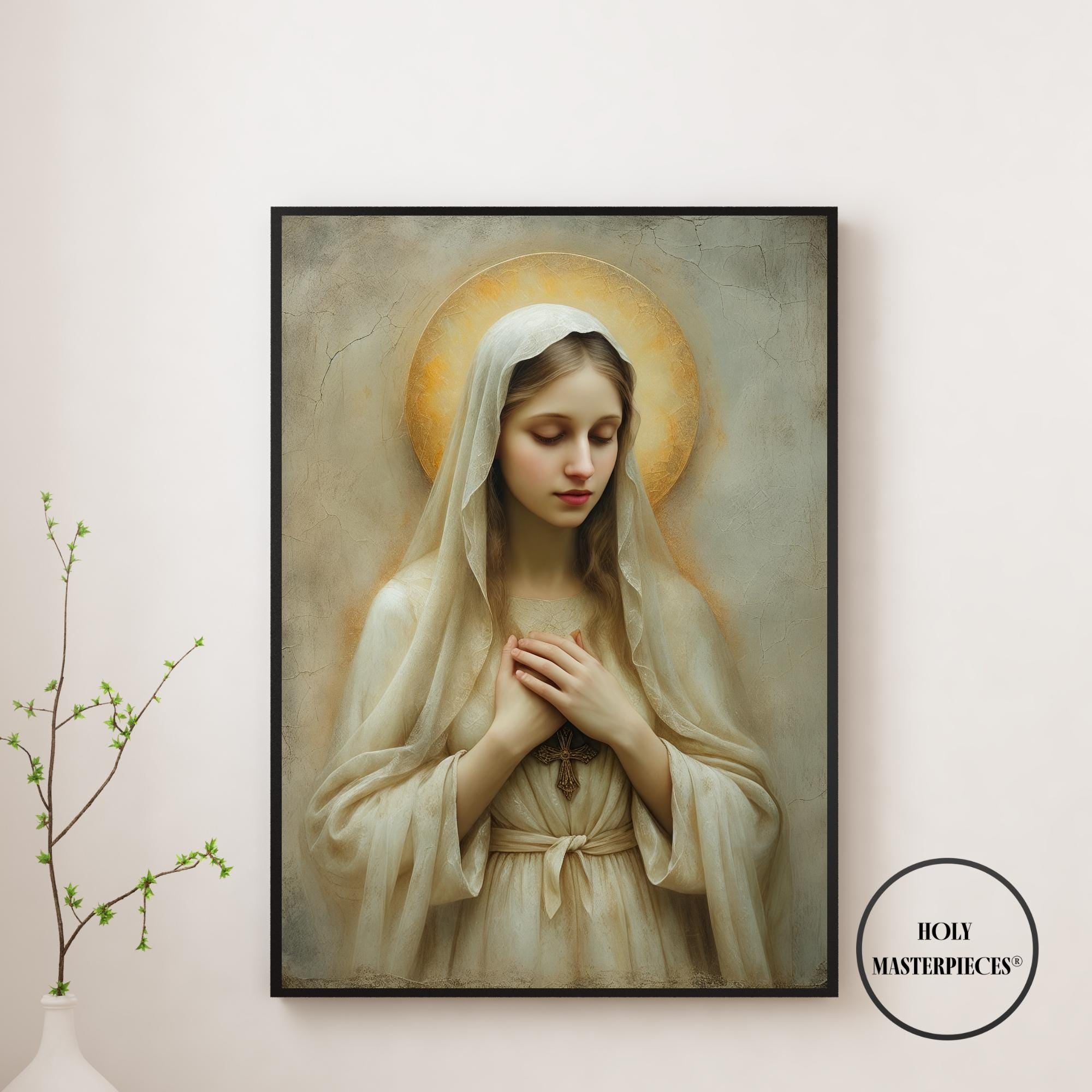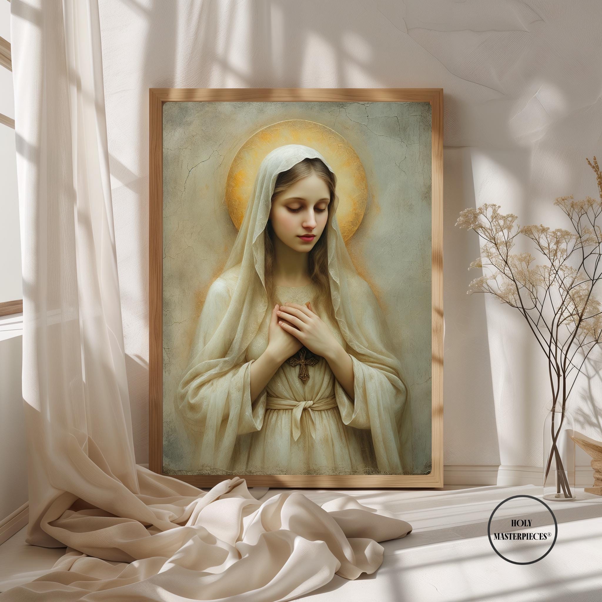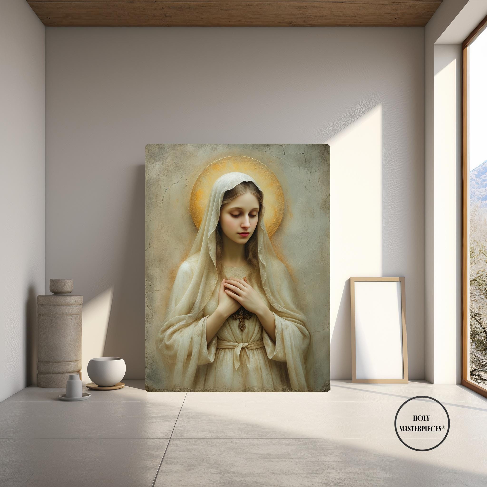 Created in the tradition of a classical 17th-century Western sacred oil painting, the composition is defined by a muted palette, soft painterly texture, and gentle sacred chiaroscuro. Mary is draped in an ivory-toned veil, her presence illuminated by a warm devotional glow against an aged cracked-plaster background. The softened edges and timeless atmosphere make this piece especially suited for prayer spaces and moments of reflection.