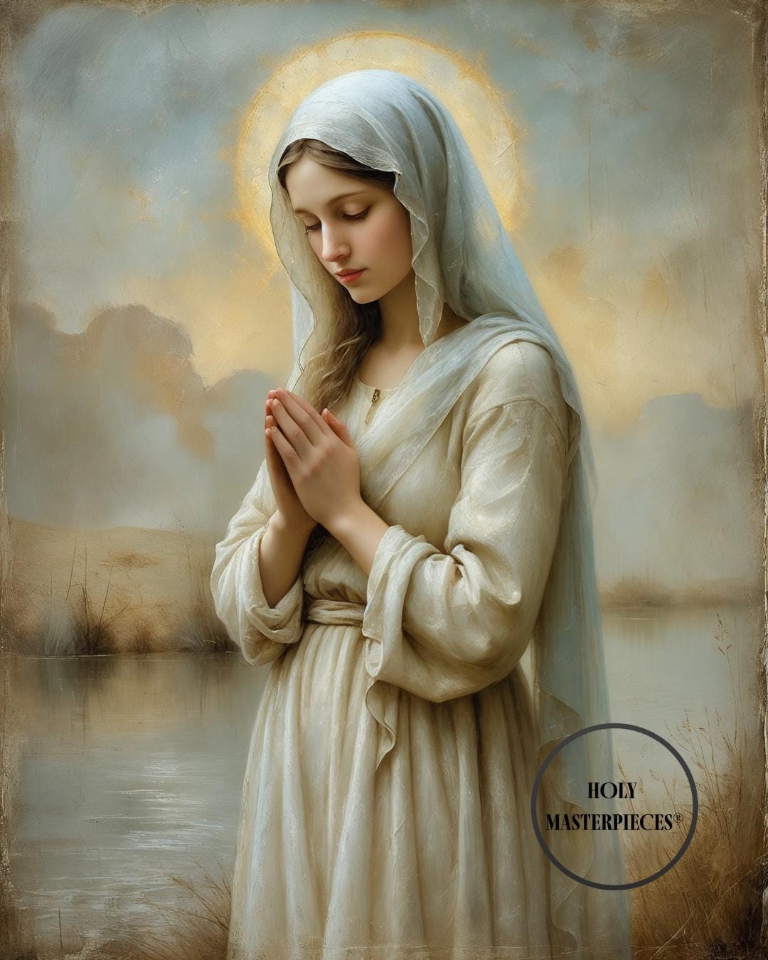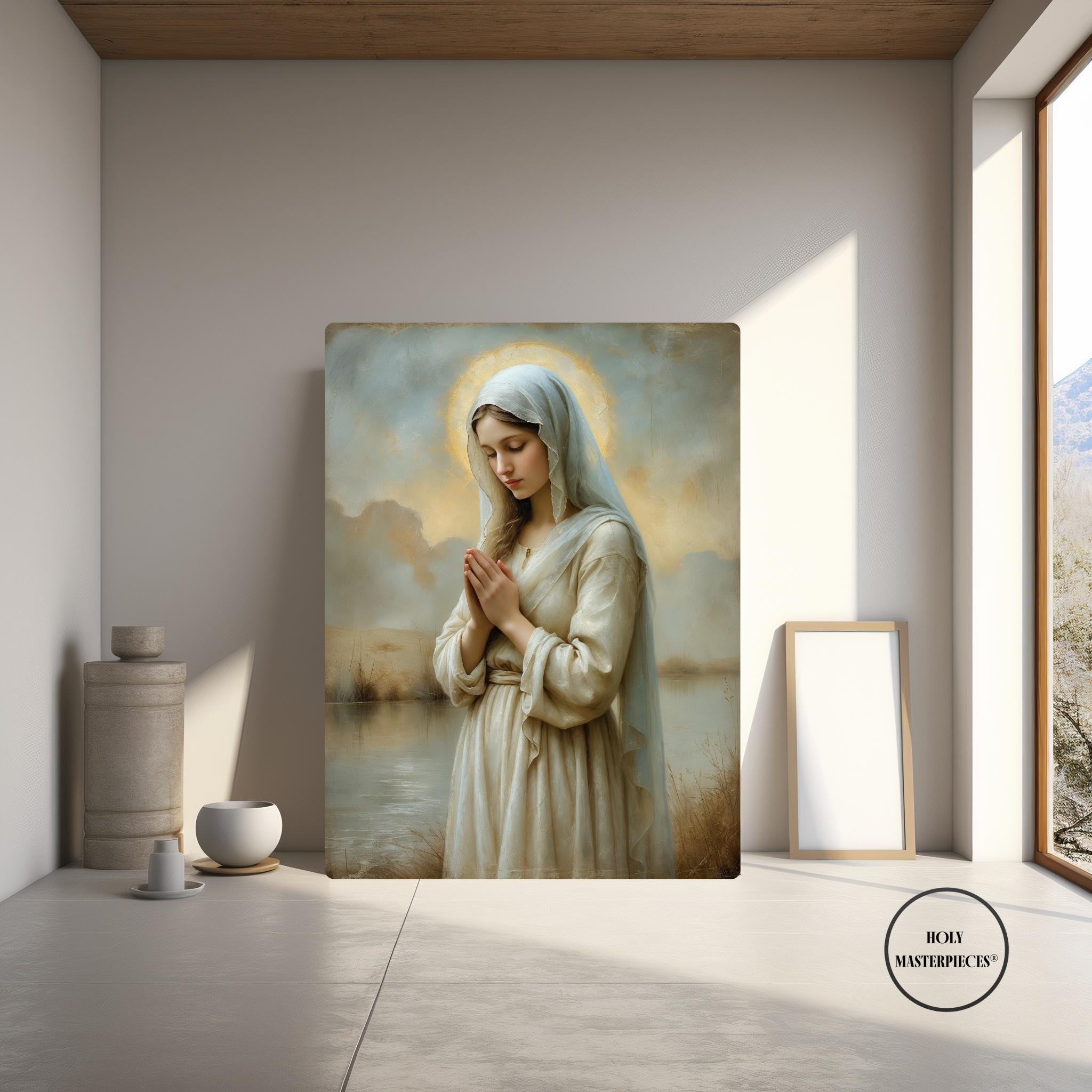 Her pale blue-grey veil carries cool reflective tones that harmonize with the muted water hues, while the cracked-plaster background and softened painterly textures evoke the timeless beauty of classical sacred frescoes. This peaceful composition brings a sense of stillness, clarity, and spiritual gentleness to any sacred space.