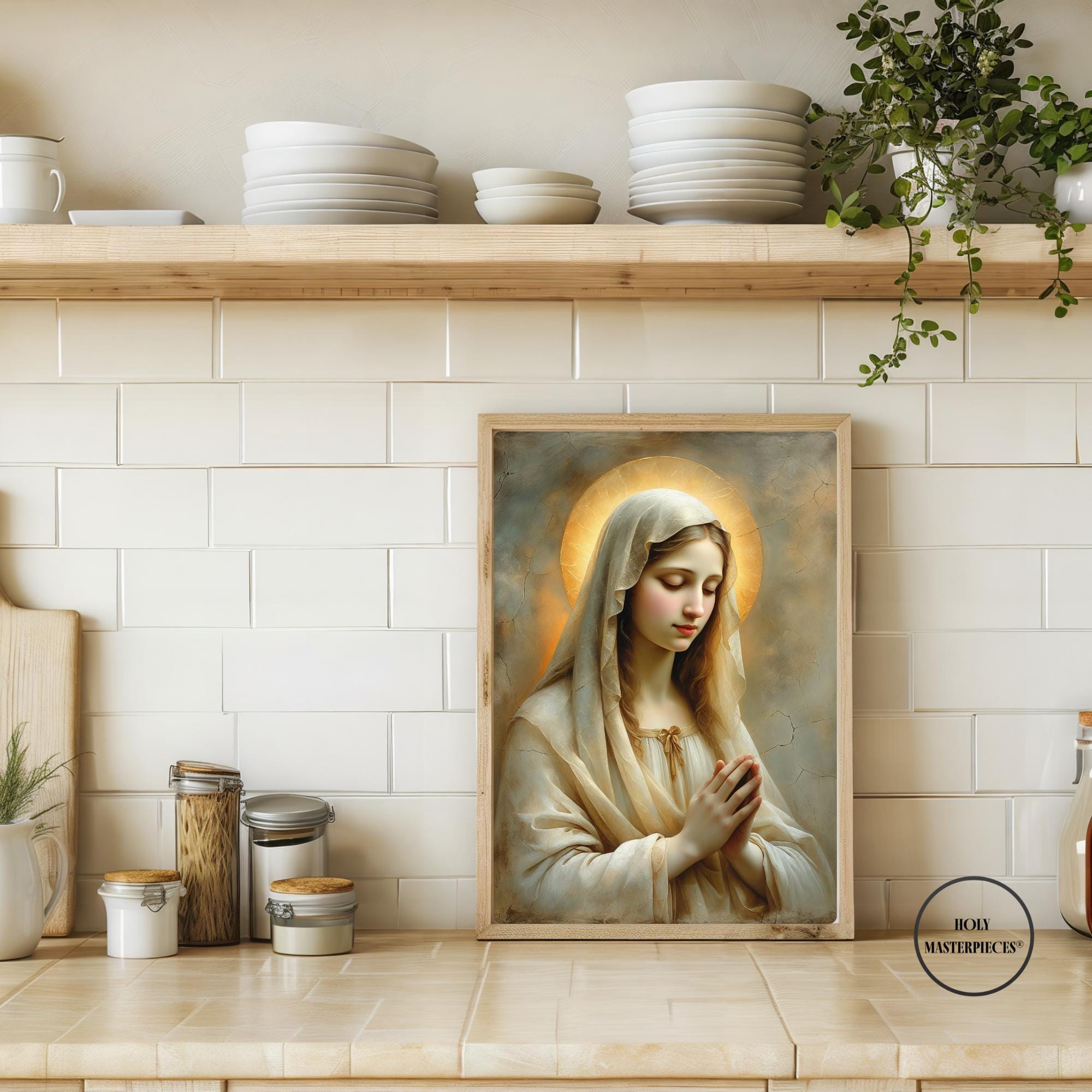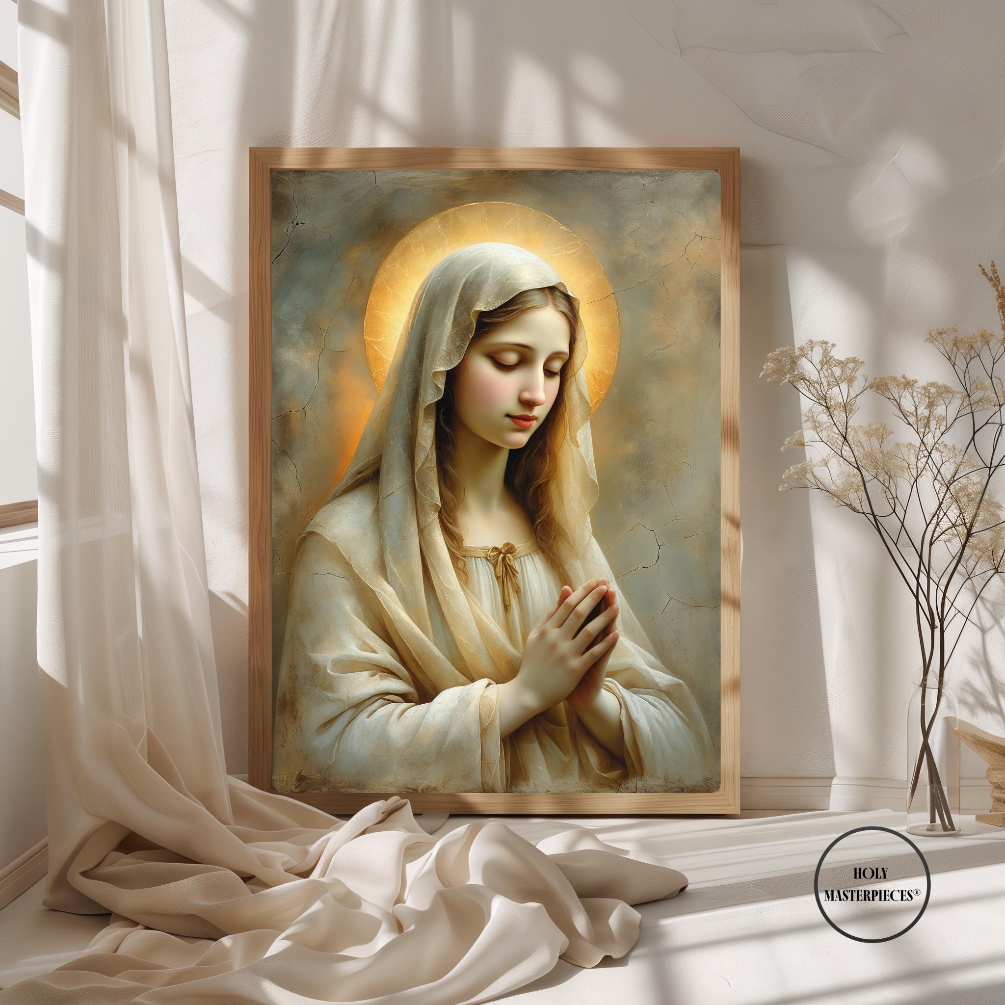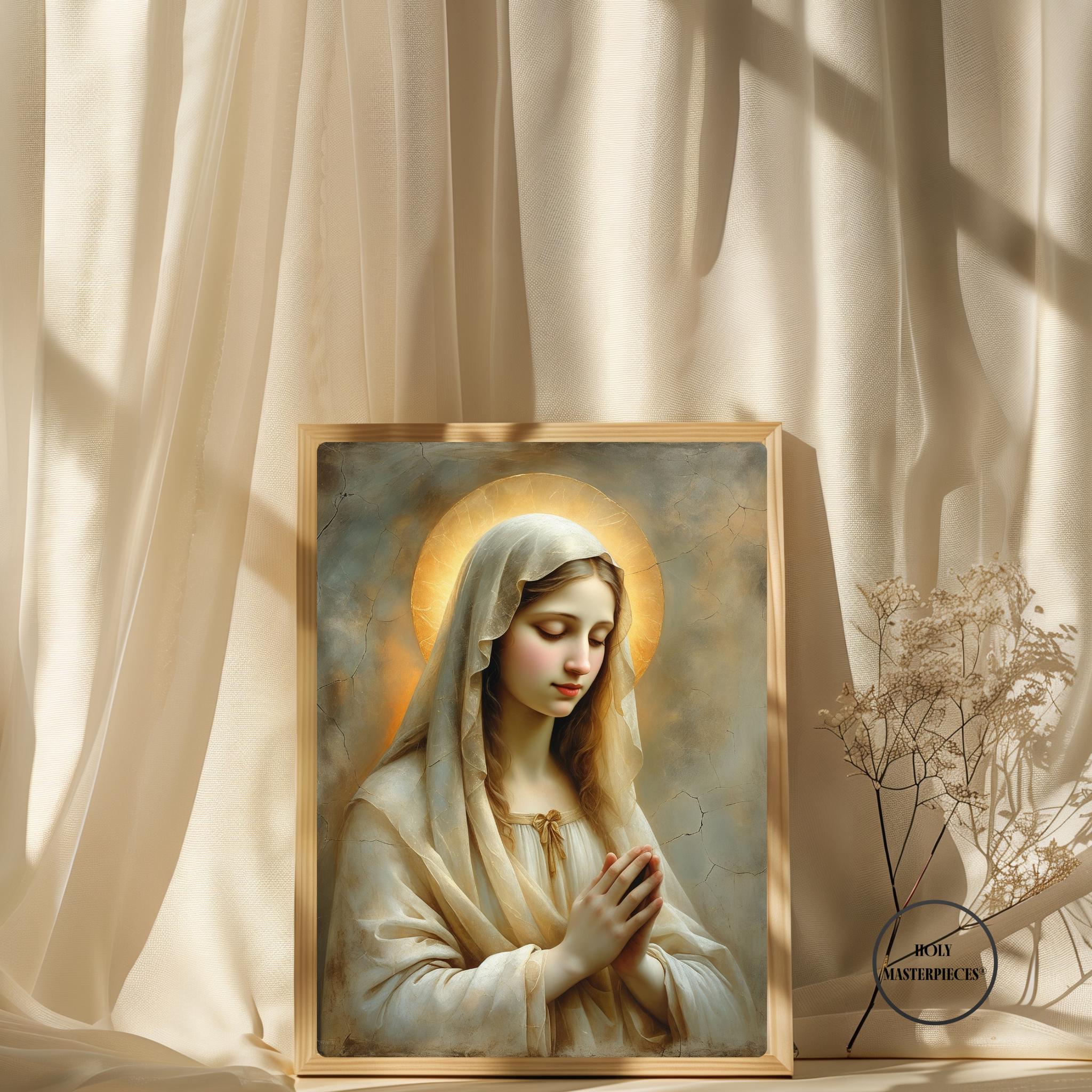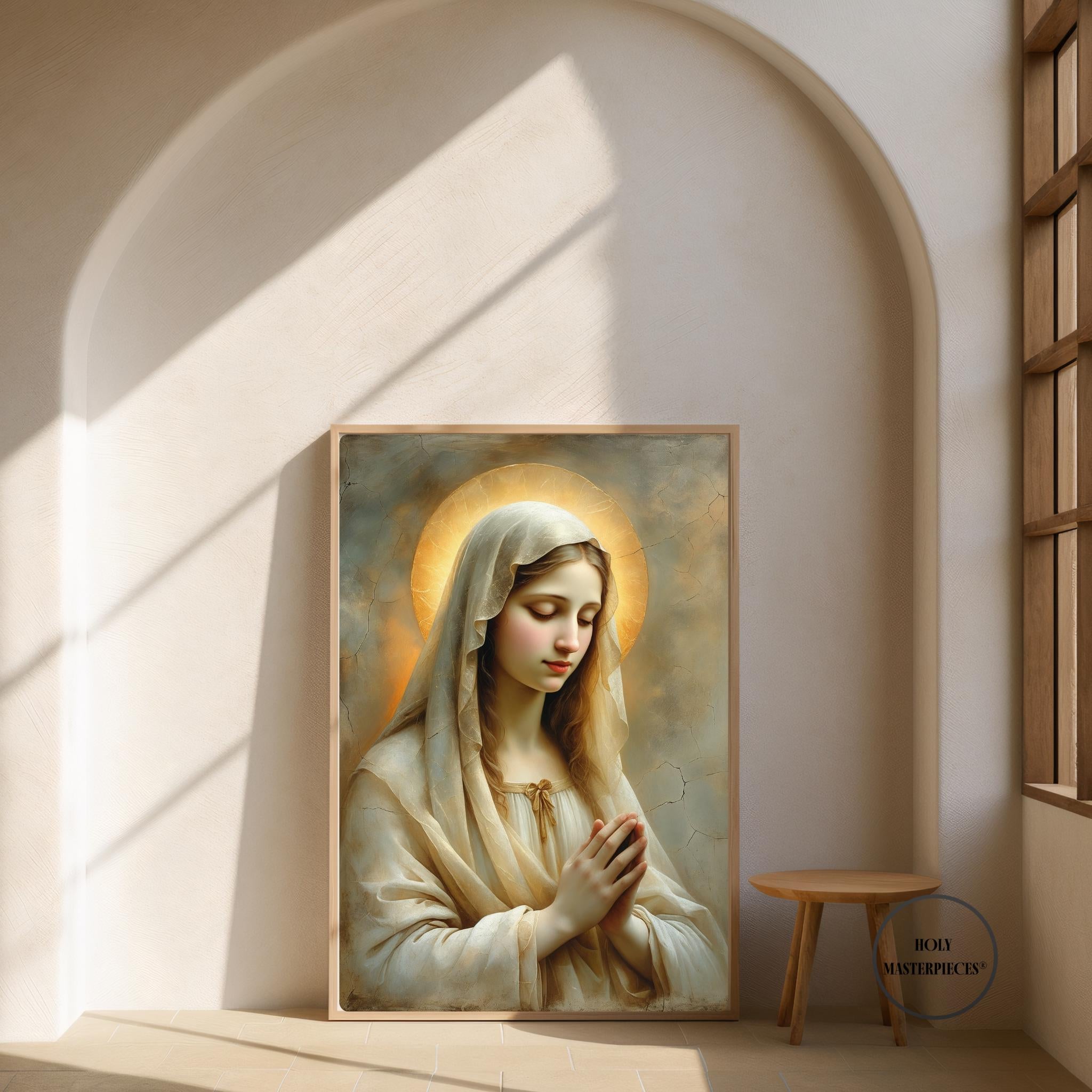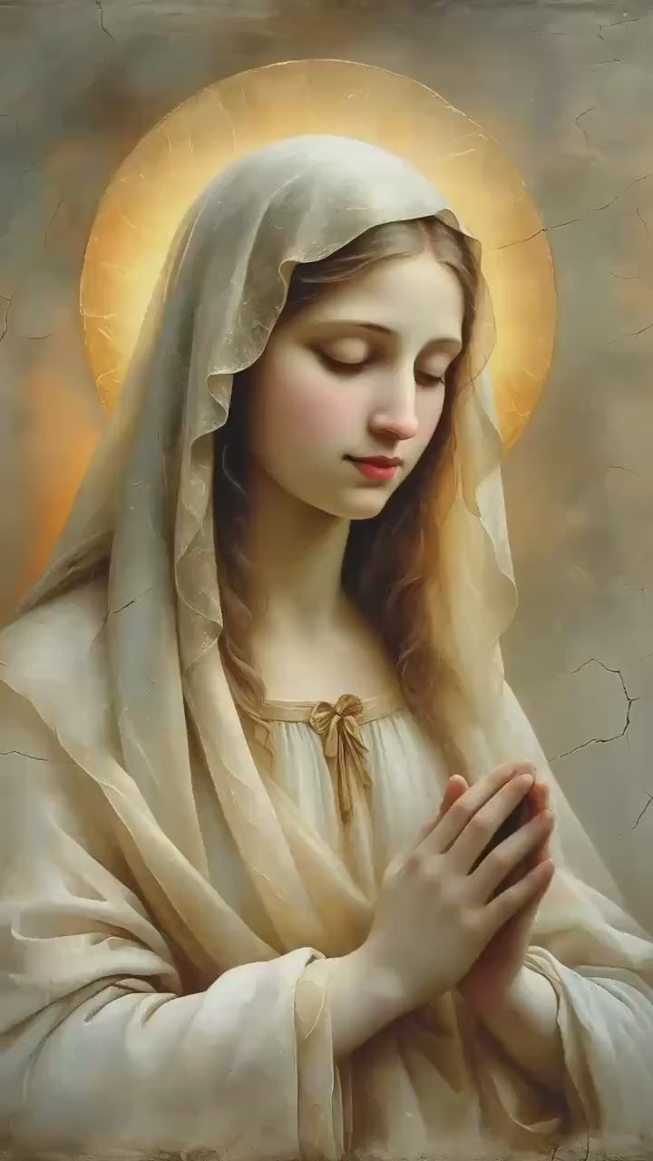 Her pale gold-beige veil glows subtly in the warm light, blending with the muted painterly textures and cracked-plaster background to evoke the timeless beauty of classical sacred frescoes. This radiant composition brings a sense of calm, warmth, and spiritual stillness to any sacred space.