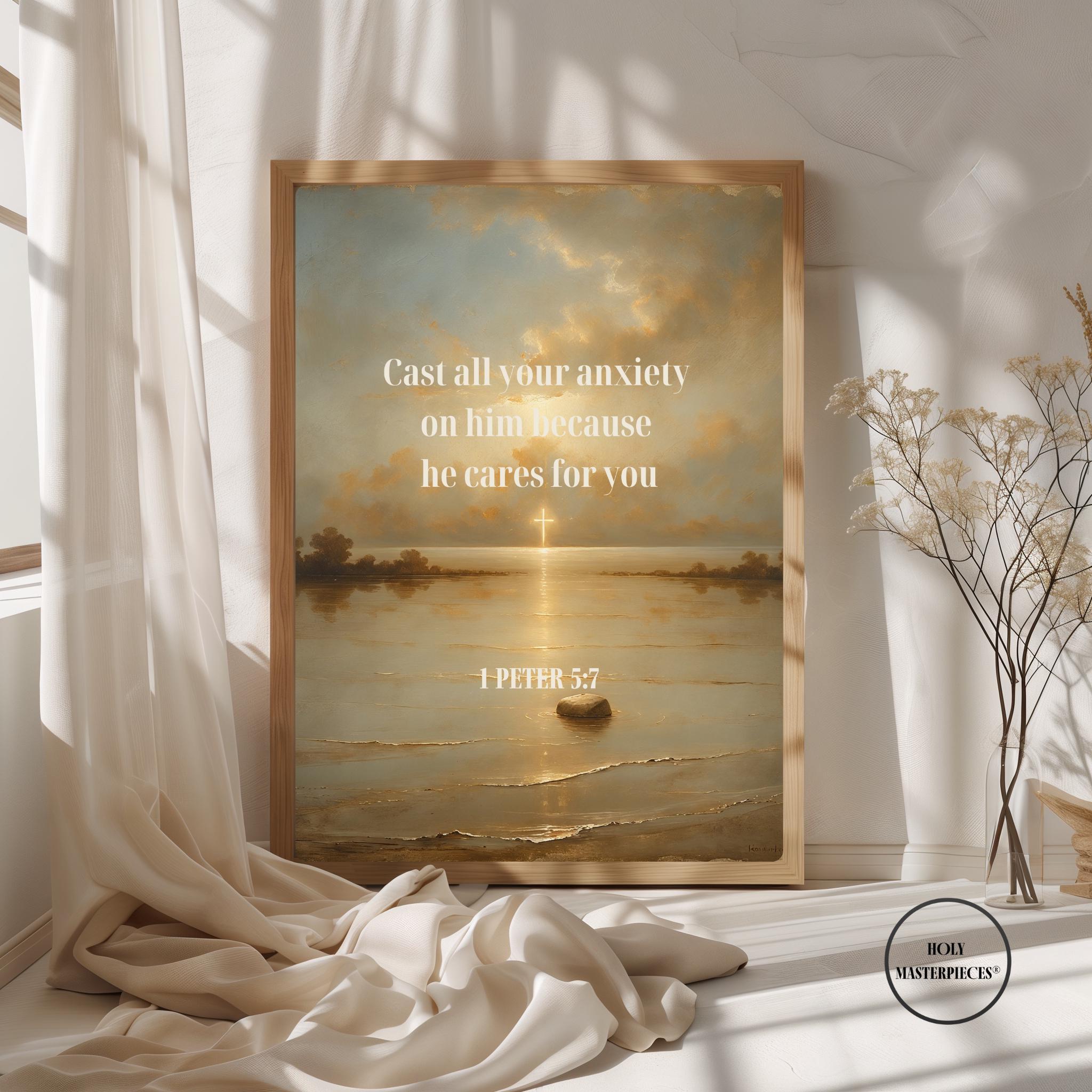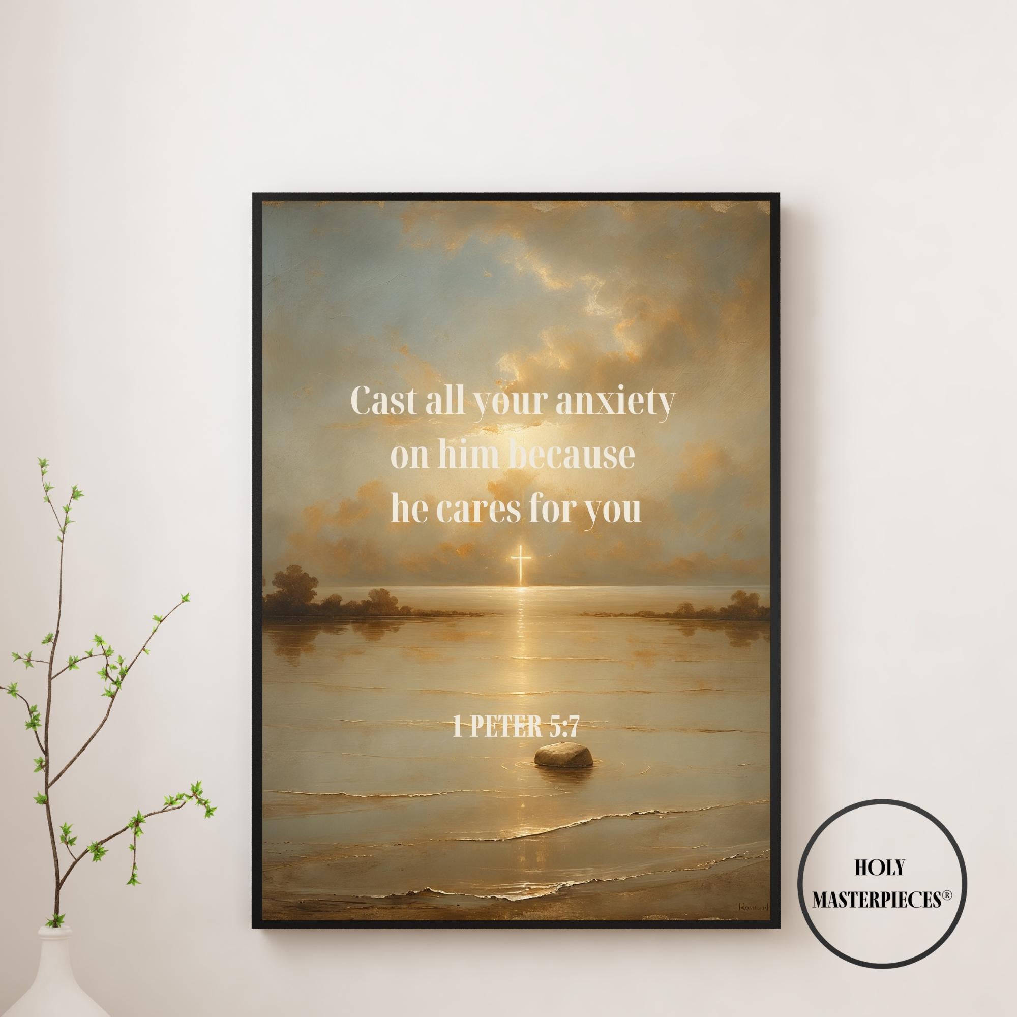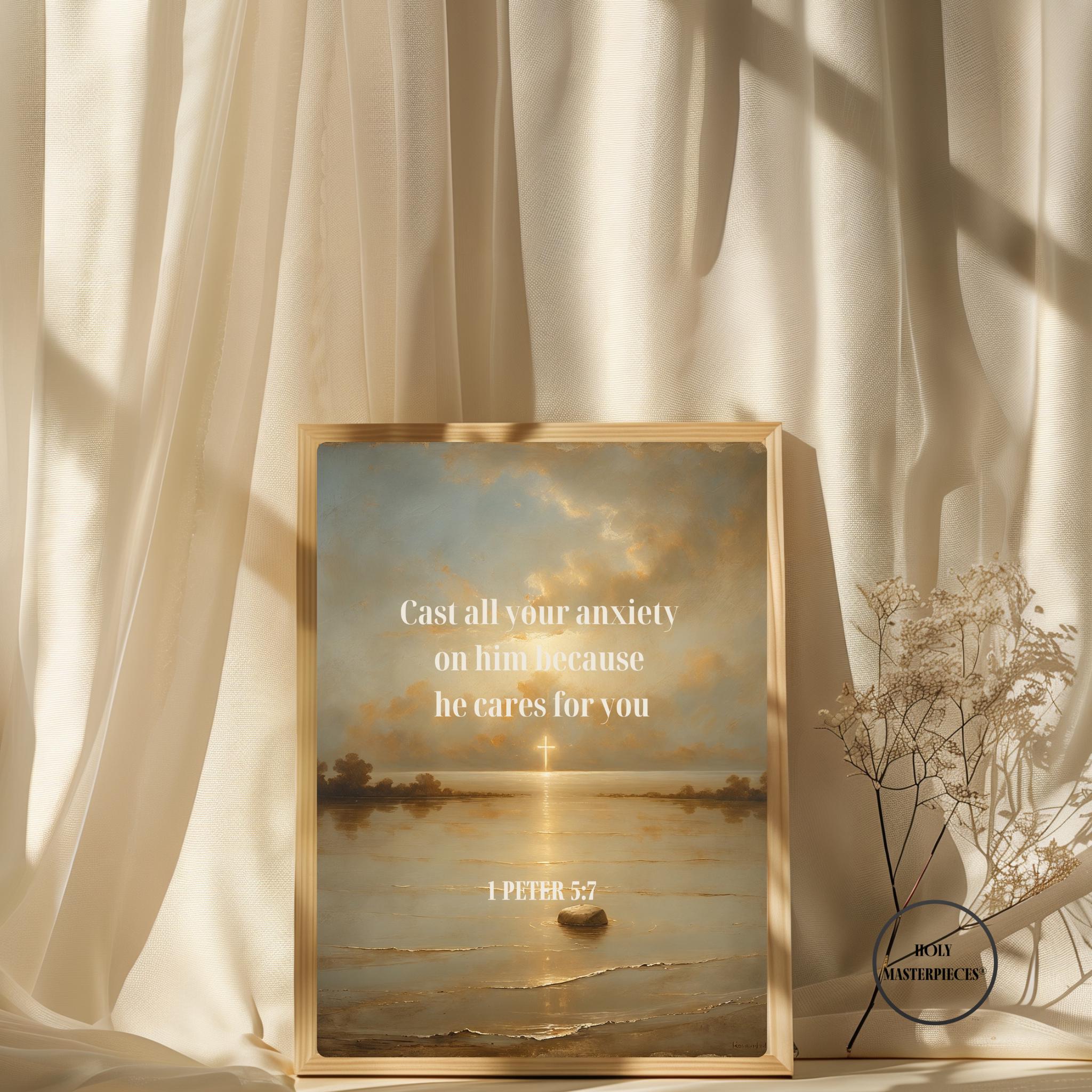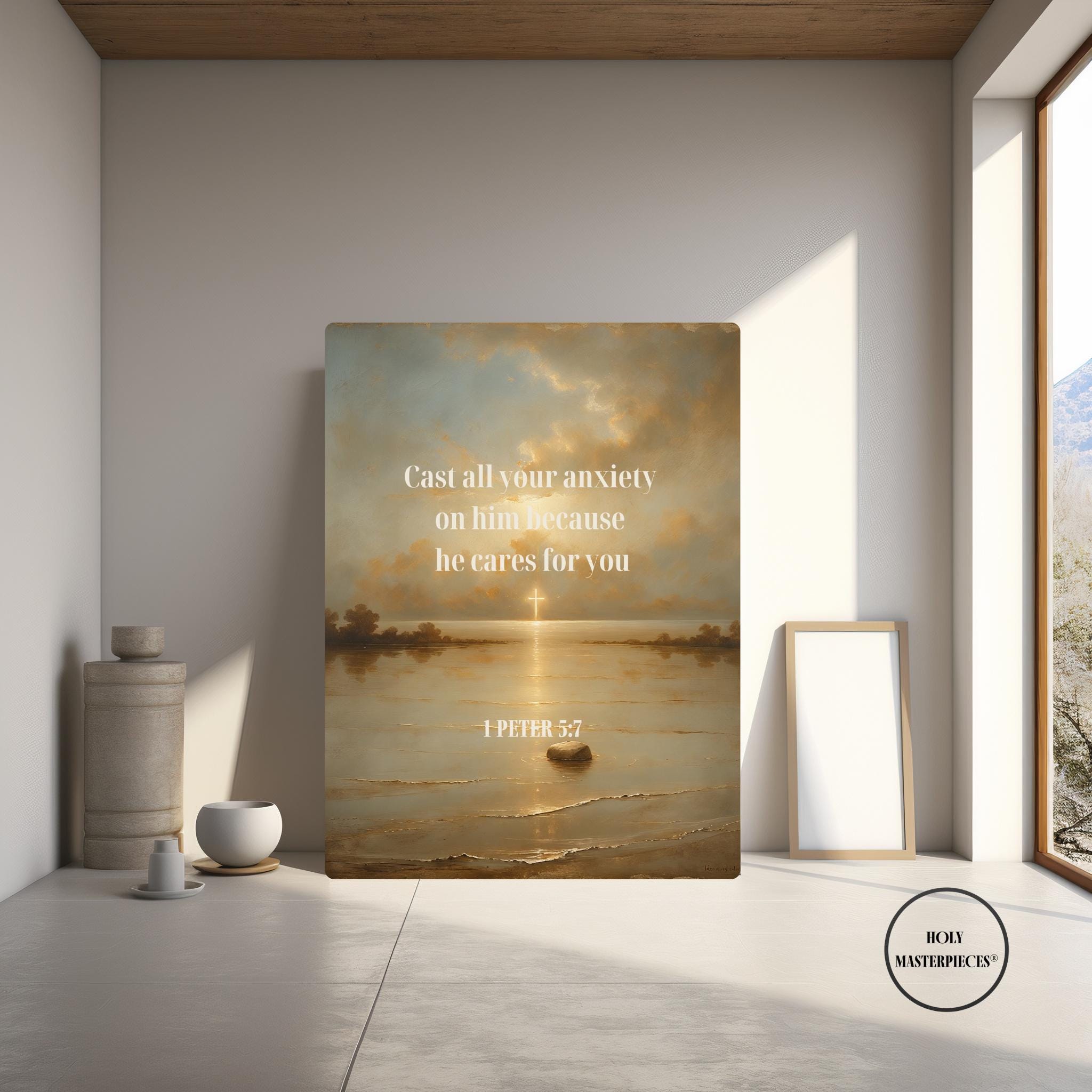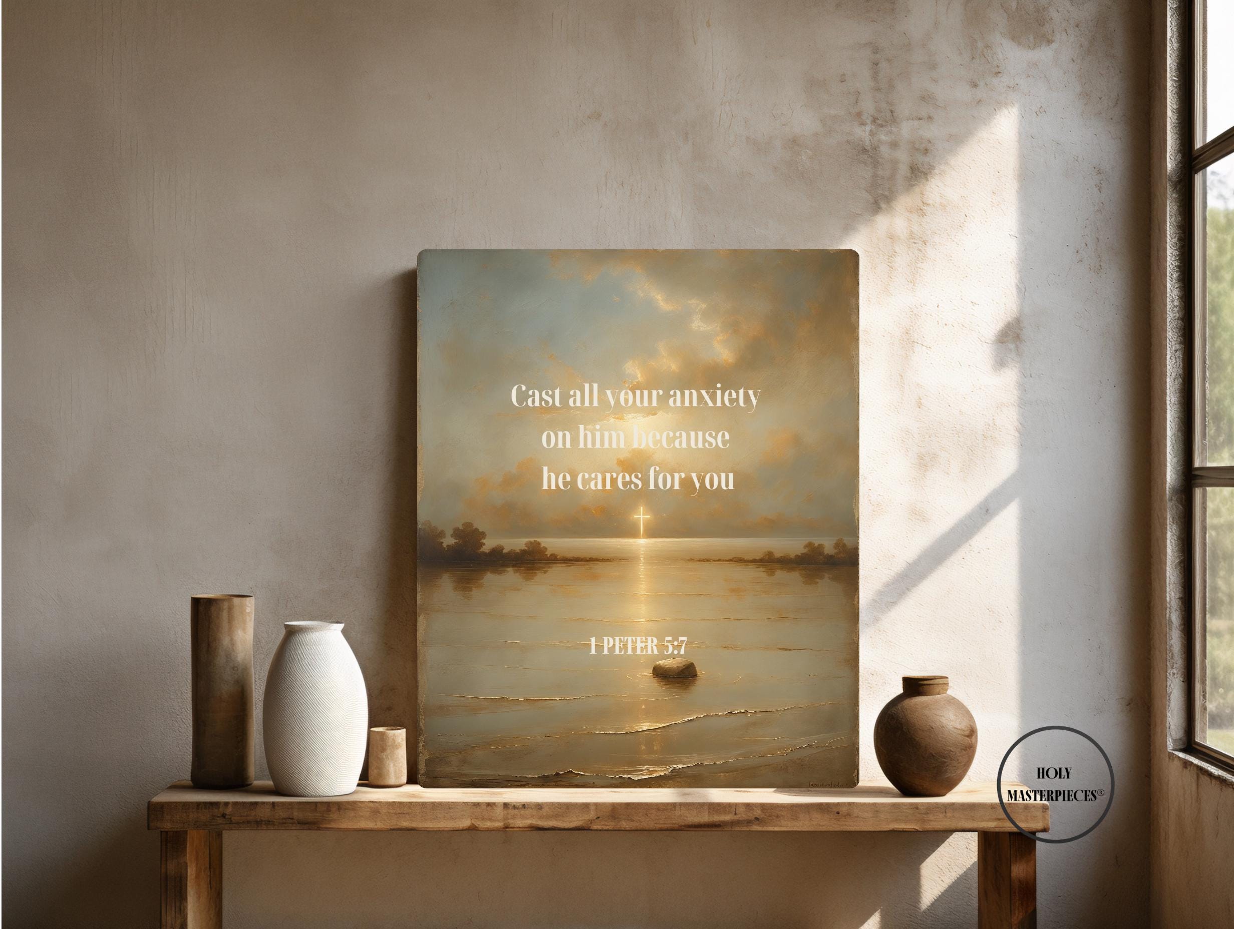 Cast All Your Anxiety on Him is a contemplative Christian scripture wall art piece inspired by 1 Peter 5:7, offering a visual meditation on surrender, trust, and God’s personal care. The composition portrays a peaceful shoreline at dawn, where still water and gentle light create an atmosphere of release, reassurance, and calm. This artwork is intentionally restrained, inviting the viewer to lay down burdens and rest in the promise of divine care.