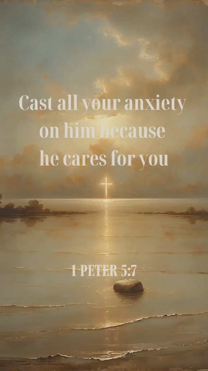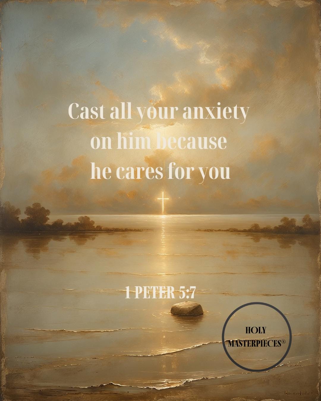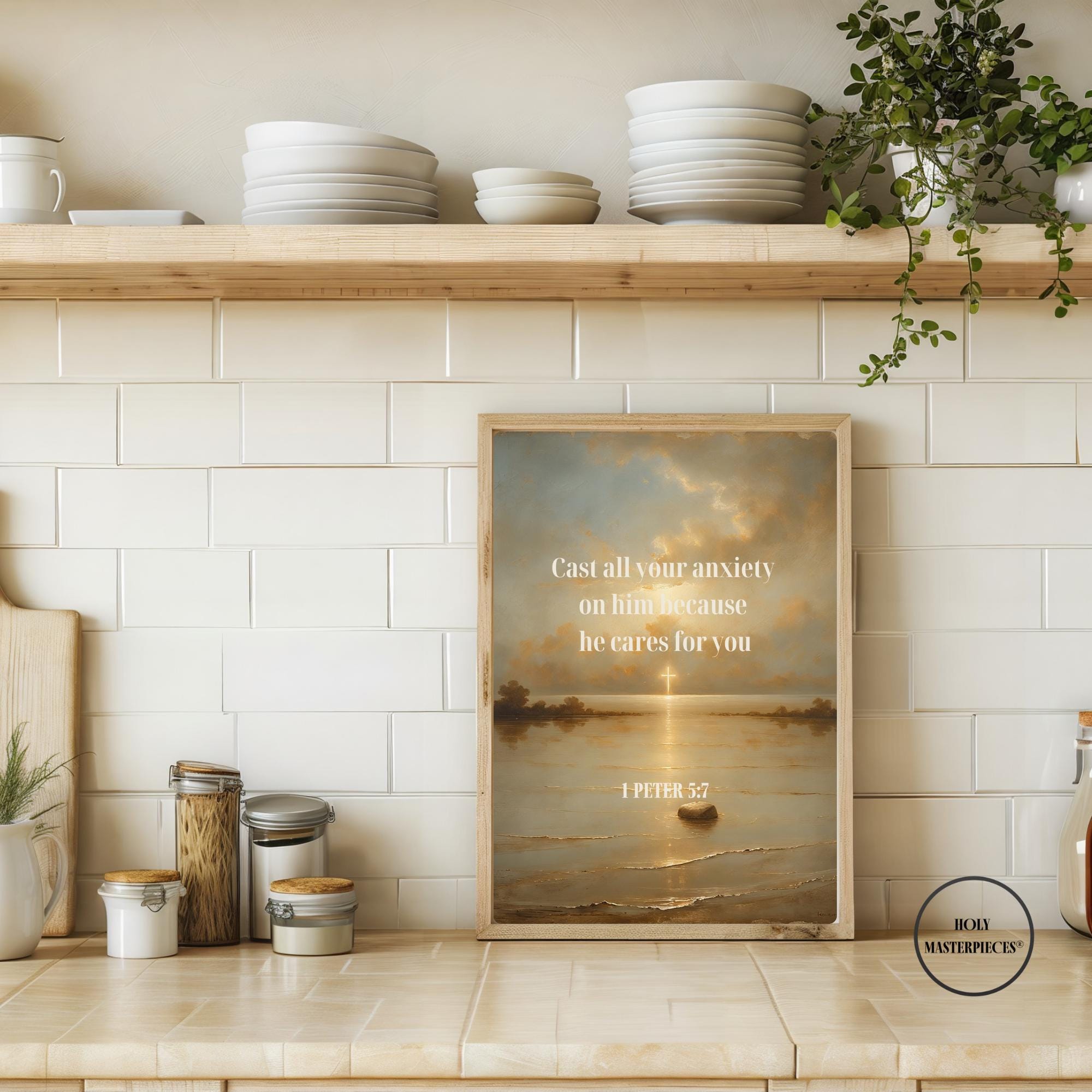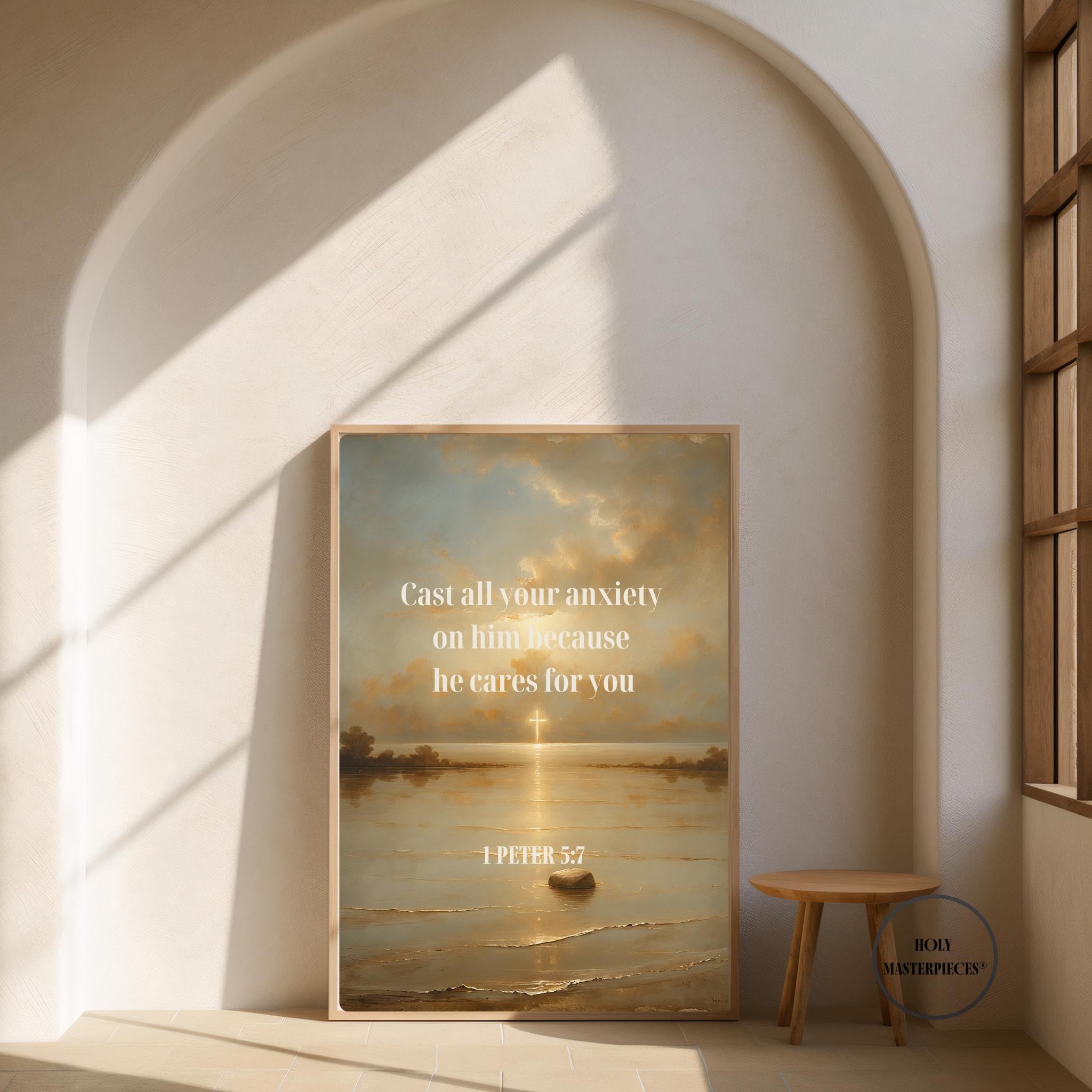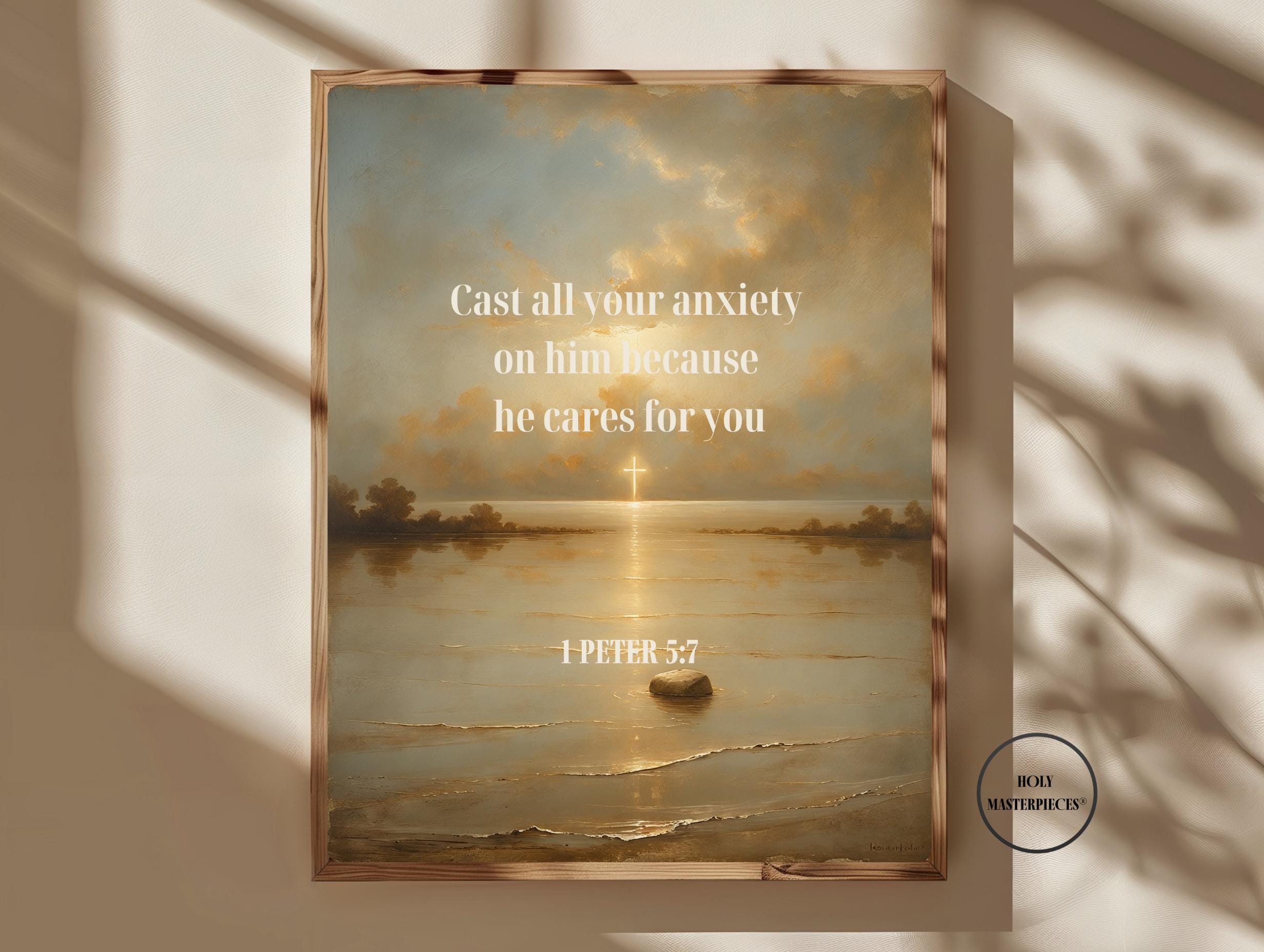 Cast All Your Anxiety on Him is a contemplative Christian scripture wall art piece inspired by 1 Peter 5:7, offering a visual meditation on surrender, trust, and God’s personal care. The composition portrays a peaceful shoreline at dawn, where still water and gentle light create an atmosphere of release, reassurance, and calm. This artwork is intentionally restrained, inviting the viewer to lay down burdens and rest in the promise of divine care.