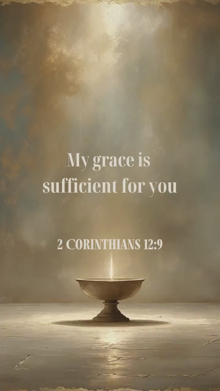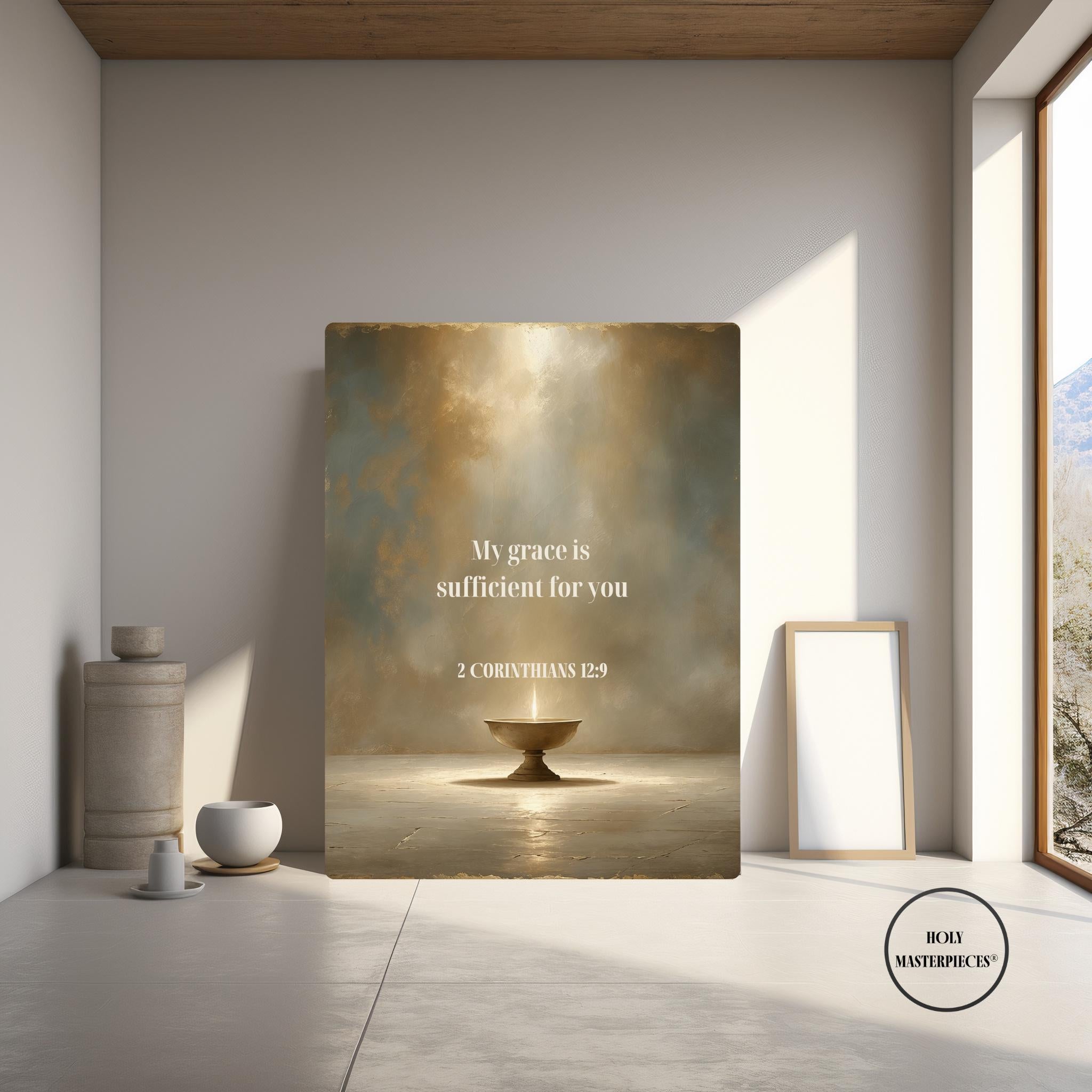 This contemplative scripture artwork is inspired by 2 Corinthians 12:9, presenting a quiet and reverent visual meditation on grace, sufficiency, and strength found in God alone. The composition centers on a calm, contained presence of light within a subdued atmosphere, symbolising grace that sustains without spectacle or force. The scene is intentionally restrained, creating space for reflection, humility, and prayer.
