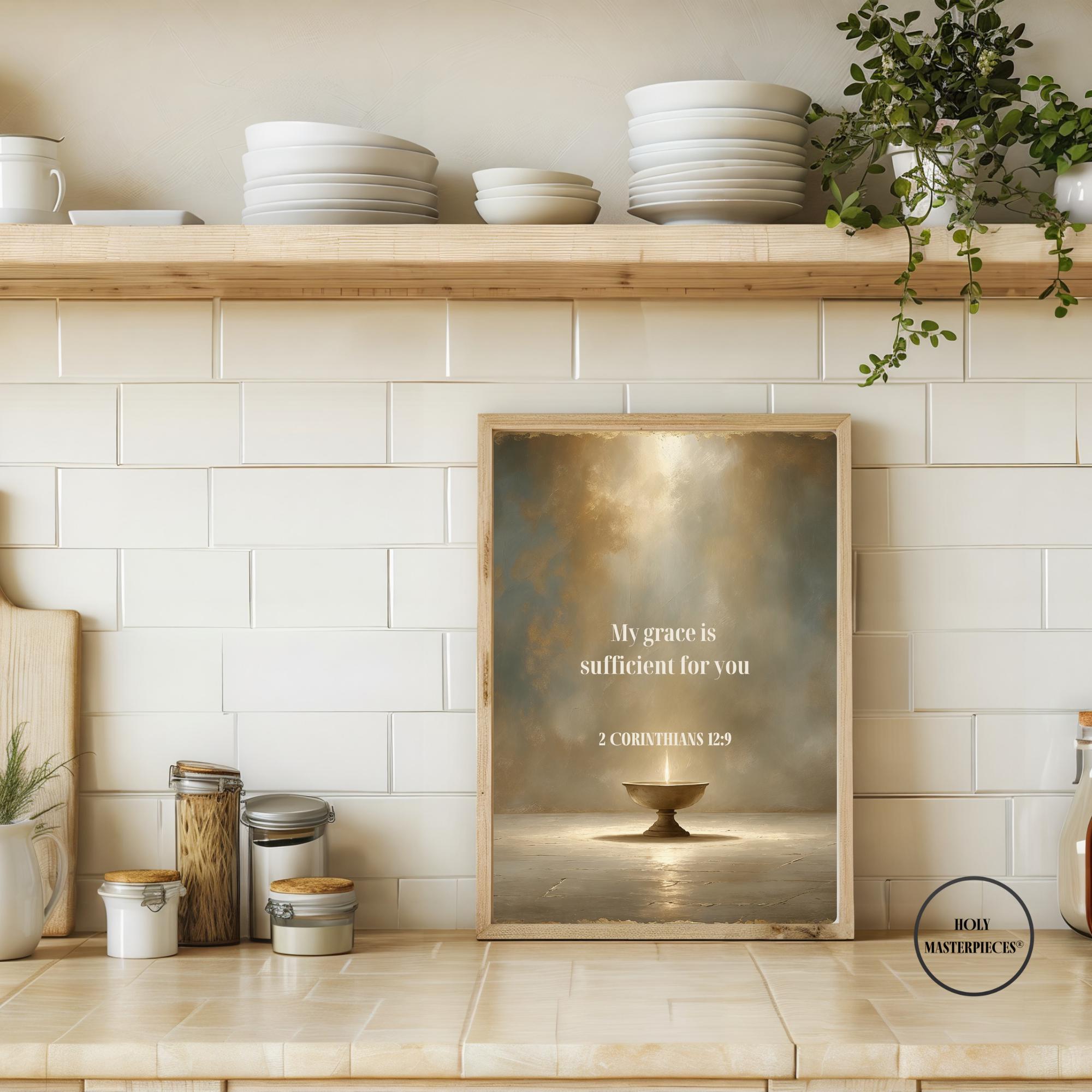 Created in the tradition of 17th-century Western sacred oil painting, the artwork uses a muted devotional palette, softened textures, and subtle chiaroscuro to achieve a warm, timeless atmosphere. The light rests gently within the composition, conveying reassurance and sufficiency rather than triumph. The scripture text is rendered in a classical serif typeface, preserving the painterly integrity of the image while supporting its devotional purpose.