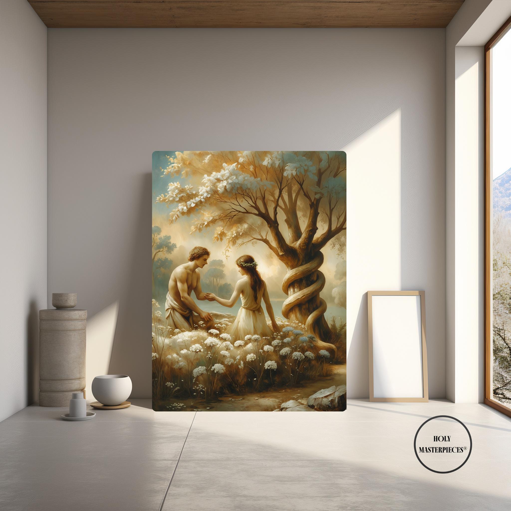 Inspired by Western sacred oil painting, the artwork features softened edges, painterly surface detail, and gentle chiaroscuro modelling. The composition avoids narrative excess, focusing instead on stillness, theological symbolism, and timeless atmosphere. Its museum-like finish makes it well suited for prayer rooms, study spaces, chapels, or Christian homes seeking thoughtful reflection on creation and humanity’s origins.