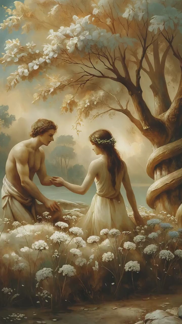 The serpent appears symbolically, coiled around the tree trunk without aggression, allowing the scene to maintain a sacred and contemplative tone. Blossoming branches and softened foliage surround the figures in warm golds, muted greens, and natural earth tones. Light garments fall in sculptural folds enriched with visible oil-textured brushwork, grounding the composition in classical devotional aesthetics.
