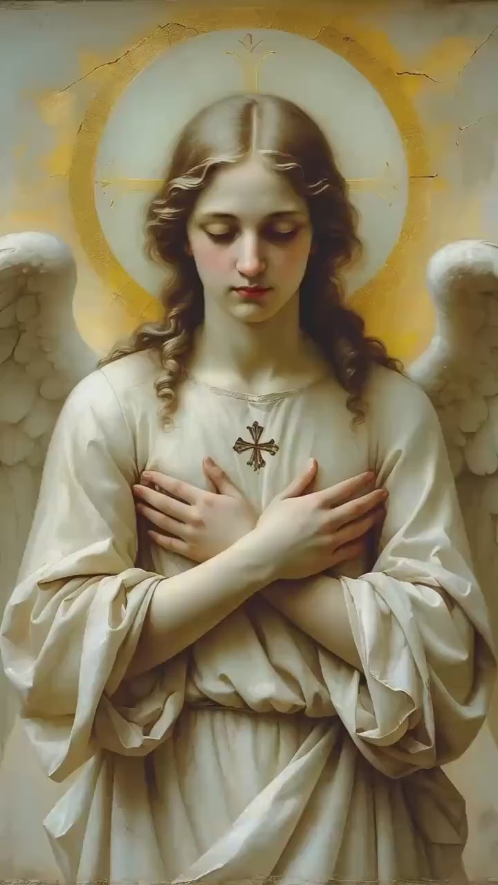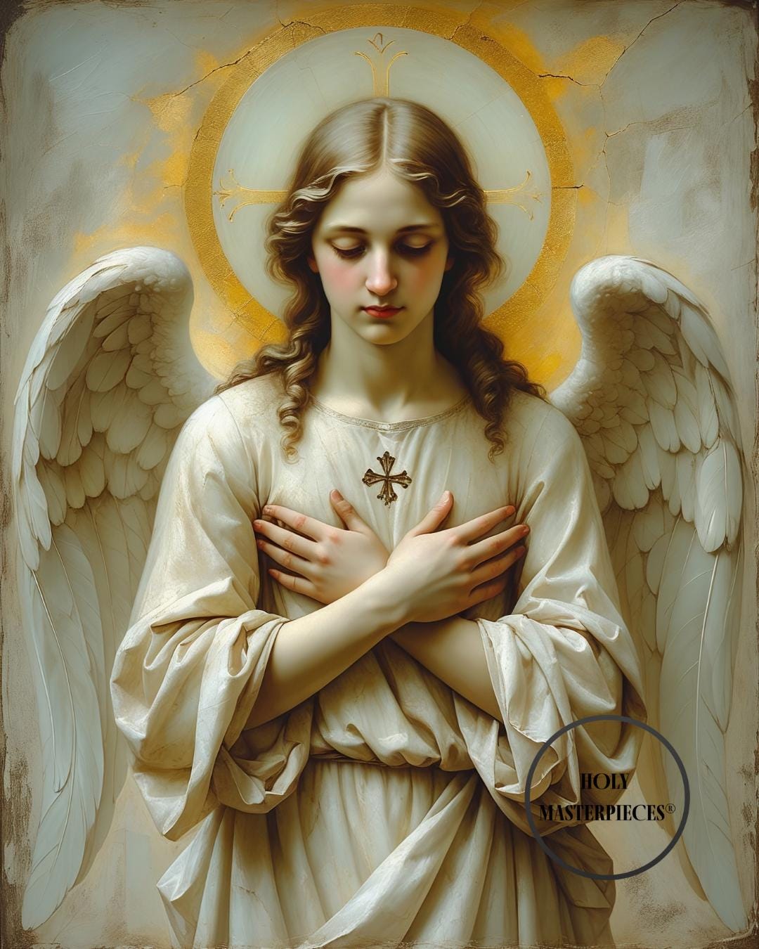 • Angel of Peace — A serene devotional portrait of the Angel of Peace shown with arms crossed in calm reverence. Warm, soft light surrounds the figure, with a radiant golden halo creating a gentle sacred glow. The restrained posture, delicate brushwork, and muted palette convey quiet comfort, prayerful stillness, and inner calm.