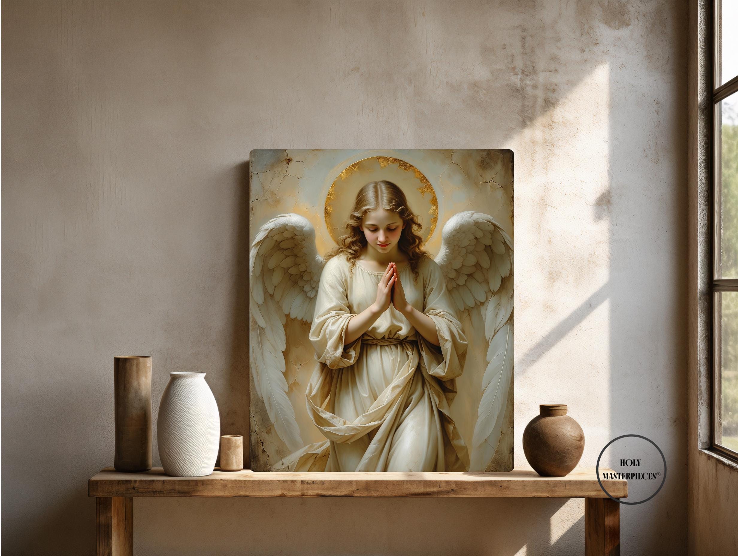 This sacred art bundle presents two serene devotional artworks depicting heavenly guardians in moments of quiet prayer and reverence. Together, these pieces offer a unified visual meditation on peace, protection, and gentle divine presence, creating a calm and reassuring atmosphere for prayer spaces, bedrooms, or sacred corners of the home.
