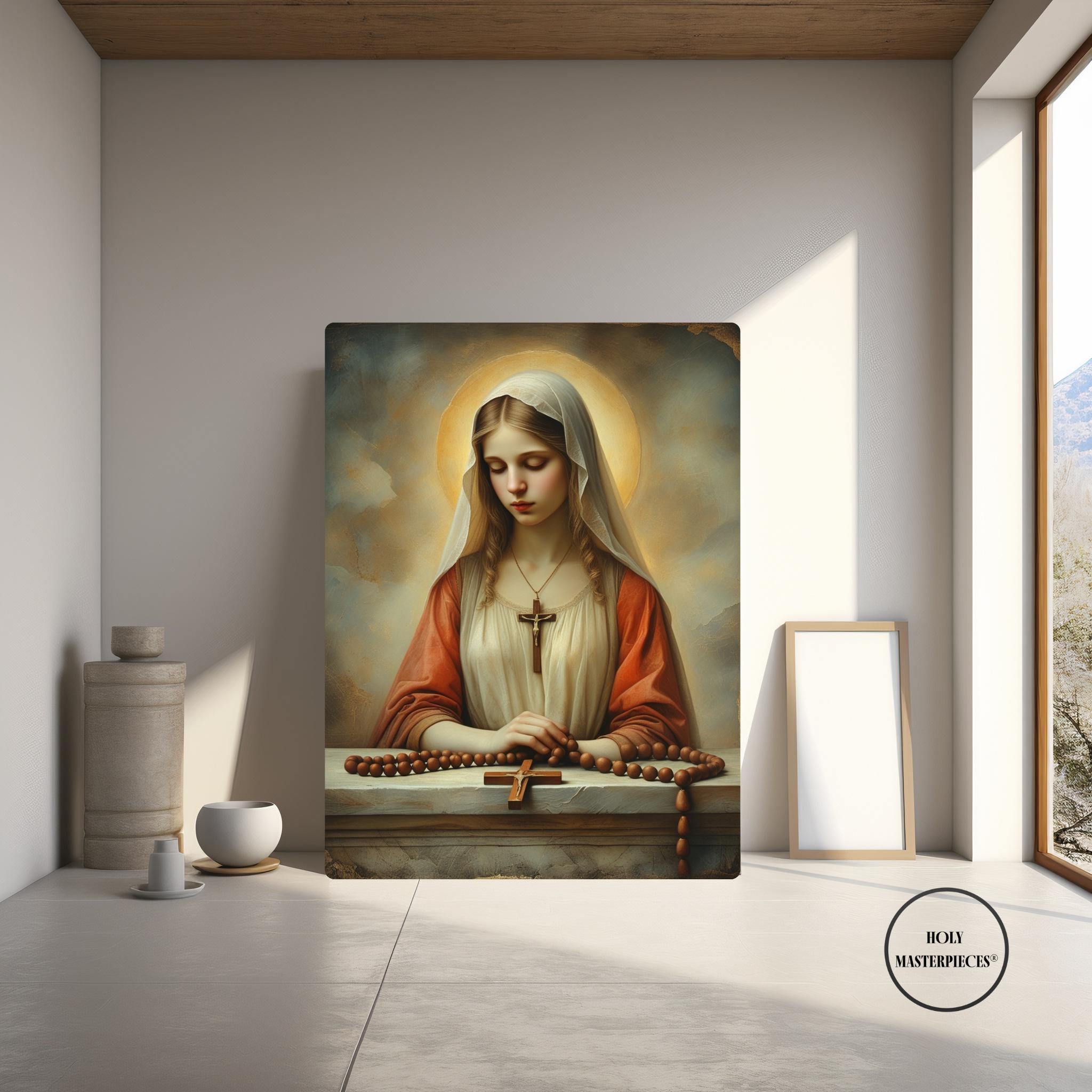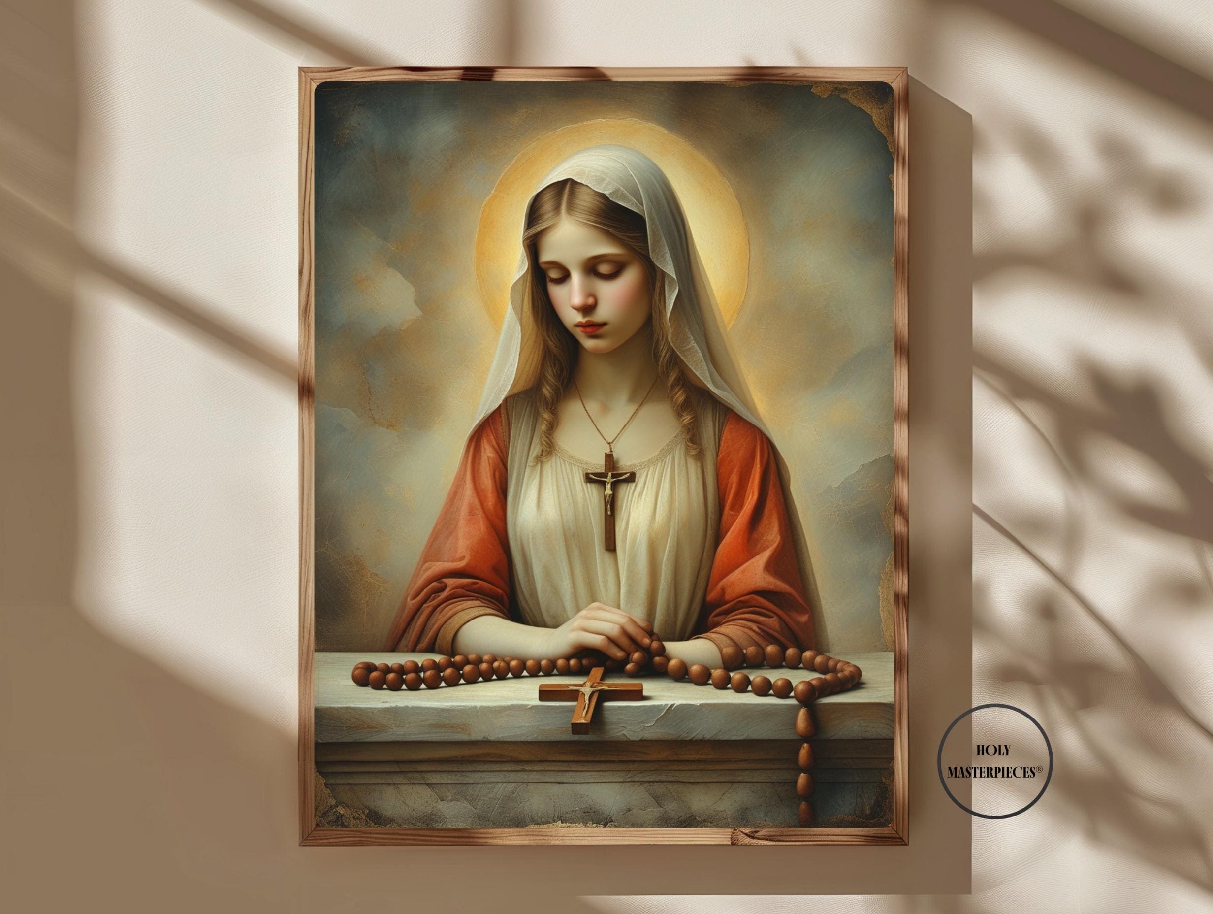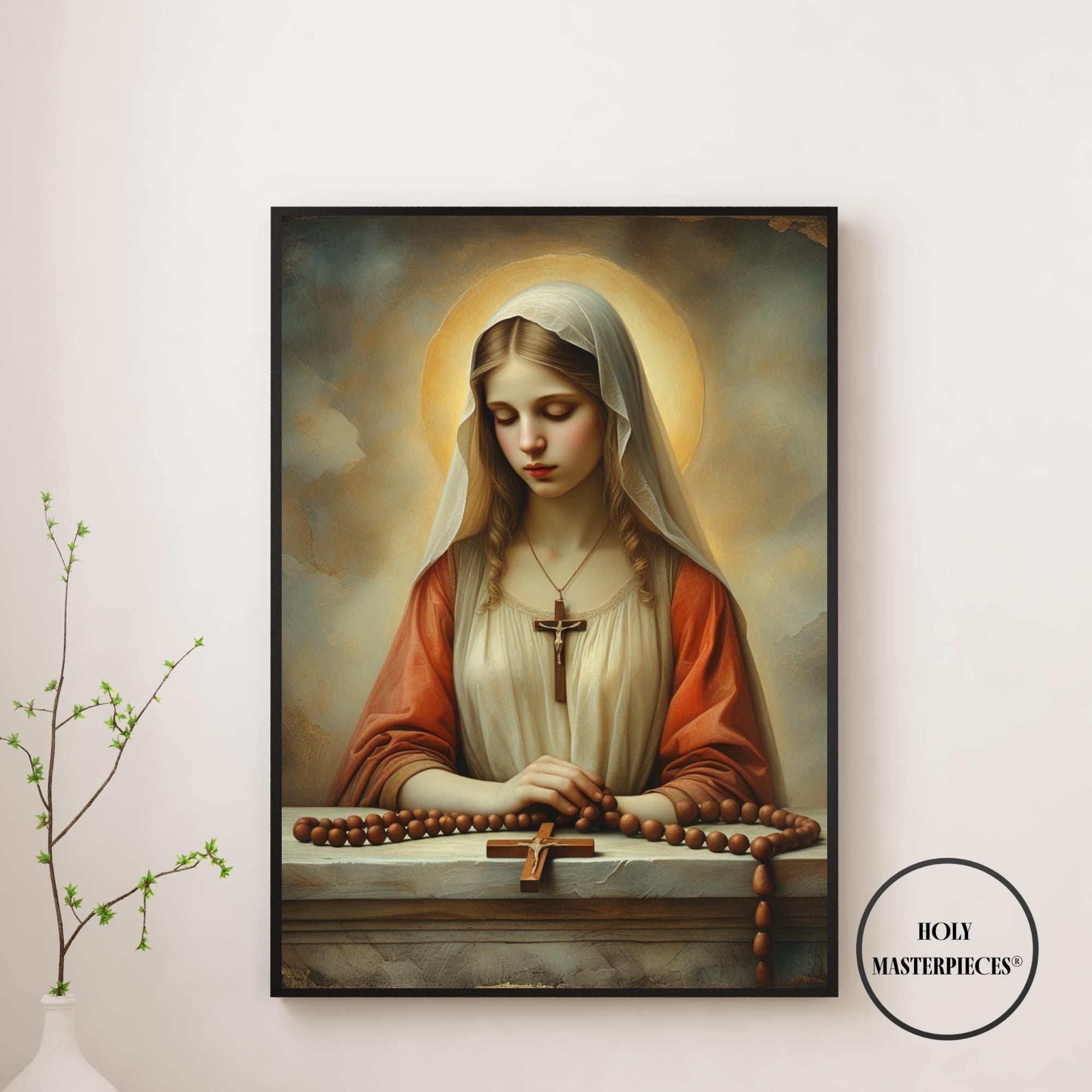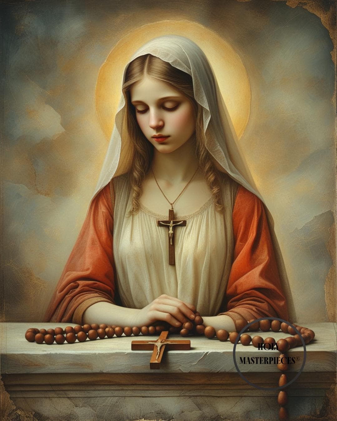 Beads of Faith is a contemplative depiction of the Virgin Mary in quiet prayer, her hands gently resting upon a rosary laid before her. The composition centers on stillness and interior devotion, with her lowered gaze and calm posture conveying focused reverence. The rosary beads stretch across the foreground as a visual anchor, symbolizing perseverance in prayer, meditation, and trust in God, making this piece especially fitting as Catholic rosary wall art for dedicated prayer spaces.