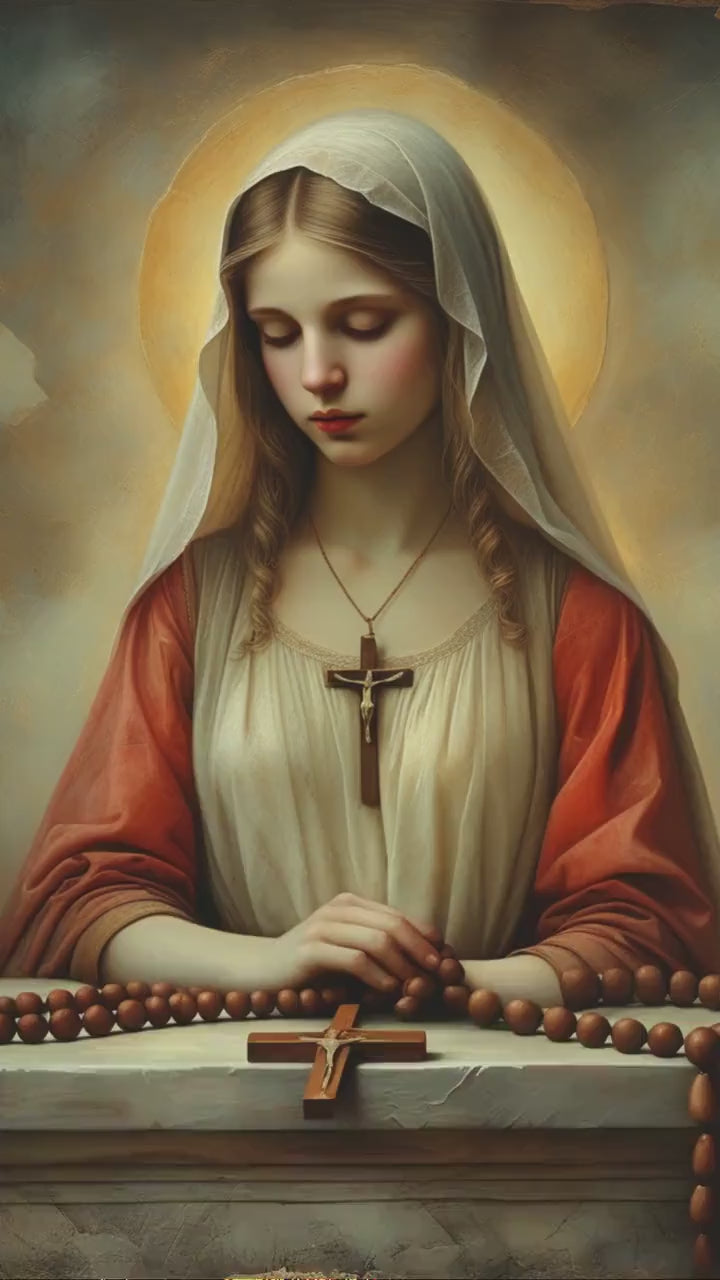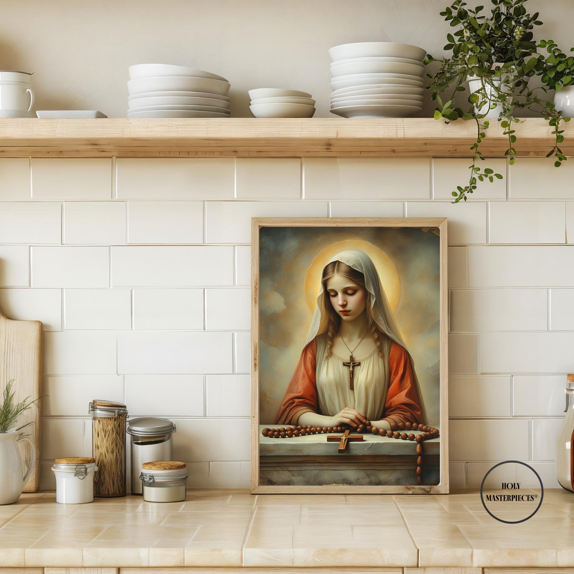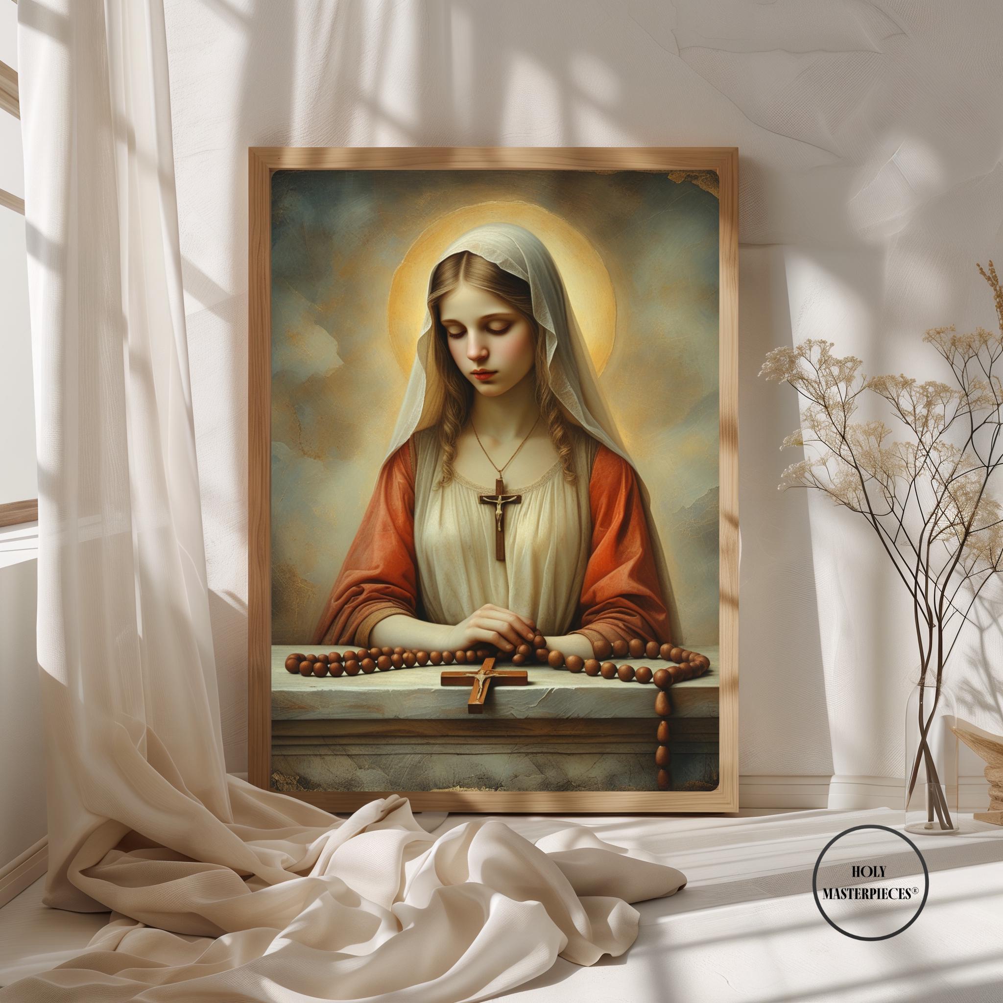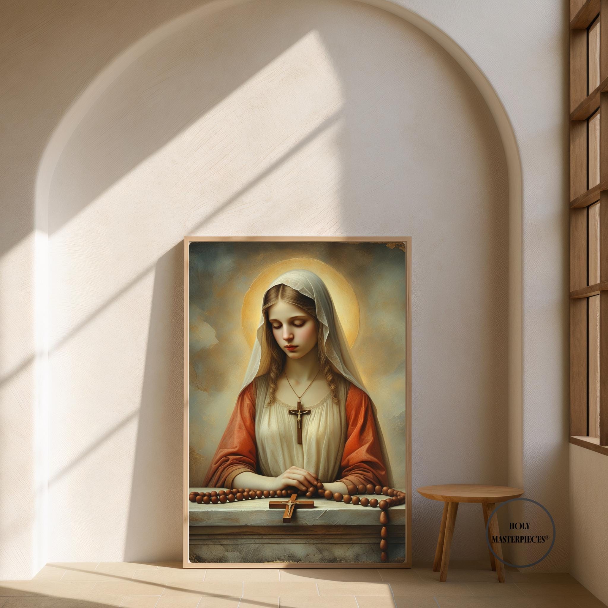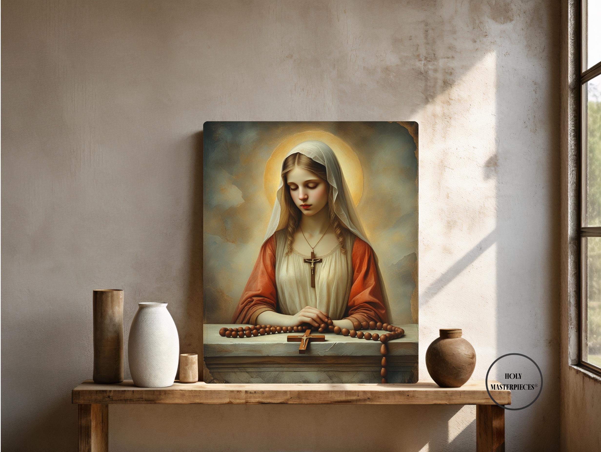 Beads of Faith is a contemplative depiction of the Virgin Mary in quiet prayer, her hands gently resting upon a rosary laid before her. The composition centers on stillness and interior devotion, with her lowered gaze and calm posture conveying focused reverence. The rosary beads stretch across the foreground as a visual anchor, symbolizing perseverance in prayer, meditation, and trust in God, making this piece especially fitting as Catholic rosary wall art for dedicated prayer spaces.