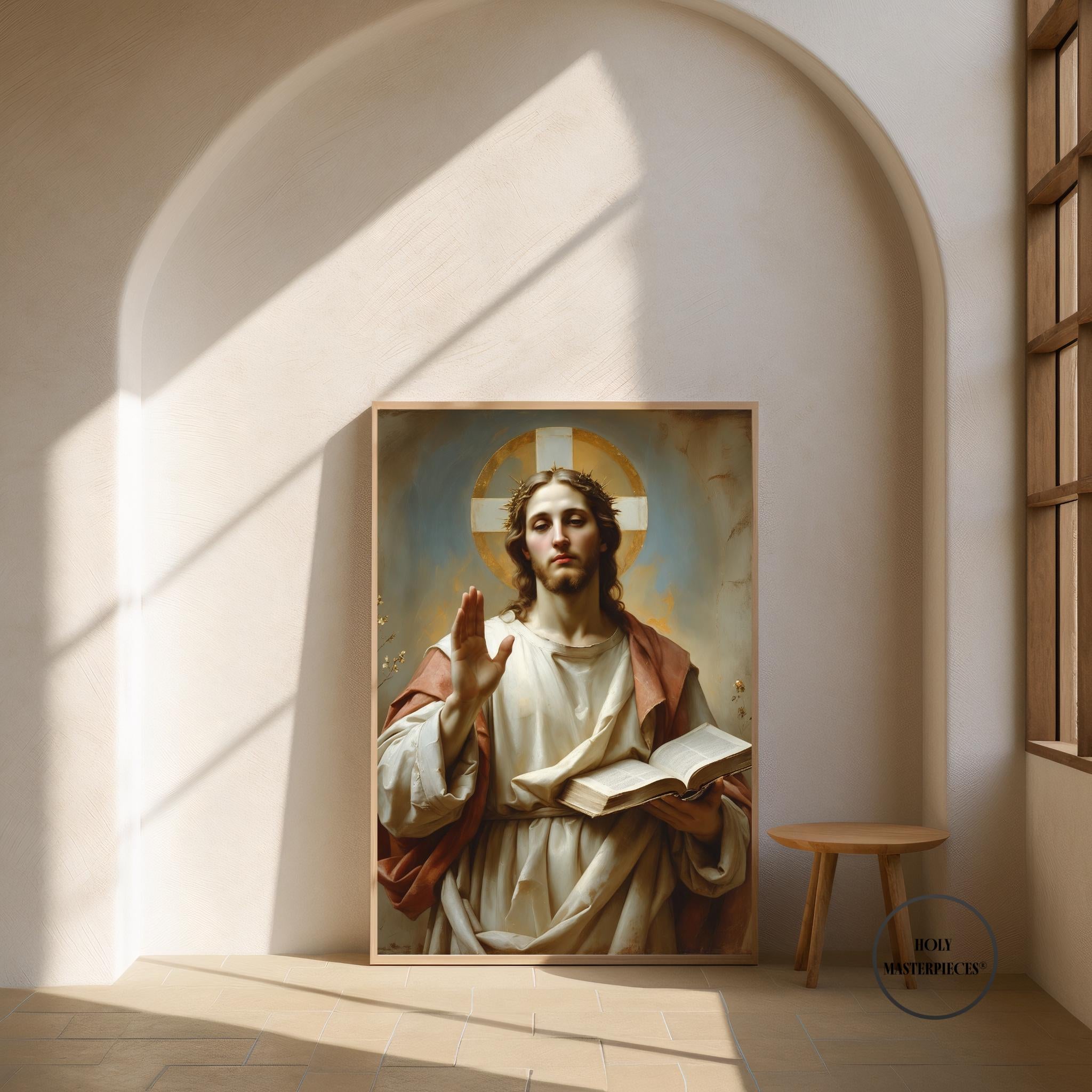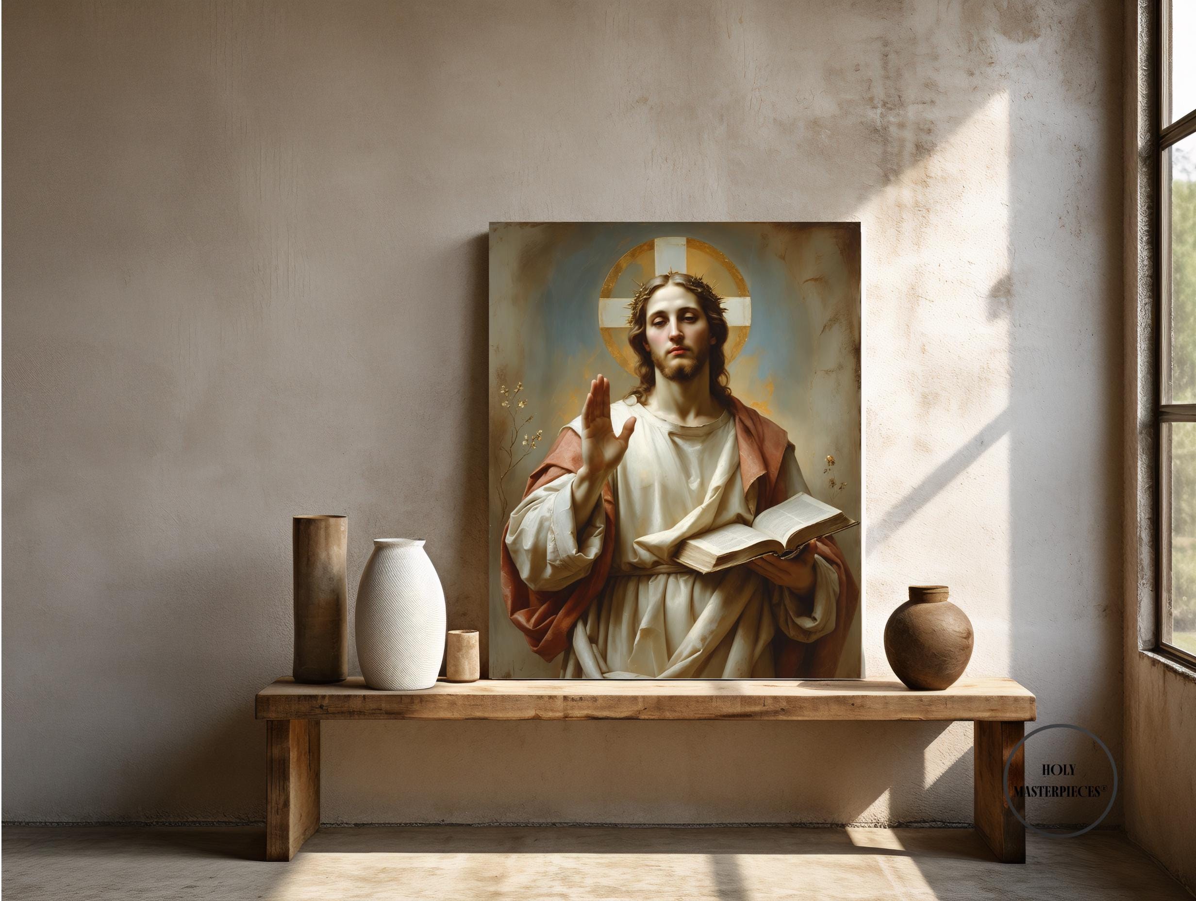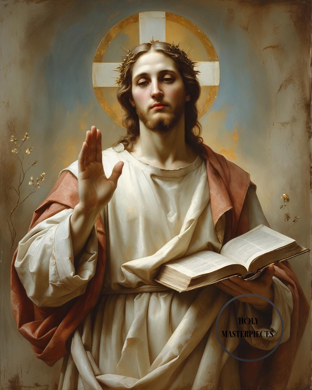 A calm and authoritative depiction of Christ Pantocrator, portrayed in the Western sacred tradition as Lord, Teacher, and Judge of all creation. Christ is shown frontally, raising His hand in blessing while holding the open Scriptures, symbolising divine wisdom, mercy, and sovereign truth.