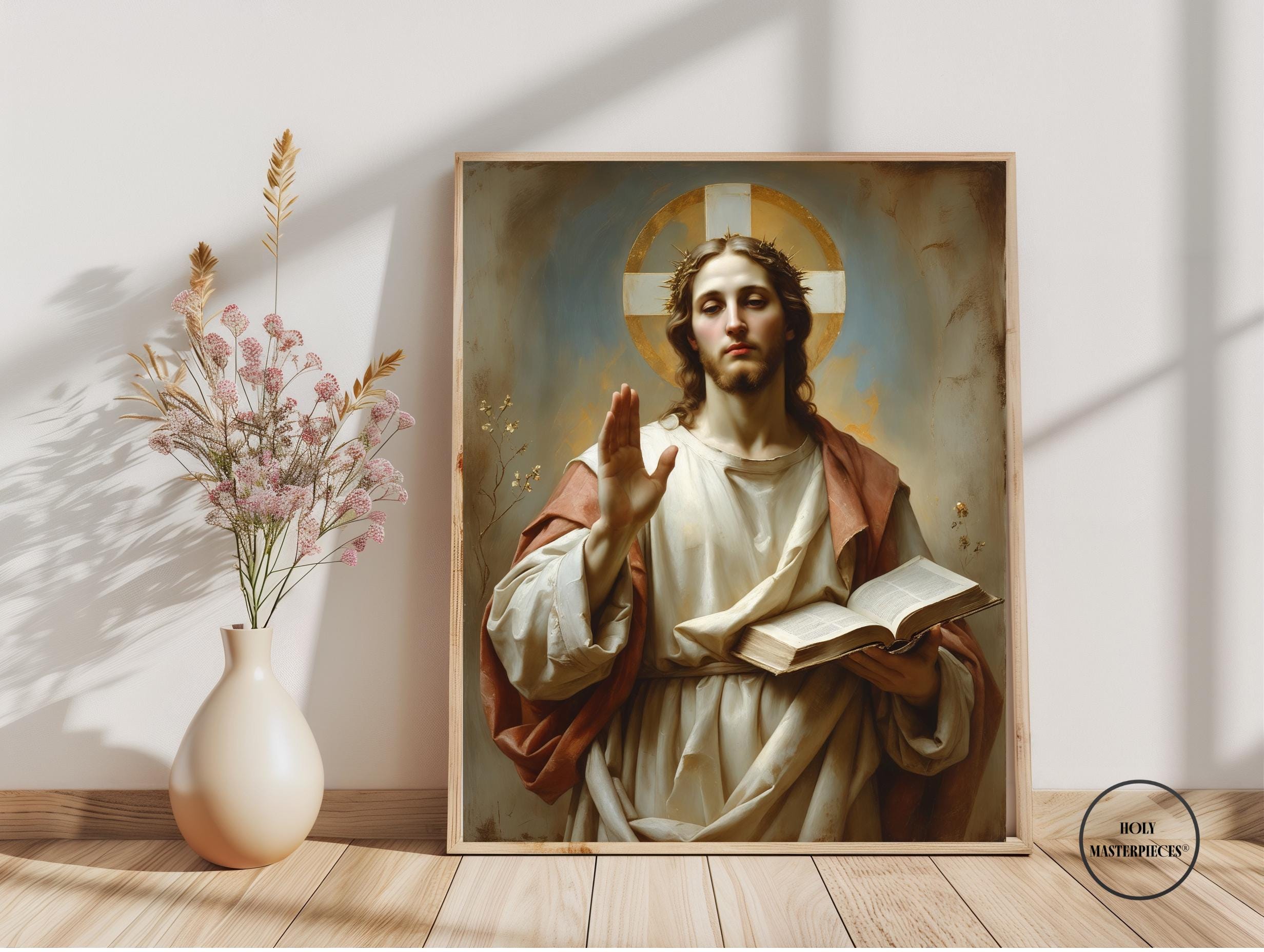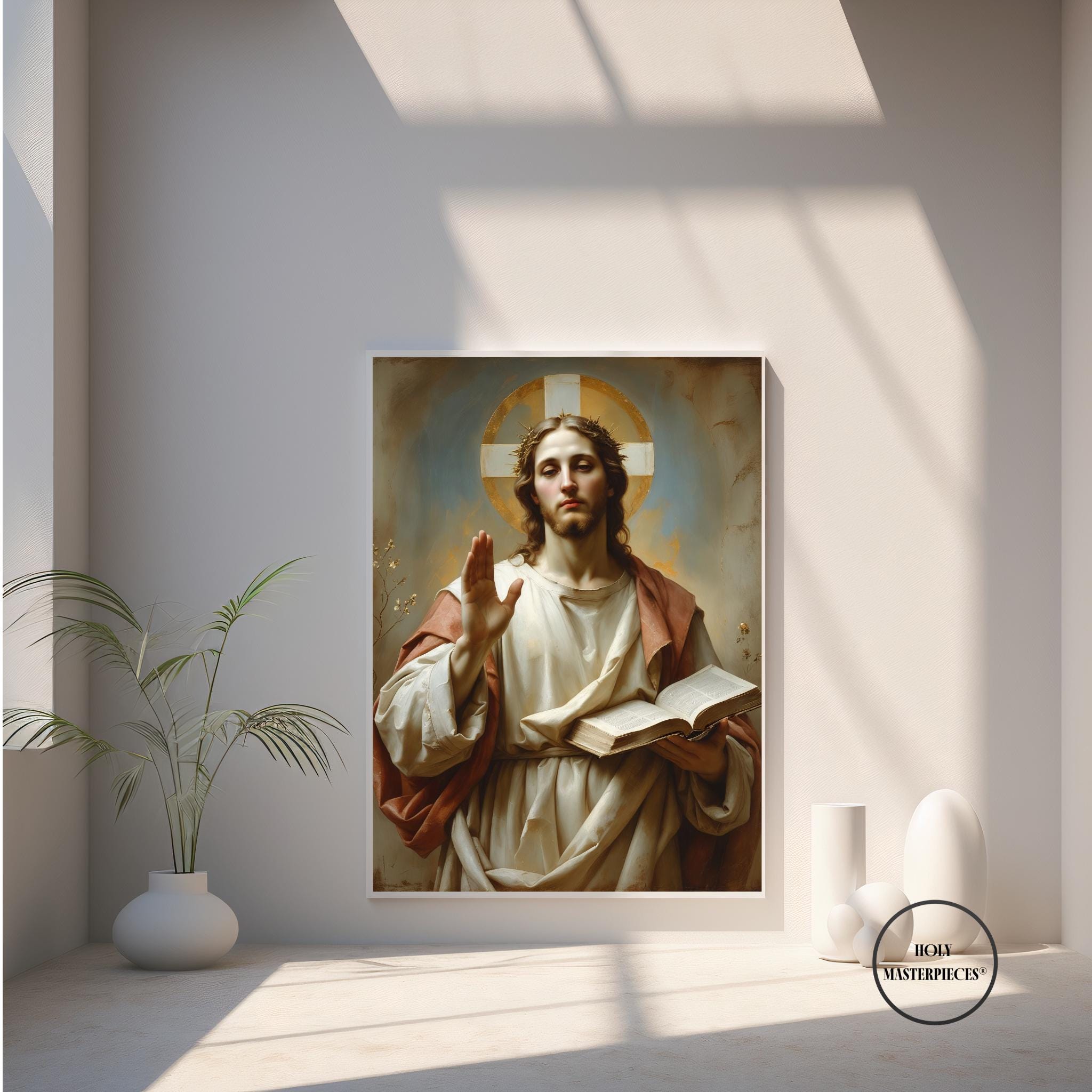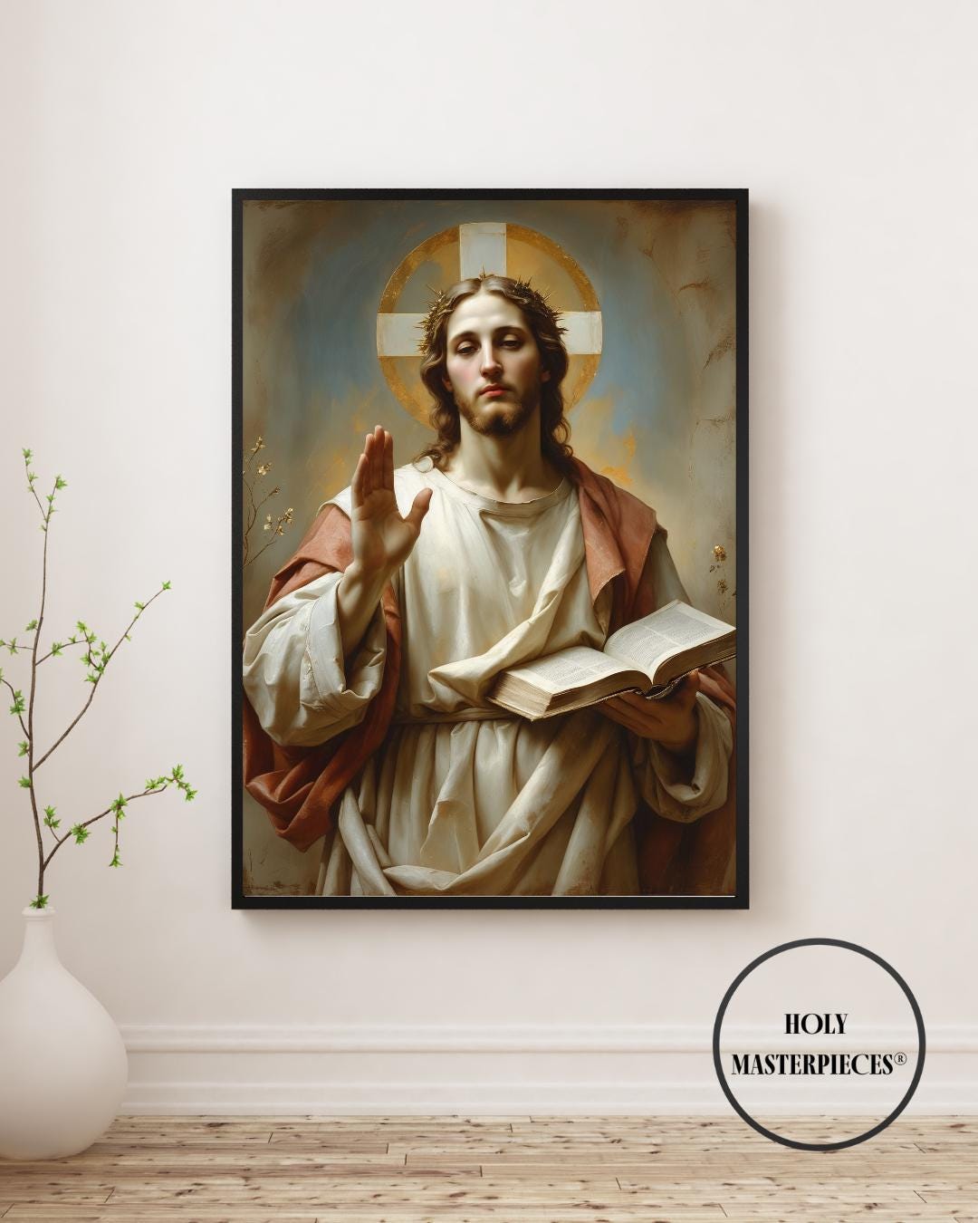 A calm and authoritative depiction of Christ Pantocrator, portrayed in the Western sacred tradition as Lord, Teacher, and Judge of all creation. Christ is shown frontally, raising His hand in blessing while holding the open Scriptures, symbolising divine wisdom, mercy, and sovereign truth.