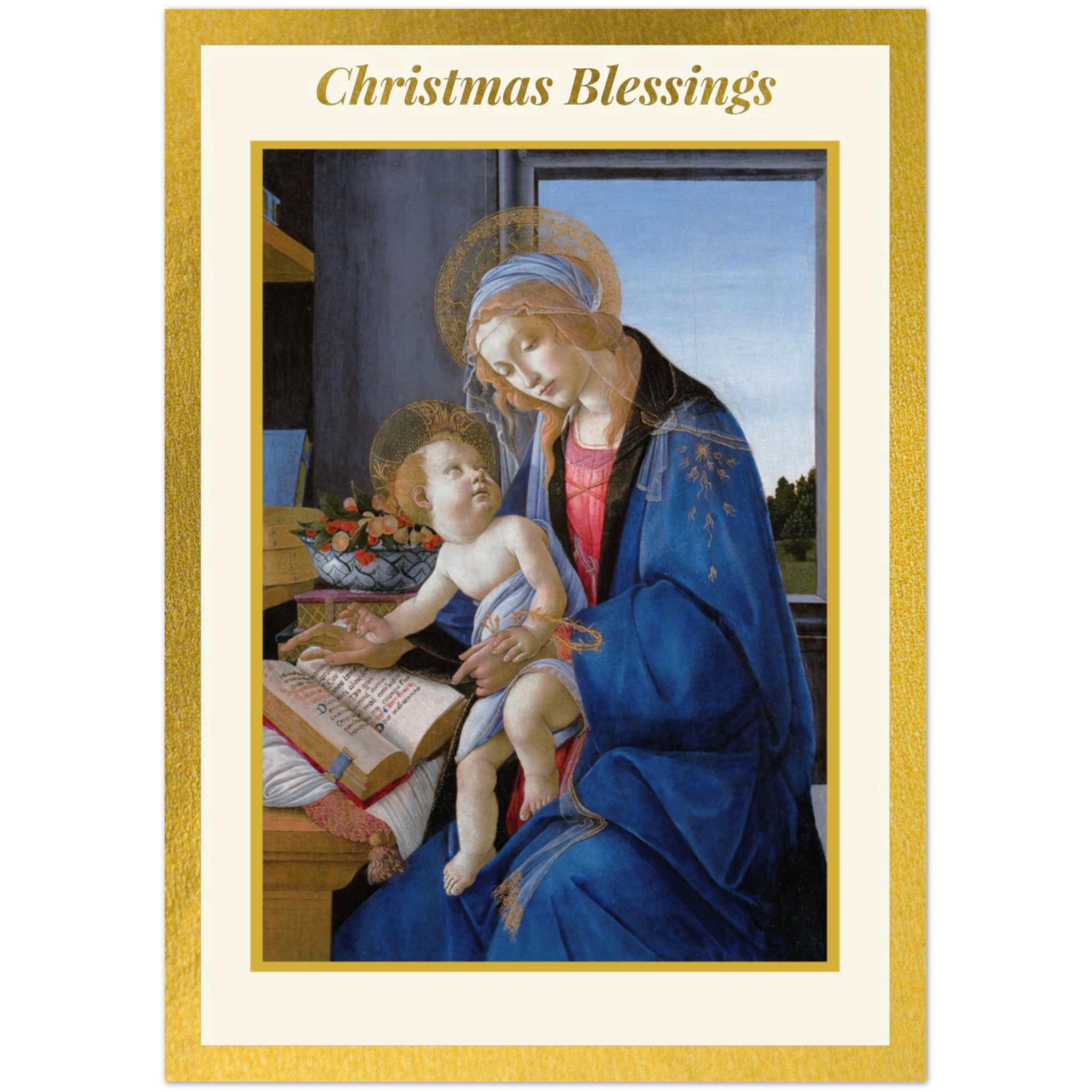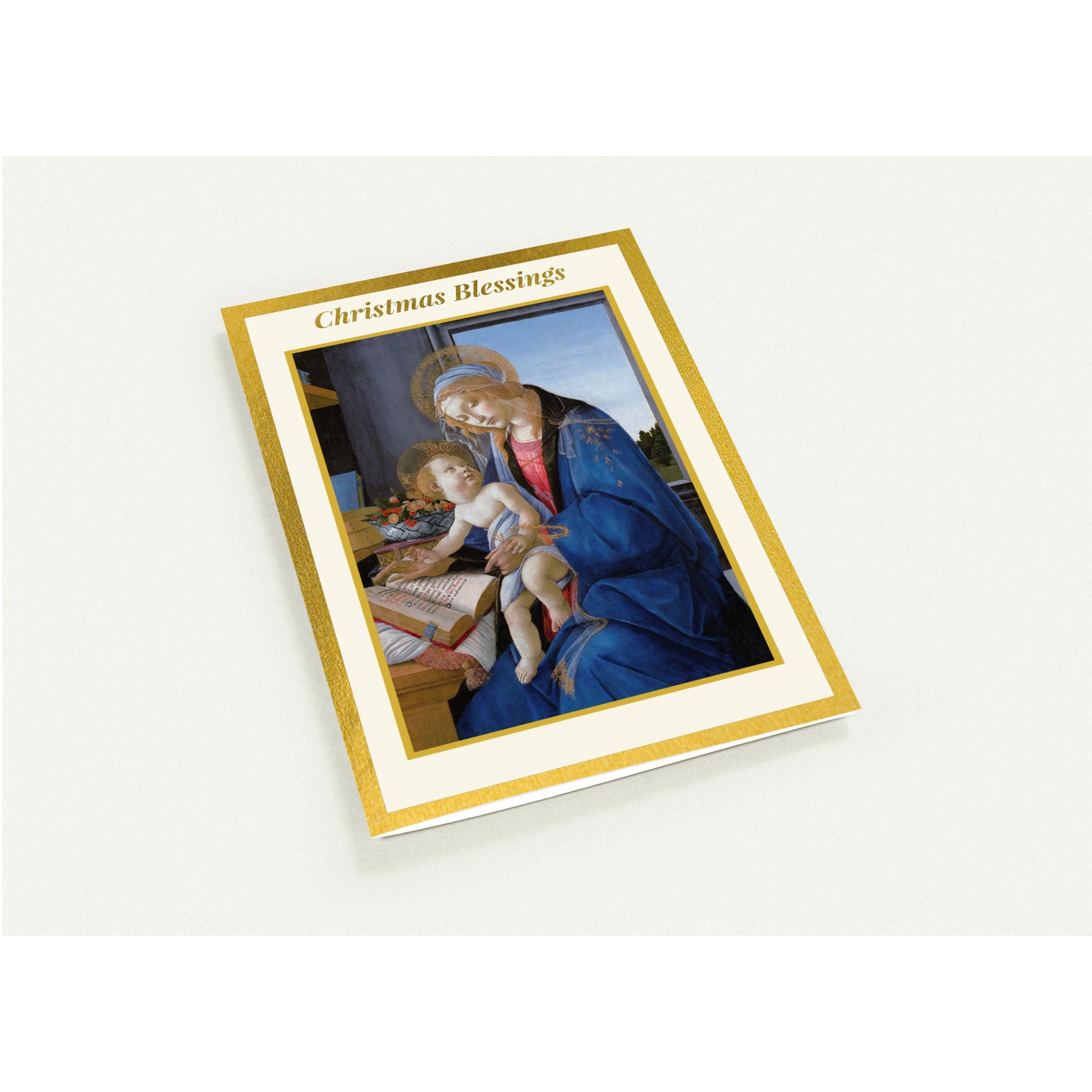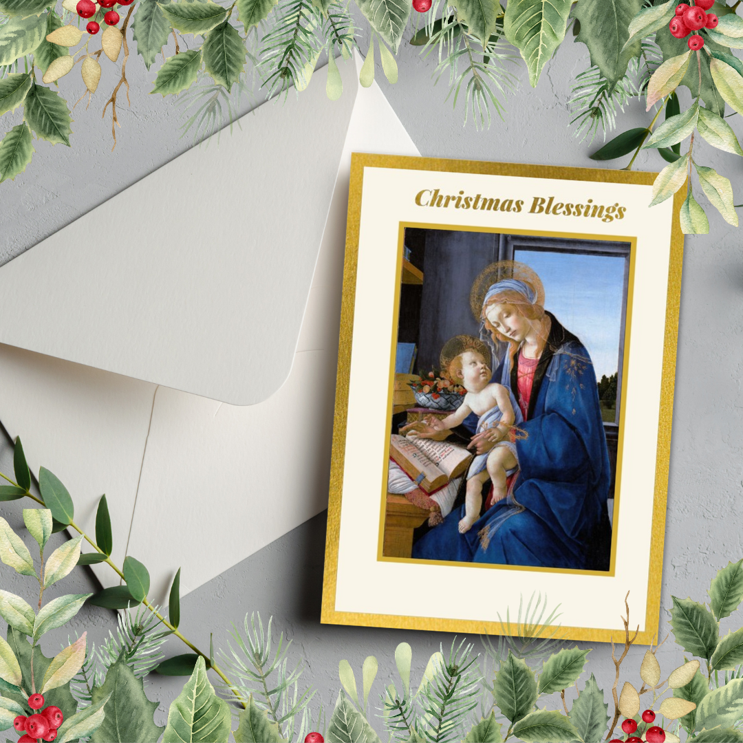 Share the beauty of faith and art this season with our Holy Masterpieces “Christmas Blessings” card set, featuring Sandro Botticelli’s The Virgin and Child (Madonna of the Book) (1480).
