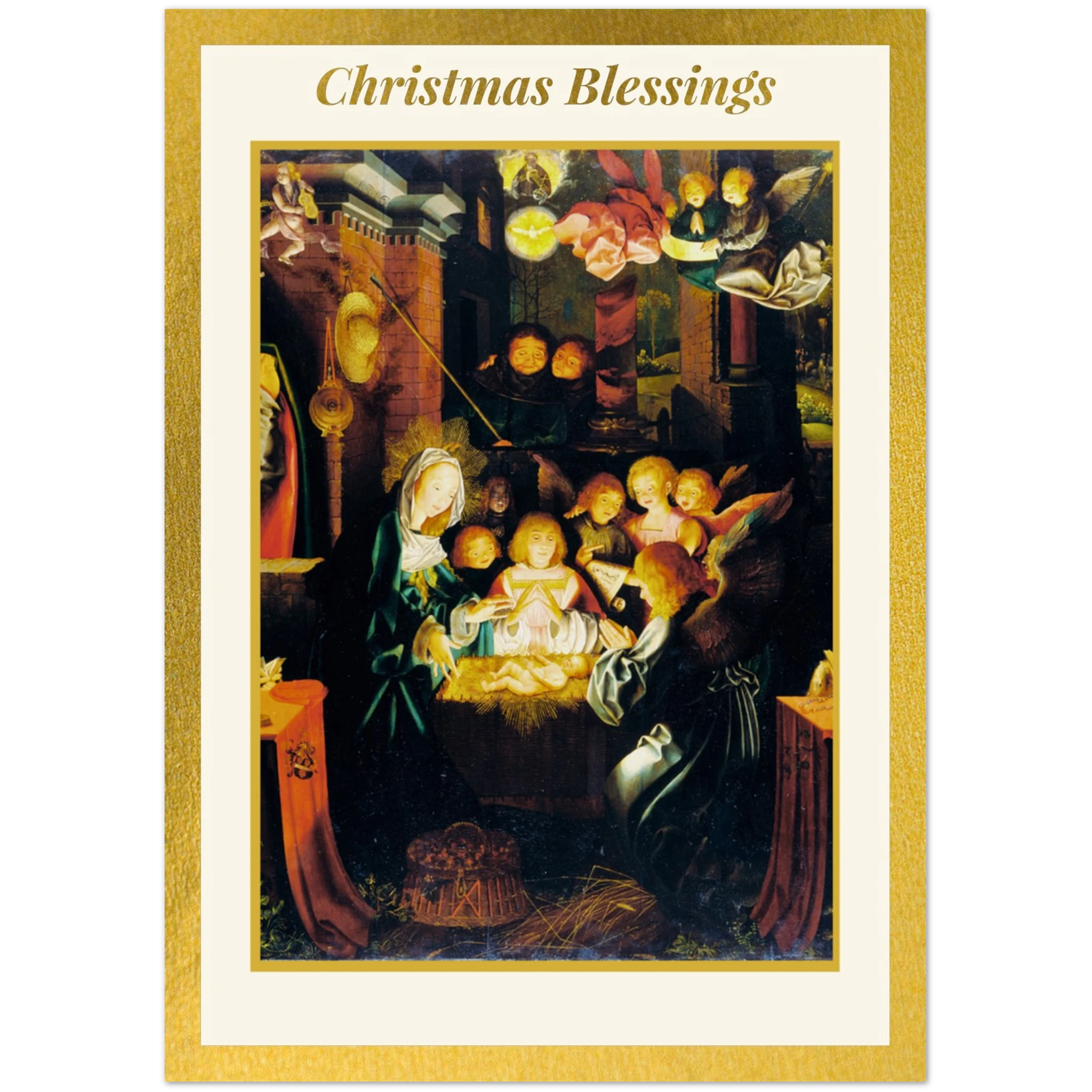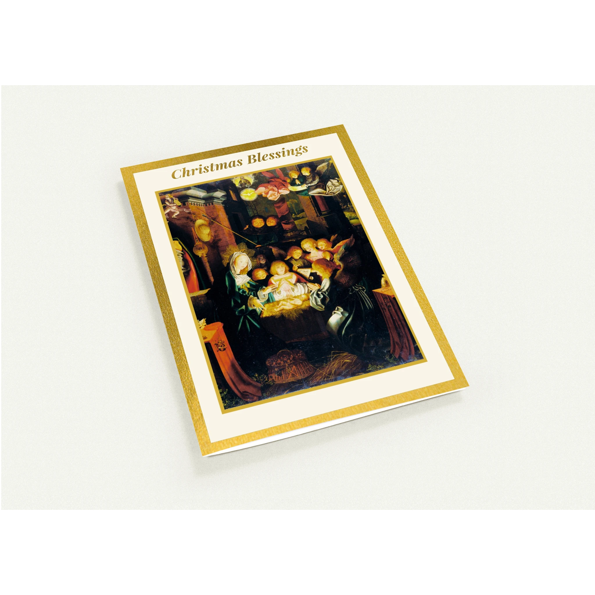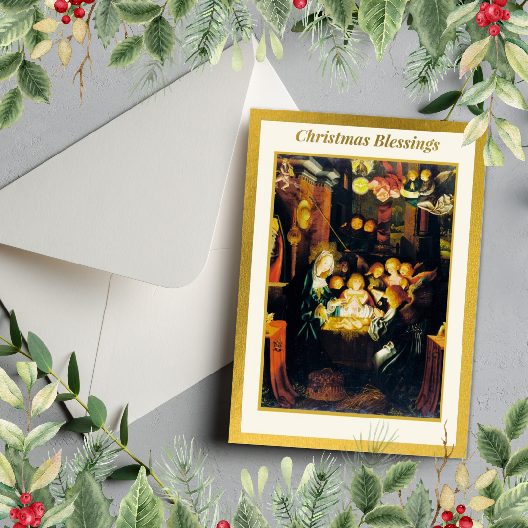 Illuminate your Christmas with timeless sacred art through our Holy Masterpieces “Christmas Blessings” card set, featuring The Nativity with the Donors Peter von Clapis and Bela Bonenberg (1516) by Barthel Bruyn the Elder.