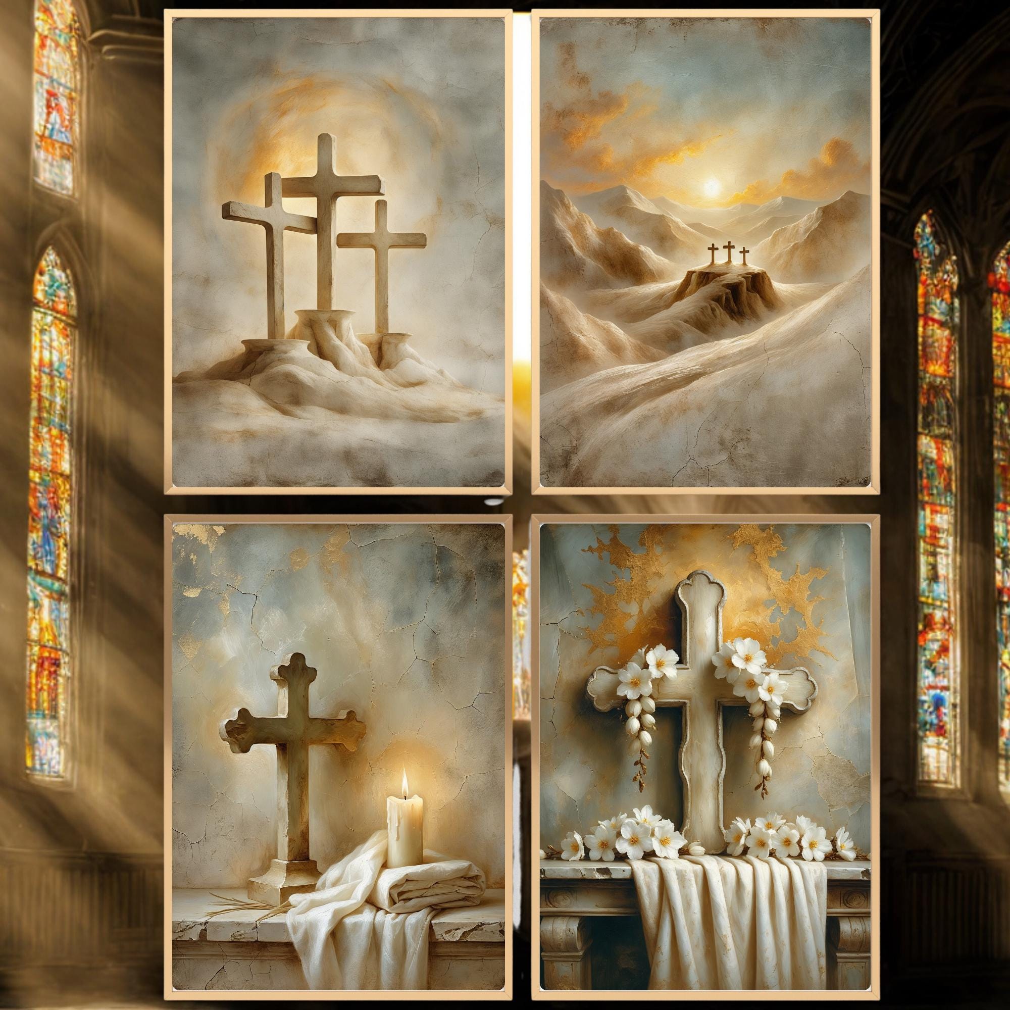 This sacred art bundle presents four contemplative depictions centered on the Cross of Christ — the enduring symbol of sacrifice, mercy, and redemption. Rendered with restraint and reverence, these artworks invite reflection on the mystery of Christ’s Passion and the quiet hope born from His offering.