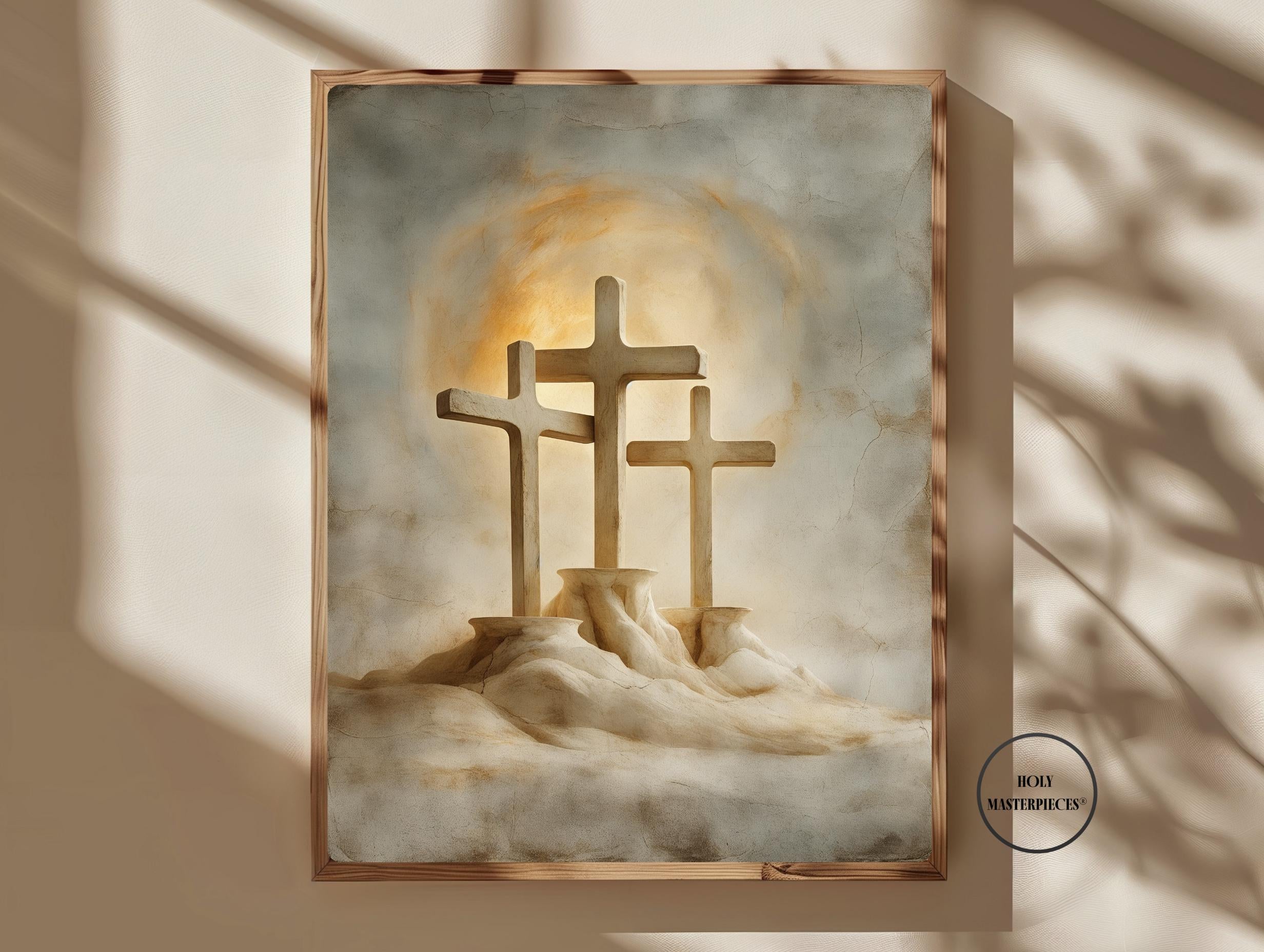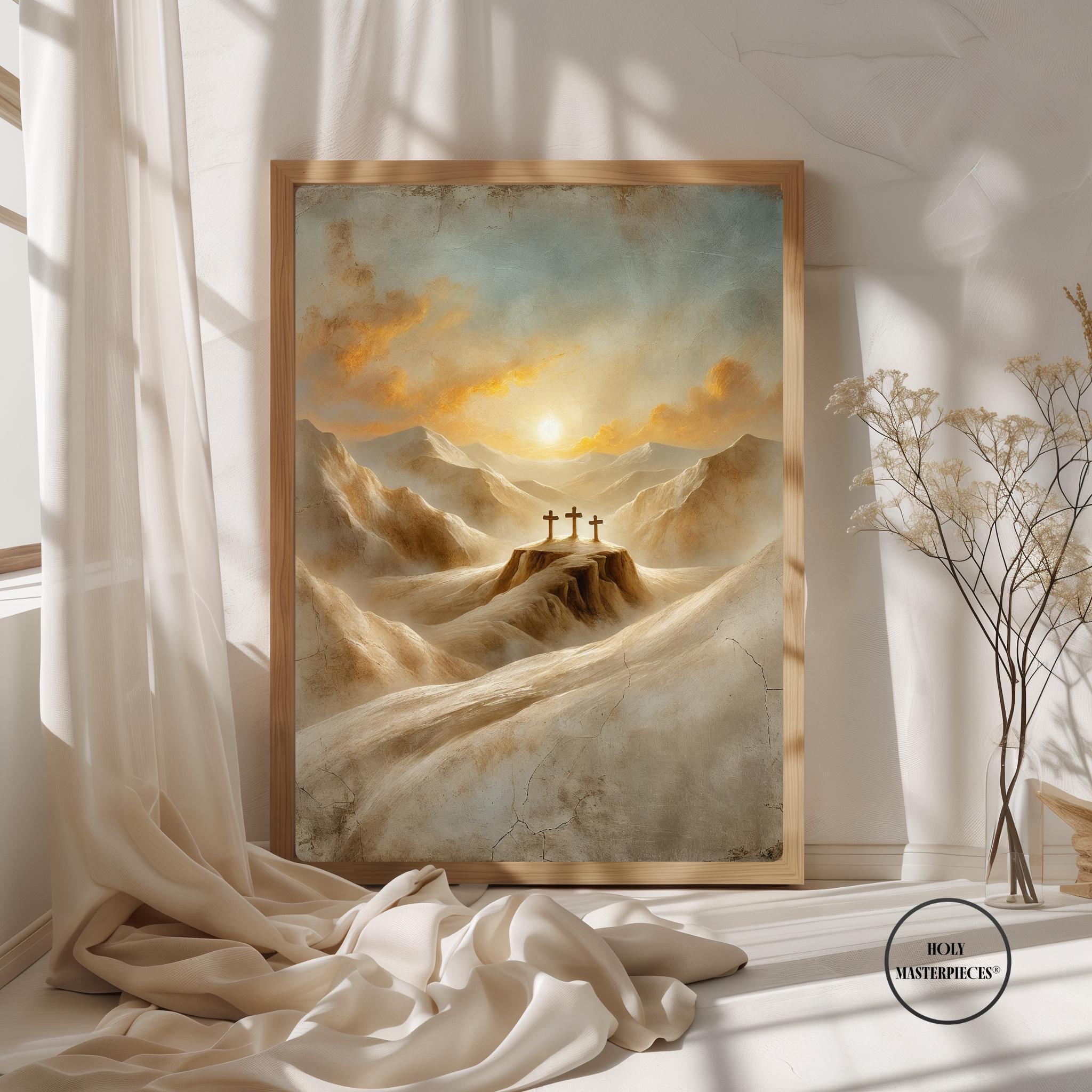 • Three Crosses on Golgotha — A symbolic depiction of the three crosses silhouetted against the rising light of Easter morning, evoking Good Friday sorrow and Resurrection hope