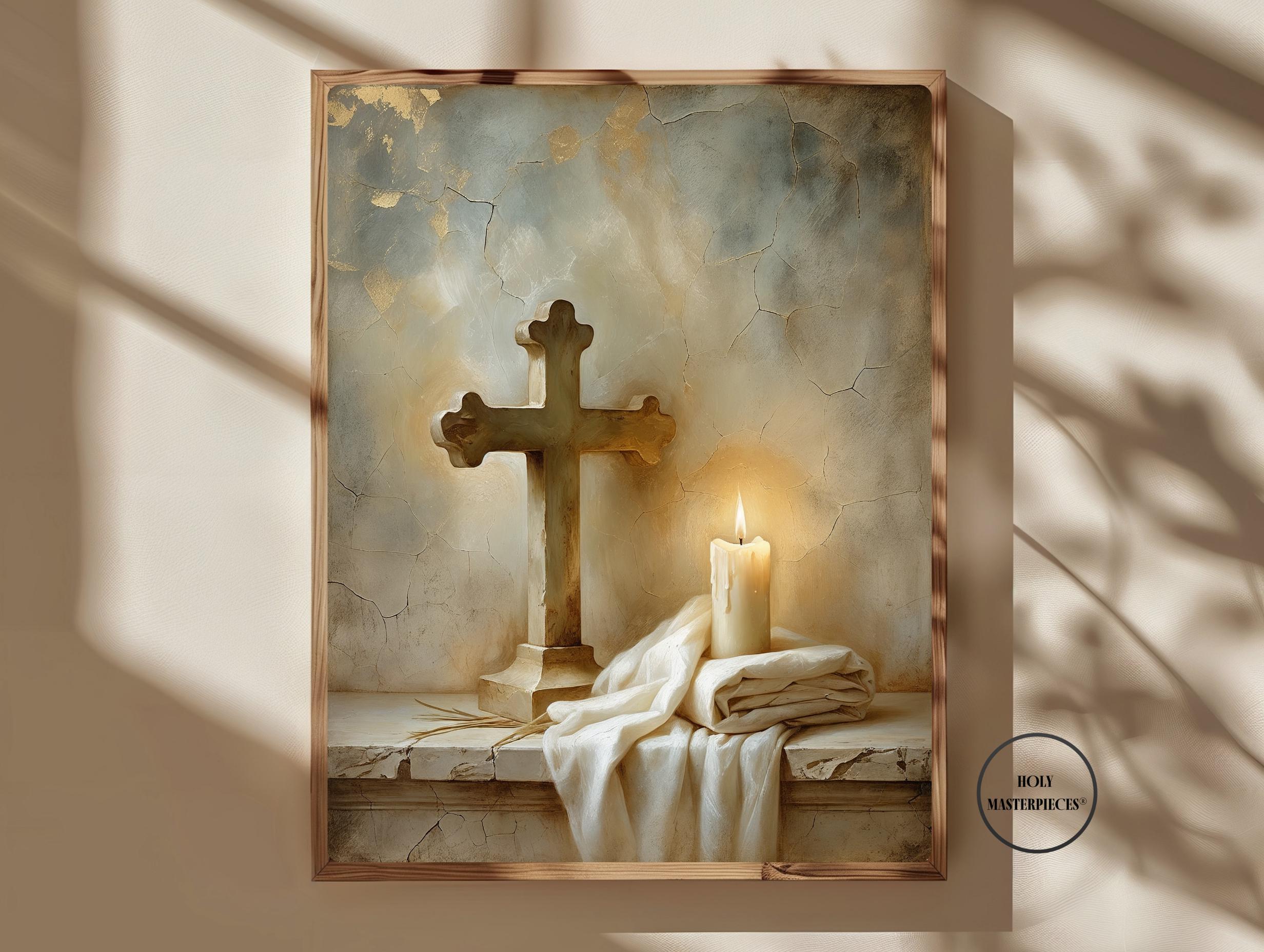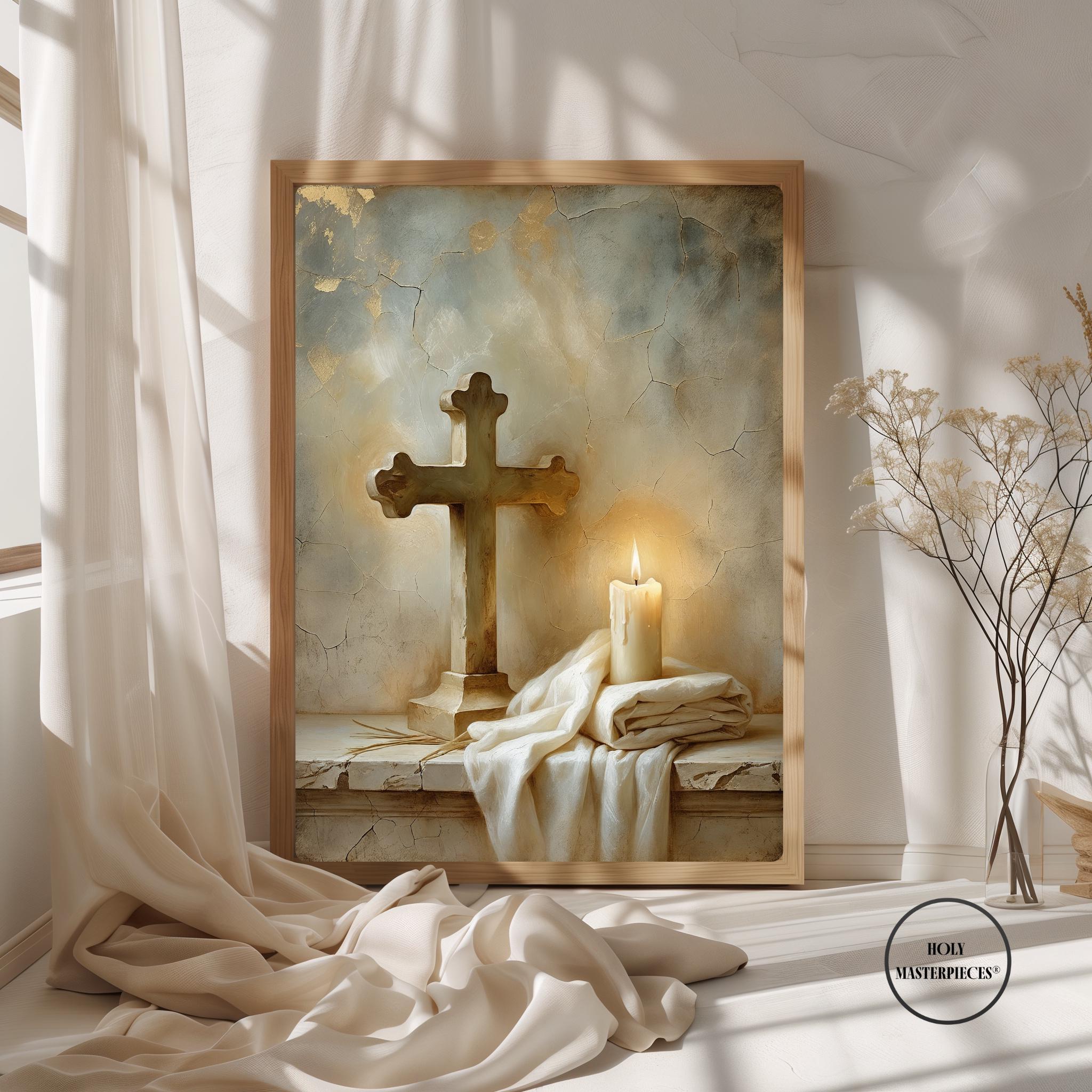 • Easter Altar — A contemplative still life featuring a wooden cross, folded white linen, and a softly glowing candle, symbolizing sacrifice, remembrance, and Resurrection
