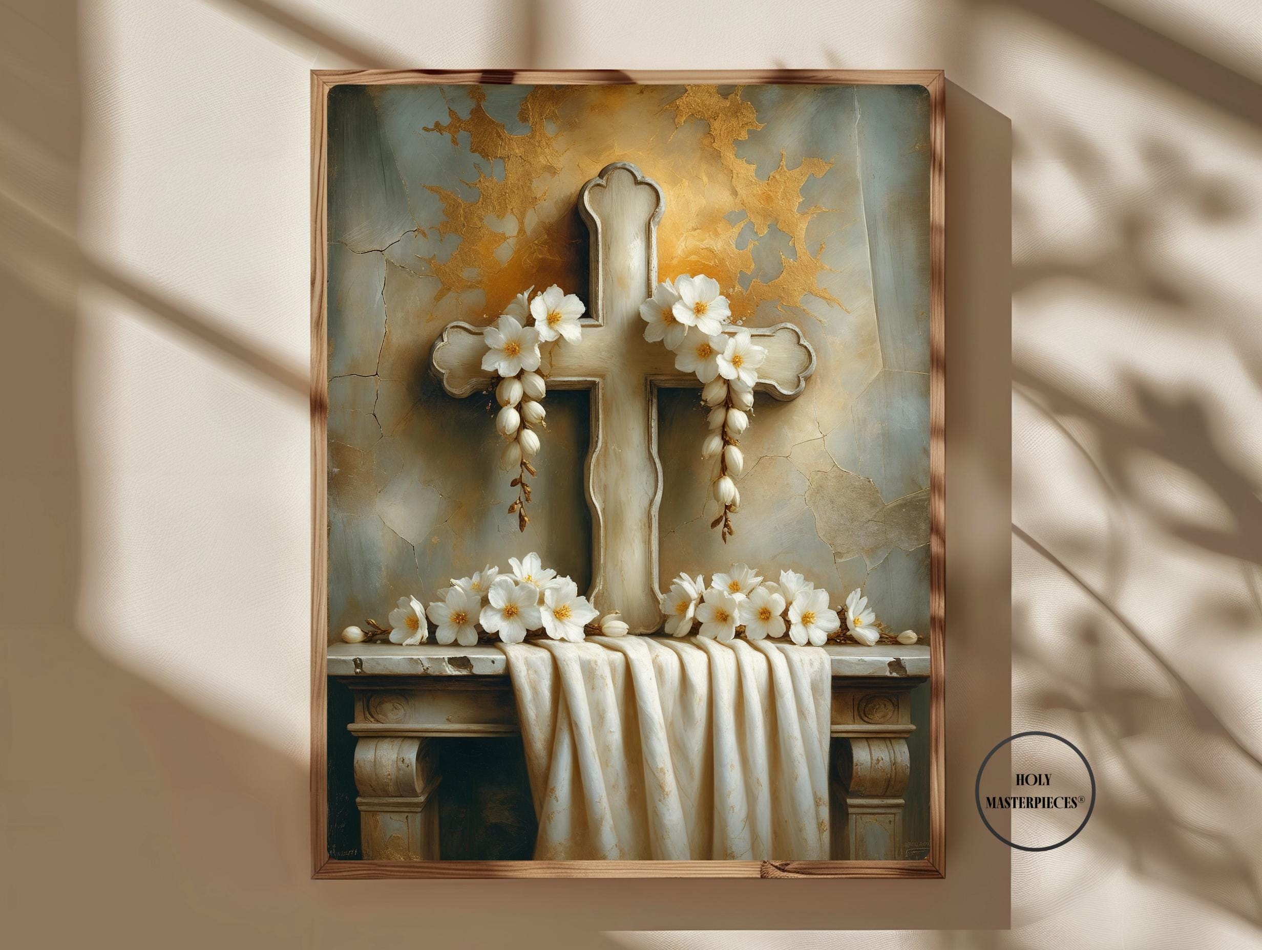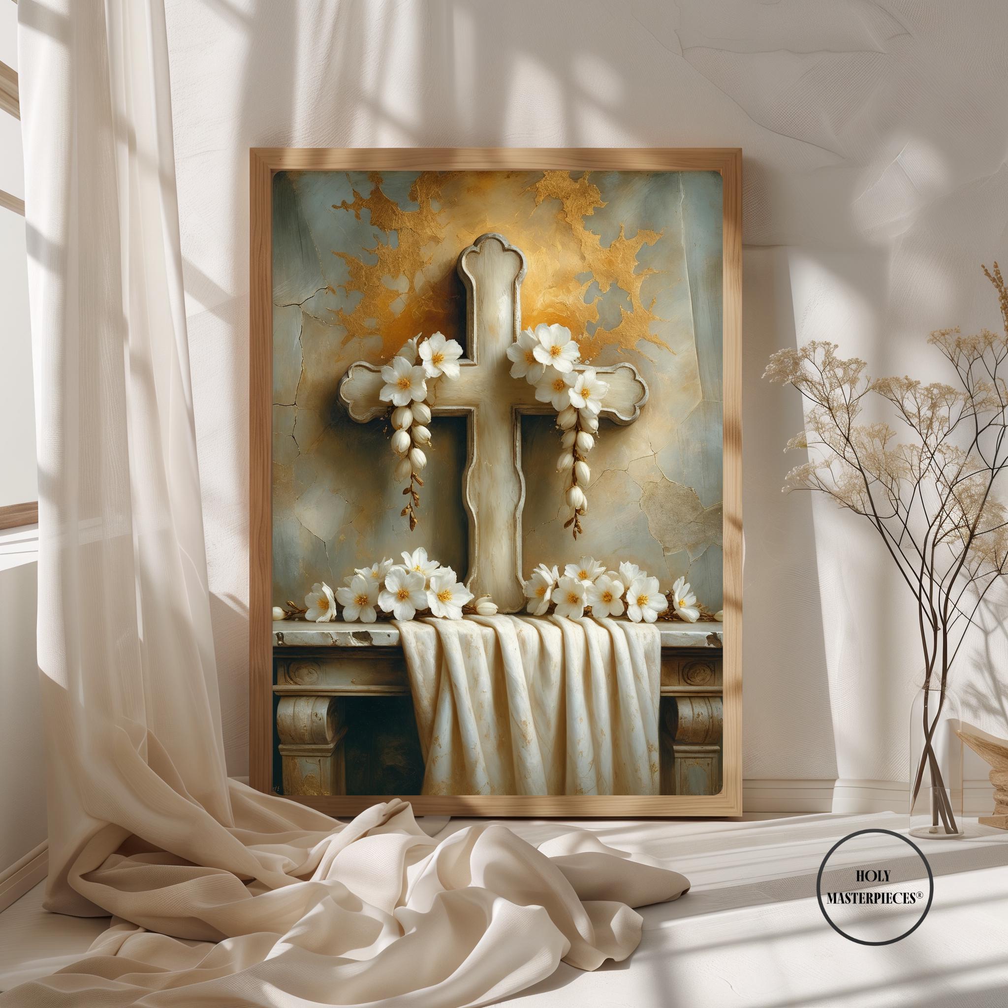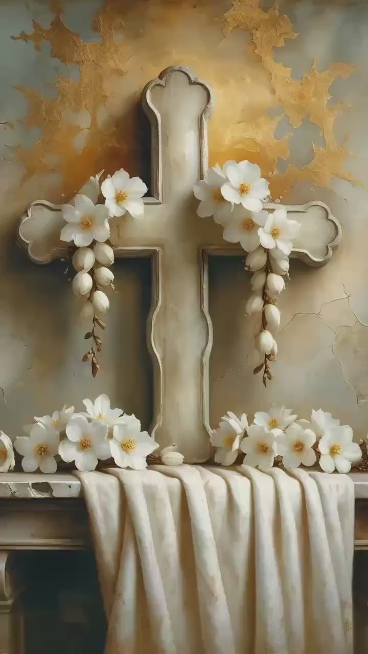 • Easter Garland — A carved wooden cross adorned with white spring flowers and draped ivory linen, expressing purity, renewal, and the promise of new life
