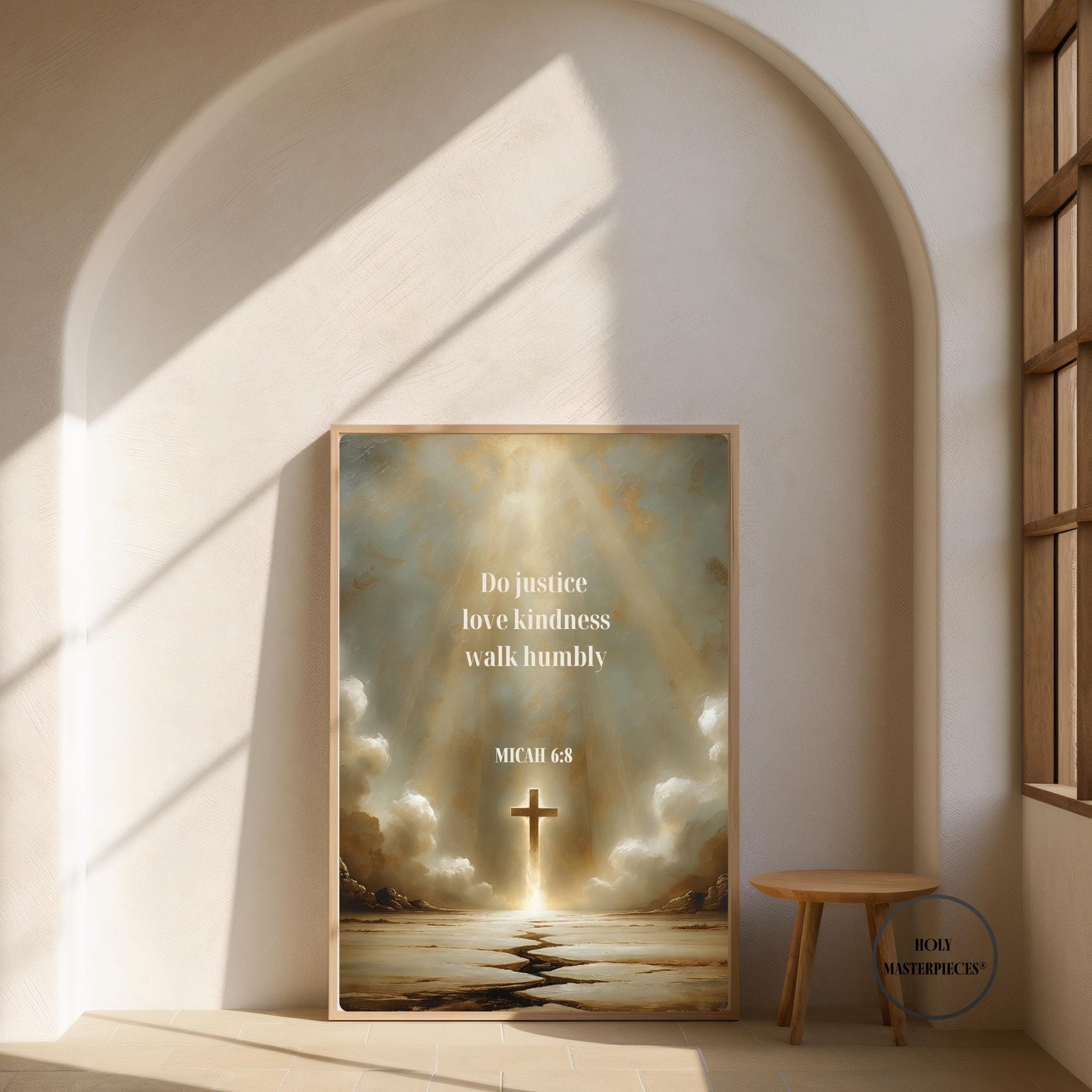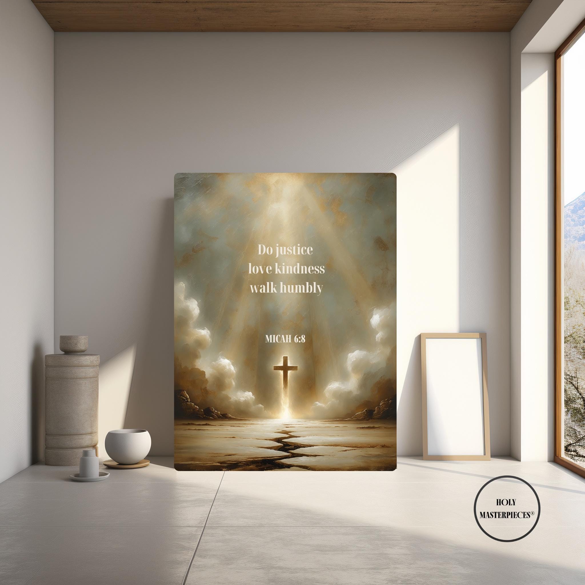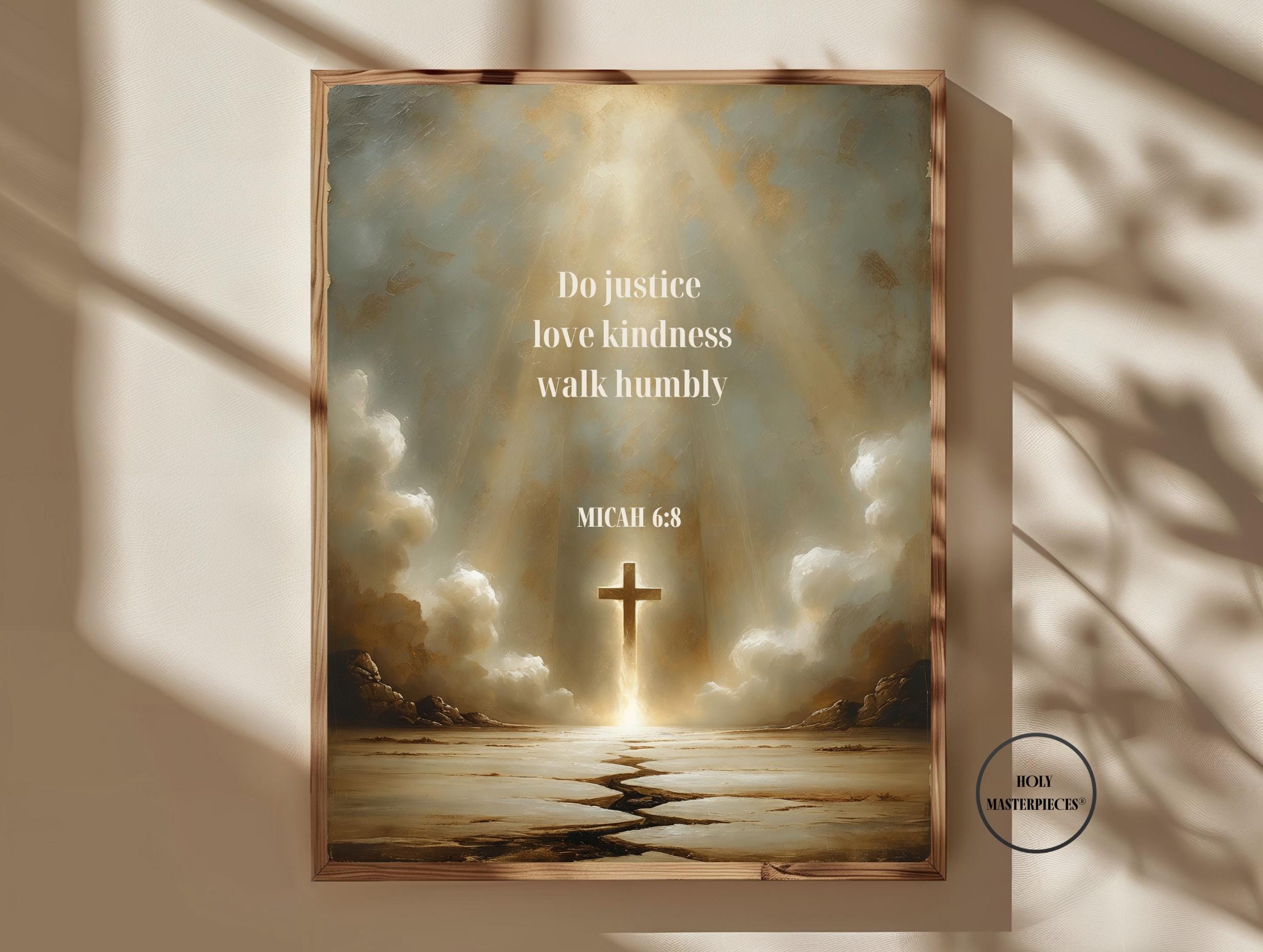 This contemplative scripture artwork is inspired by Micah 6:8, presenting a quiet and reverent visual meditation on faithful living, humility, and devotion to God. The composition features a radiant cross emerging from light, with a subtle path leading forward beneath it, symbolizing a life shaped by justice, kindness, and humble obedience. The scene is expansive yet restrained, drawing the viewer inward toward reflection and prayer.