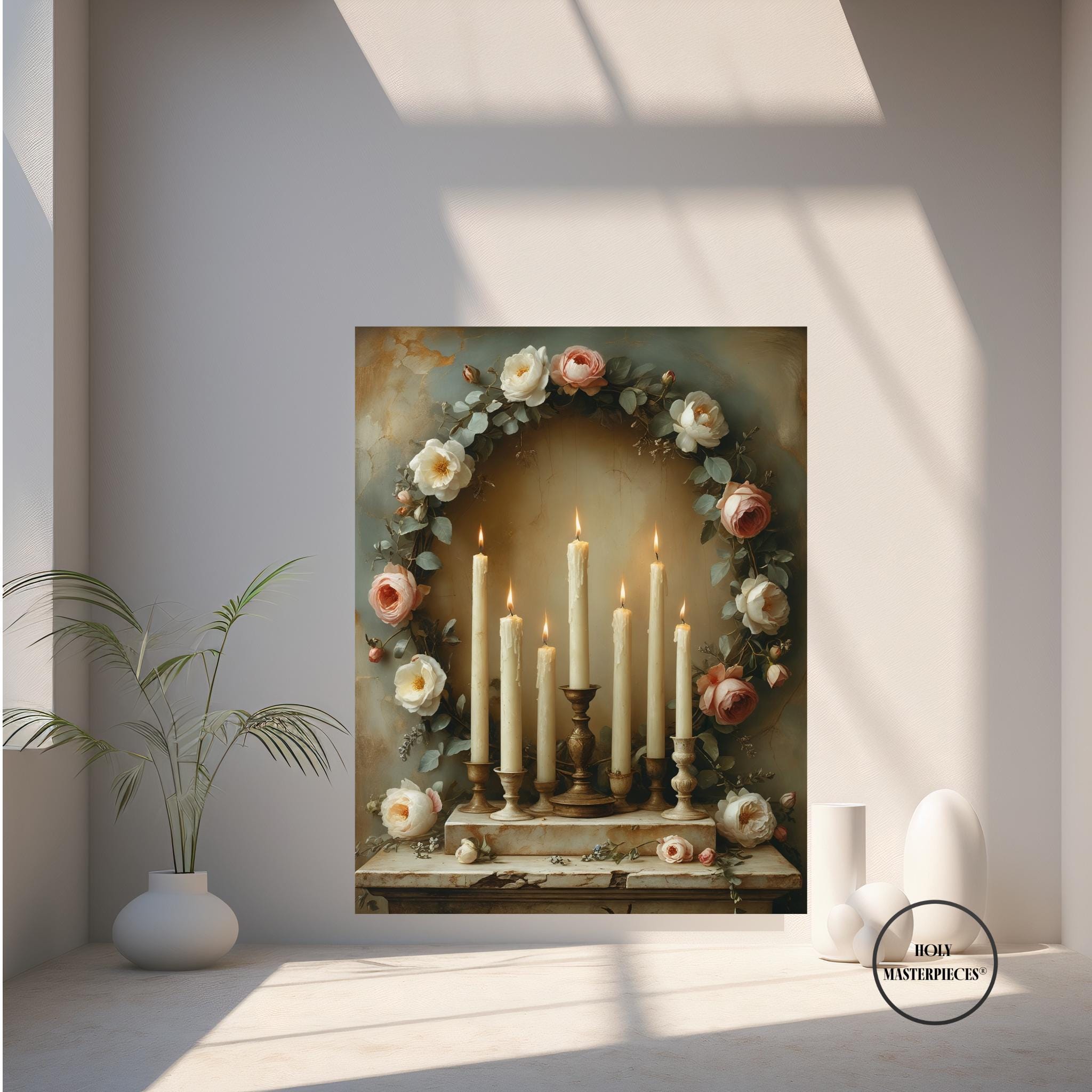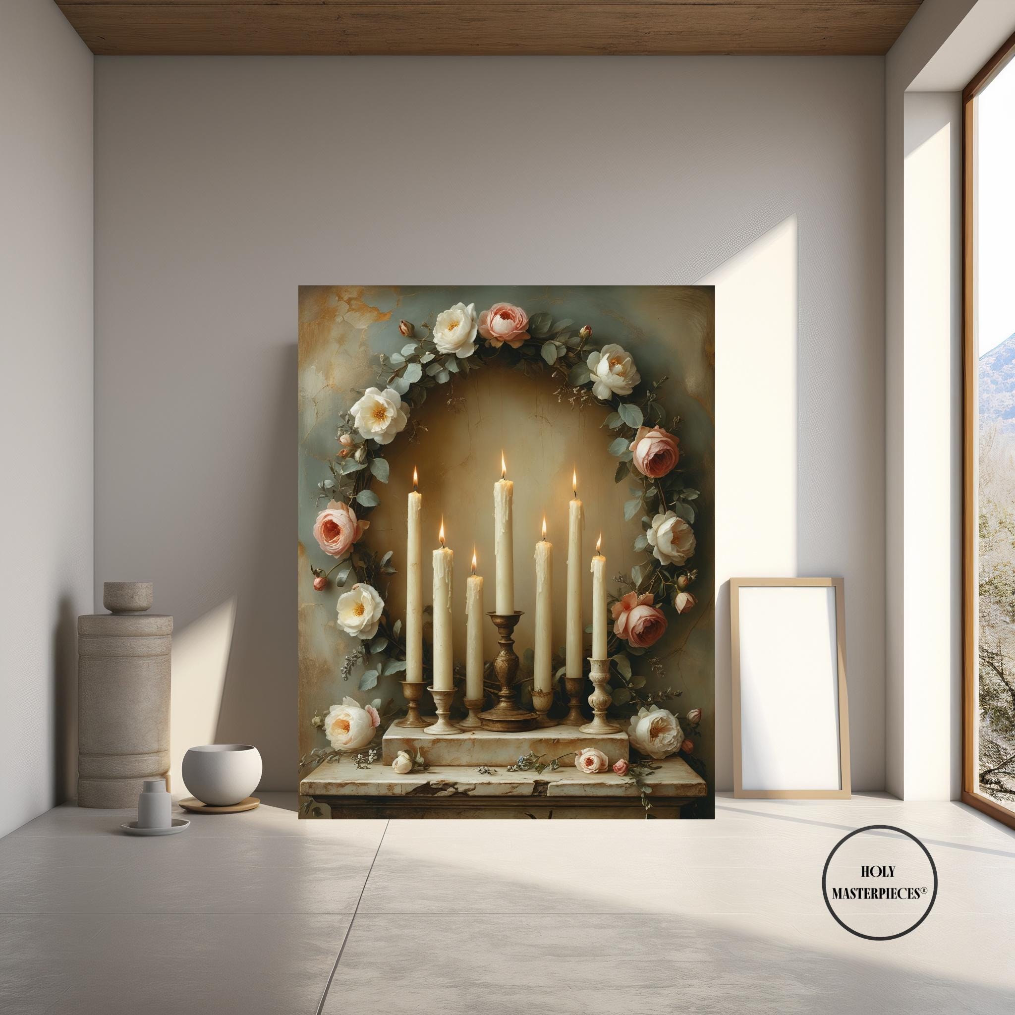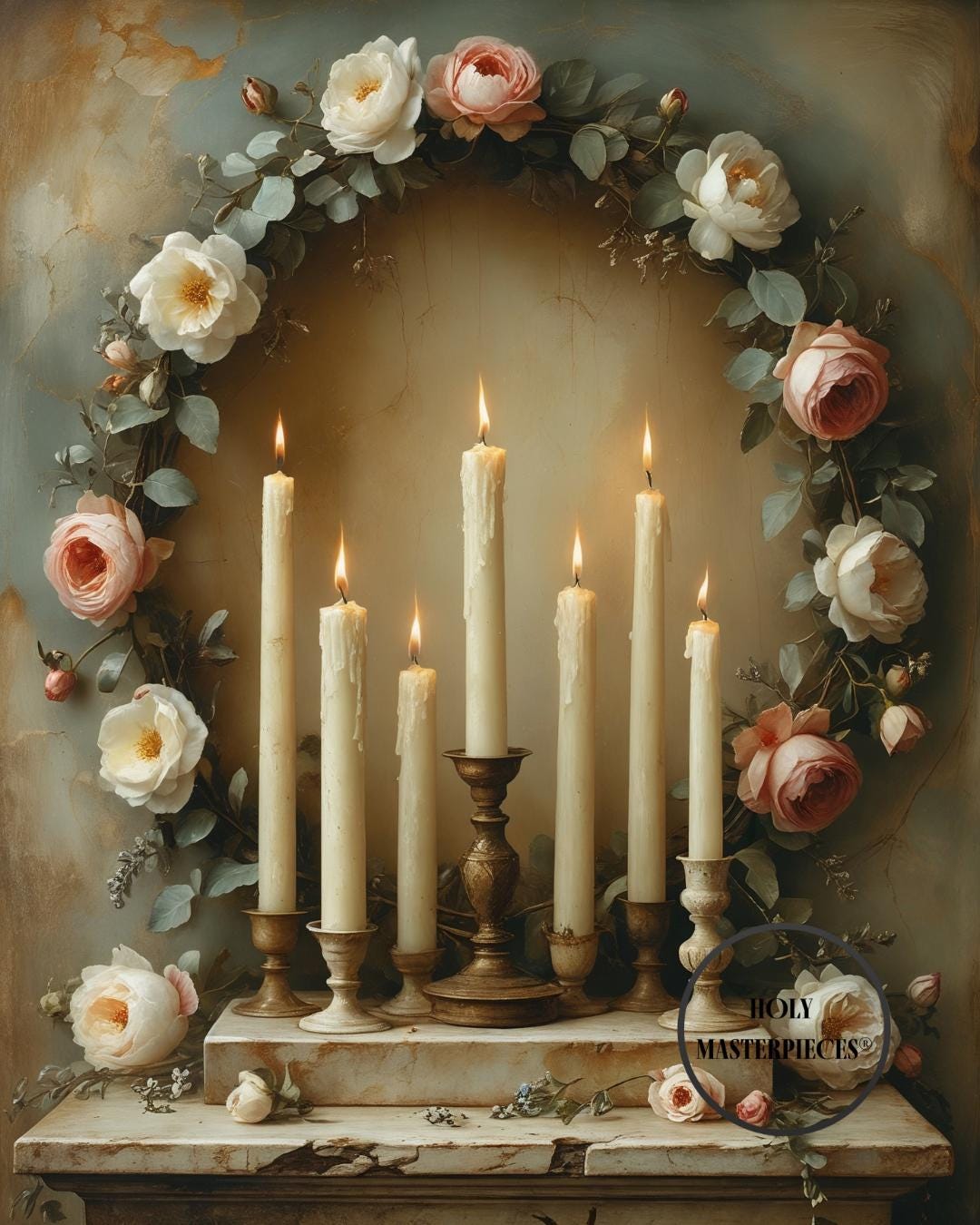 A peaceful and contemplative still-life featuring softly glowing devotional candles arranged on an aged altar, framed within a classical floral garland inspired by 17th-century Flemish Baroque art. The candles—some tall, some partly melted—emit a warm, steady light that symbolizes prayer, hope, and the gentle presence of God. The surrounding garland of roses, lilies, peonies, violets, and muted greenery forms a timeless sacred frame reminiscent of classical Baroque devotional paintings.