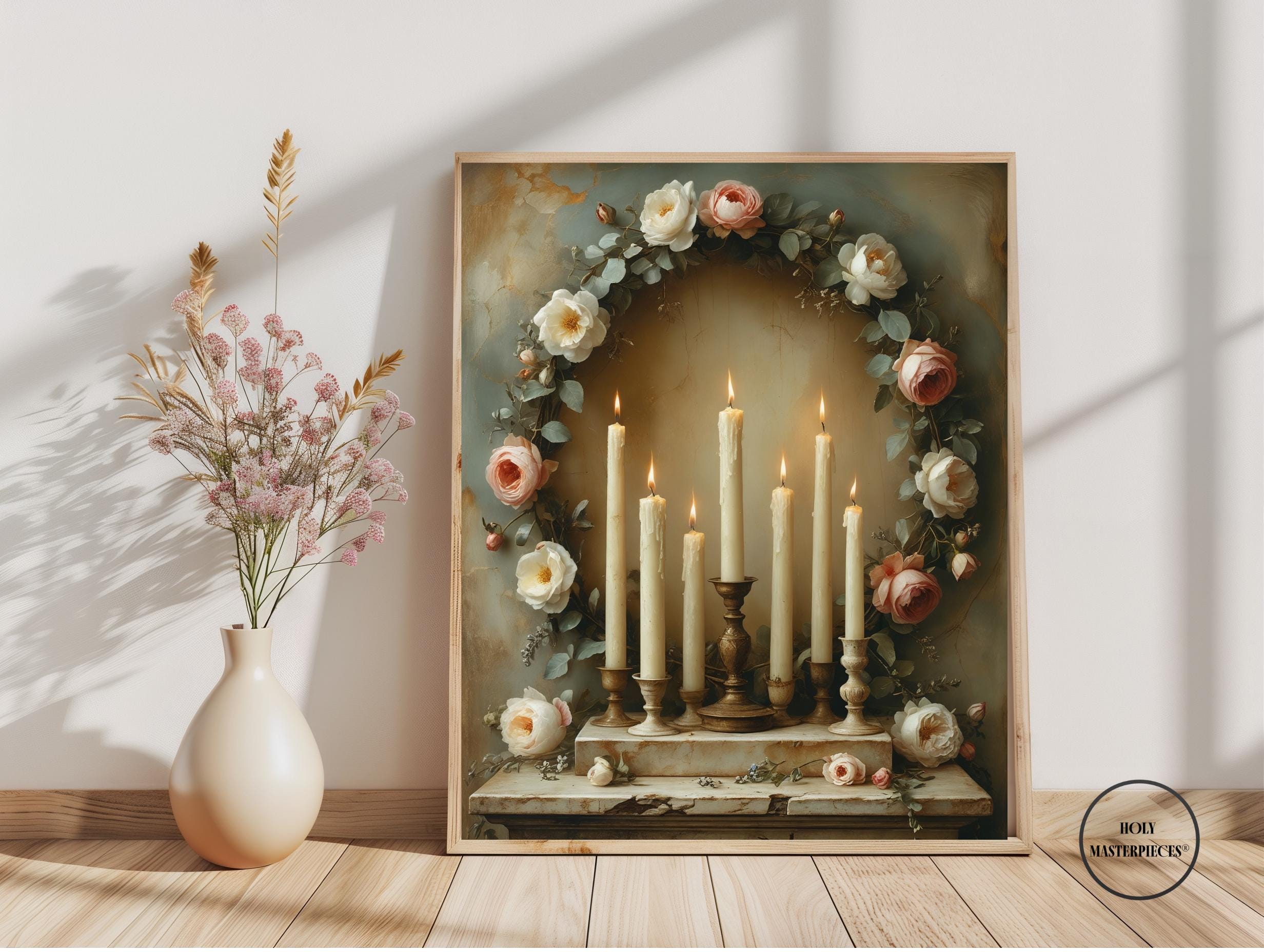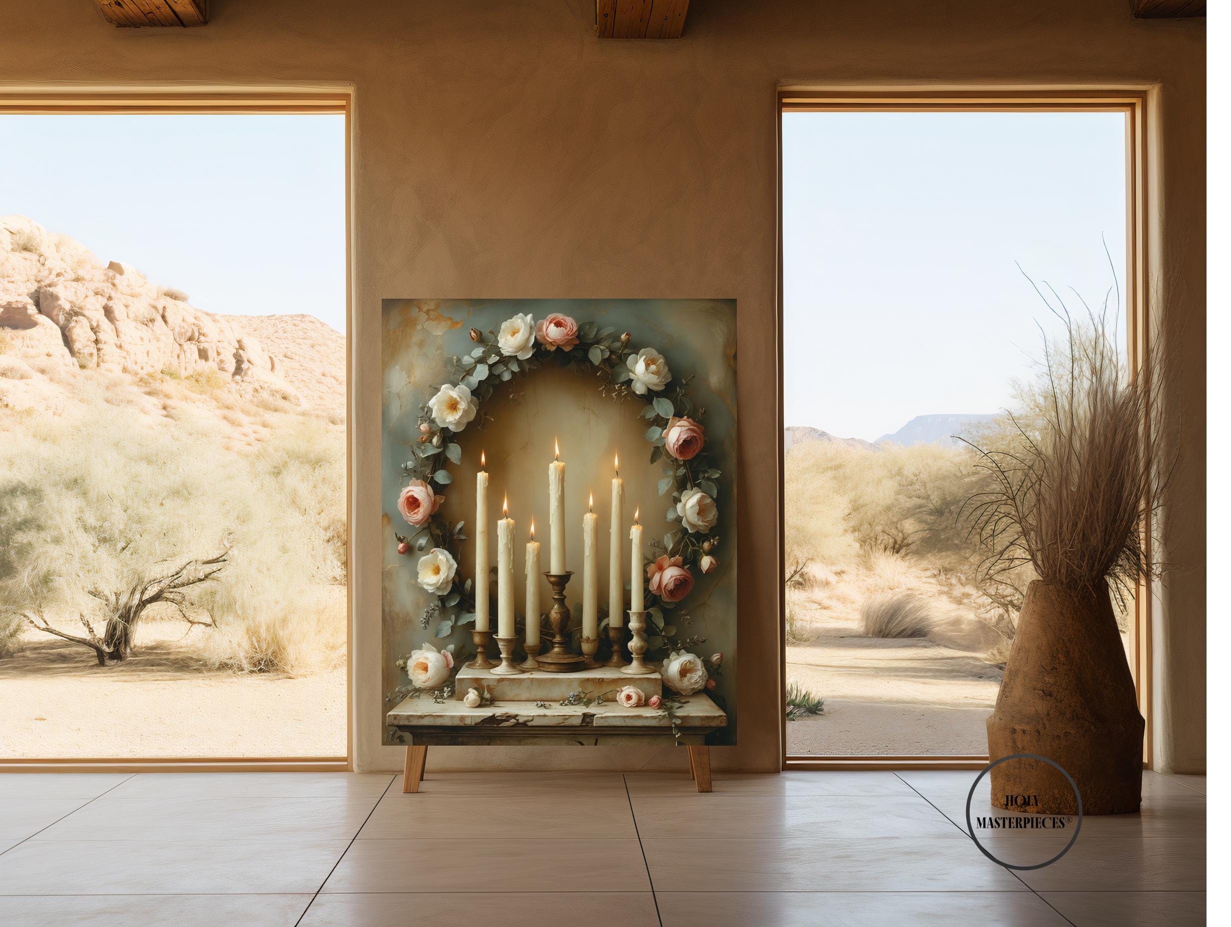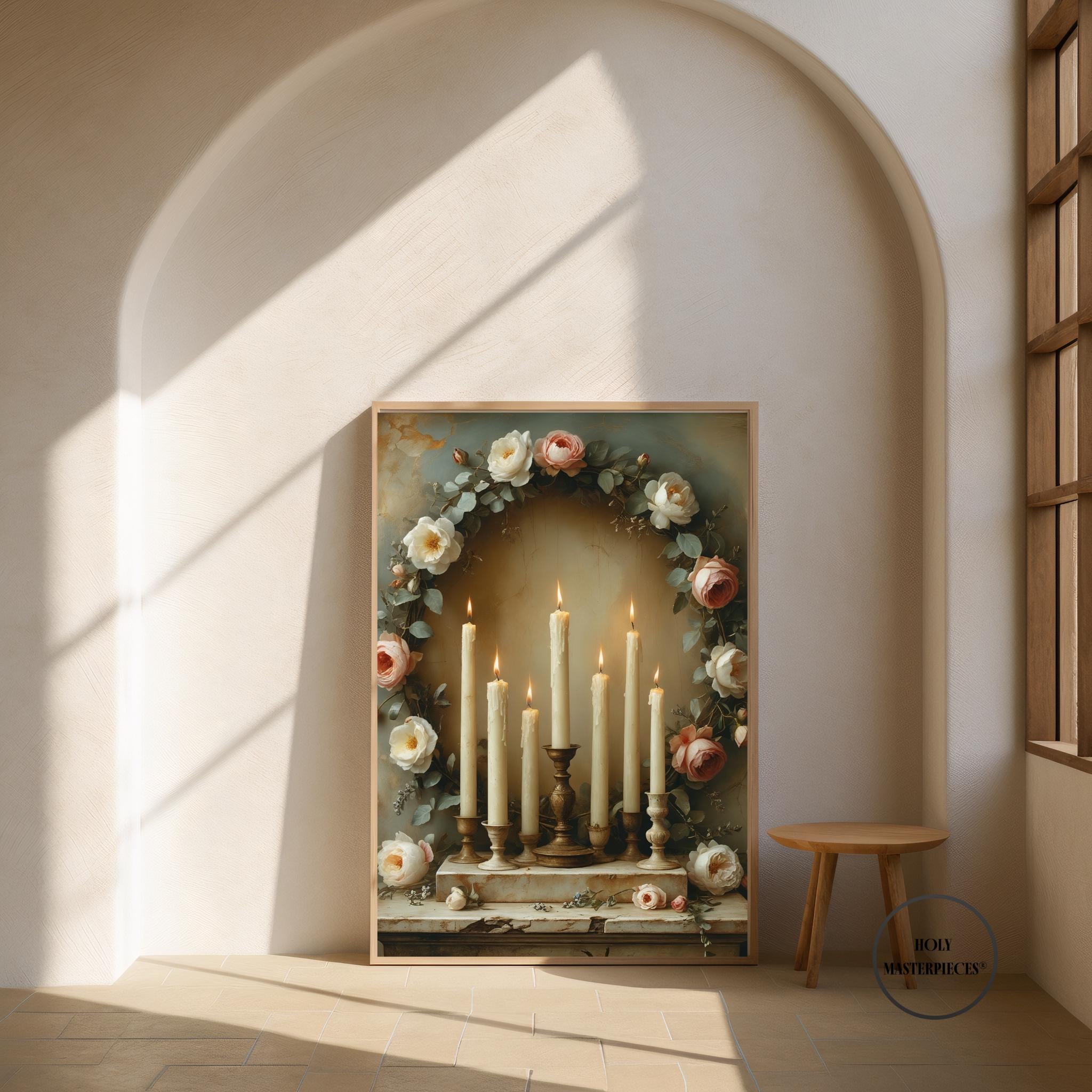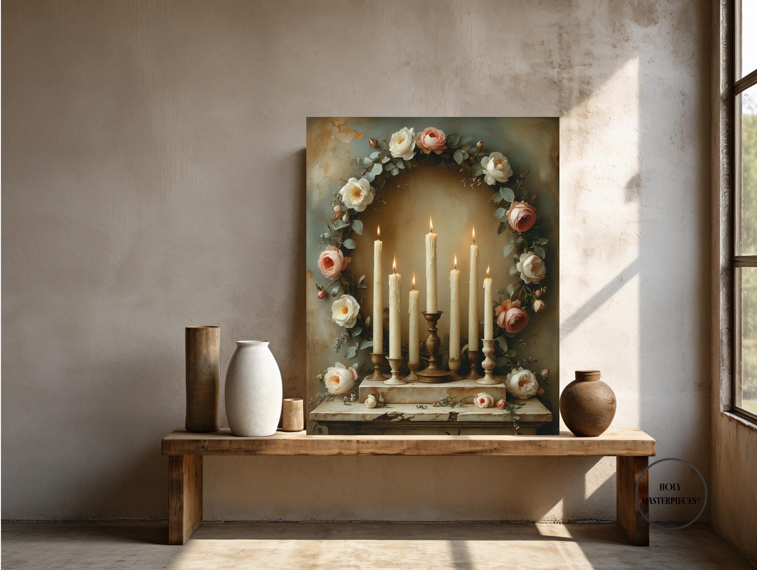 A peaceful and contemplative still-life featuring softly glowing devotional candles arranged on an aged altar, framed within a classical floral garland inspired by 17th-century Flemish Baroque art. The candles—some tall, some partly melted—emit a warm, steady light that symbolizes prayer, hope, and the gentle presence of God. The surrounding garland of roses, lilies, peonies, violets, and muted greenery forms a timeless sacred frame reminiscent of classical Baroque devotional paintings.