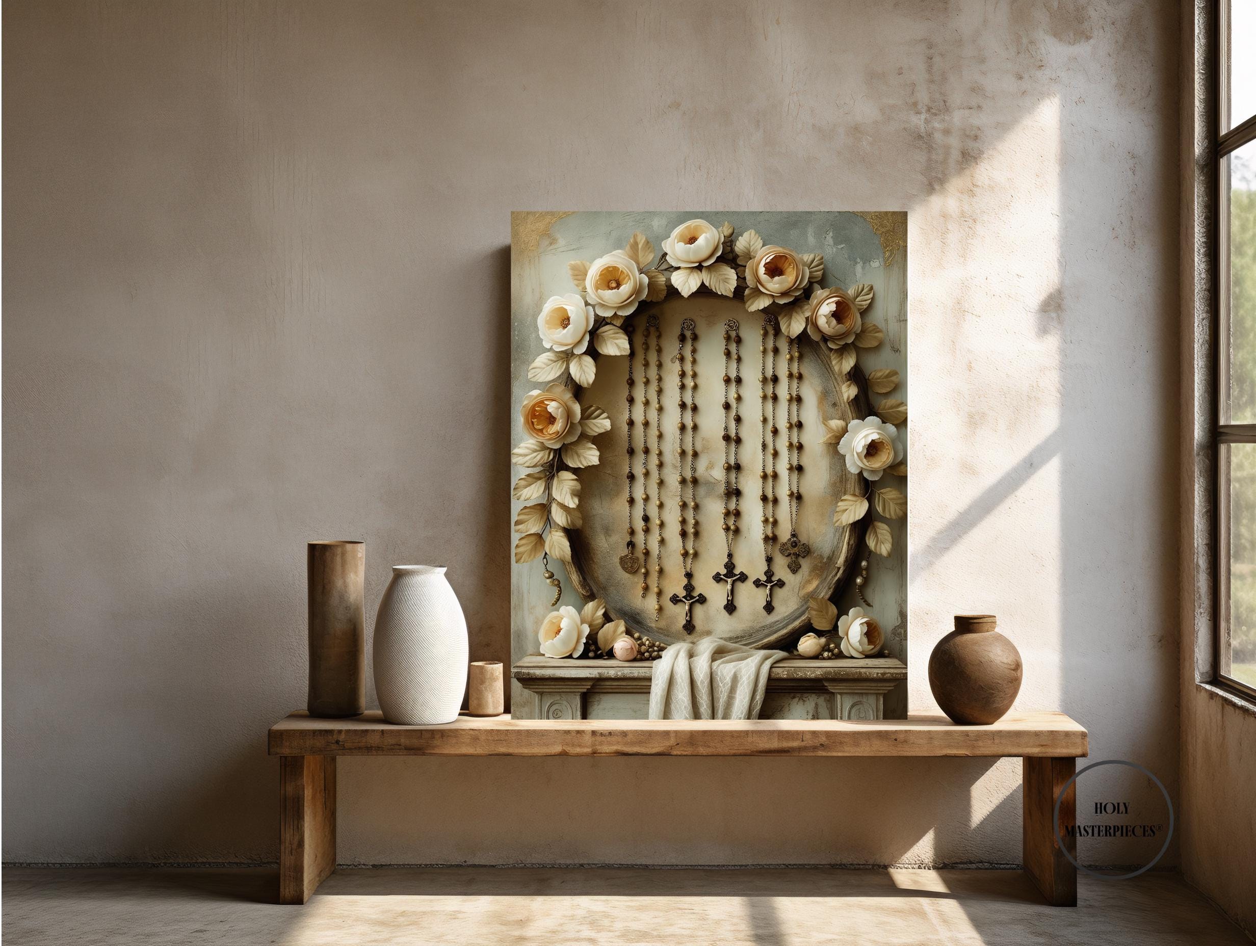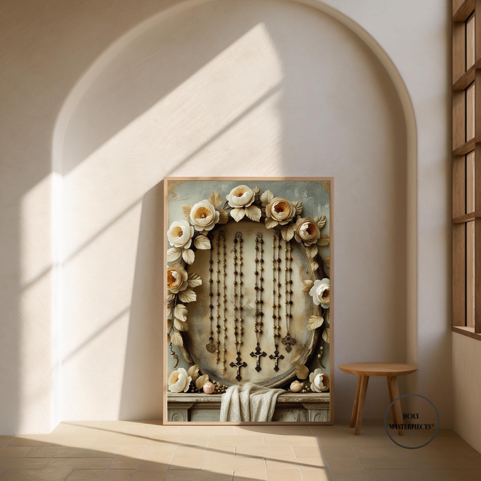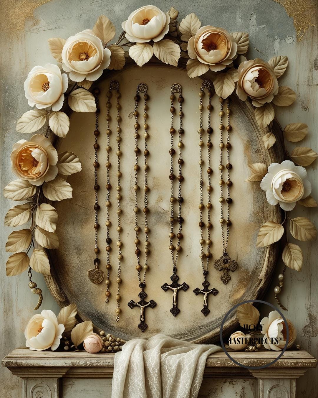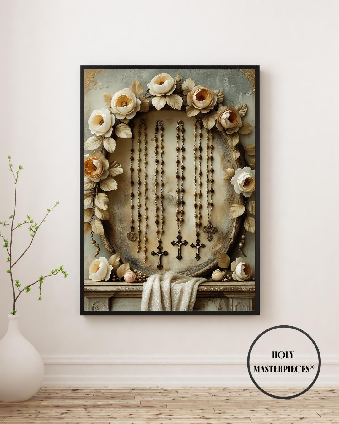 A peaceful and reverent still-life featuring a selection of rosaries draped gently across an aged altar, framed within a classical floral garland inspired by 17th-century Flemish devotional art. Wooden beads, stone beads, and simple crucifix pendants rest in soft, natural folds, symbolizing prayer, devotion, and the quiet rhythm of the Rosary. The surrounding garland—composed of roses, lilies, peonies, and muted greenery—forms a timeless sacred frame reminiscent of historic Baroque religious paintings.