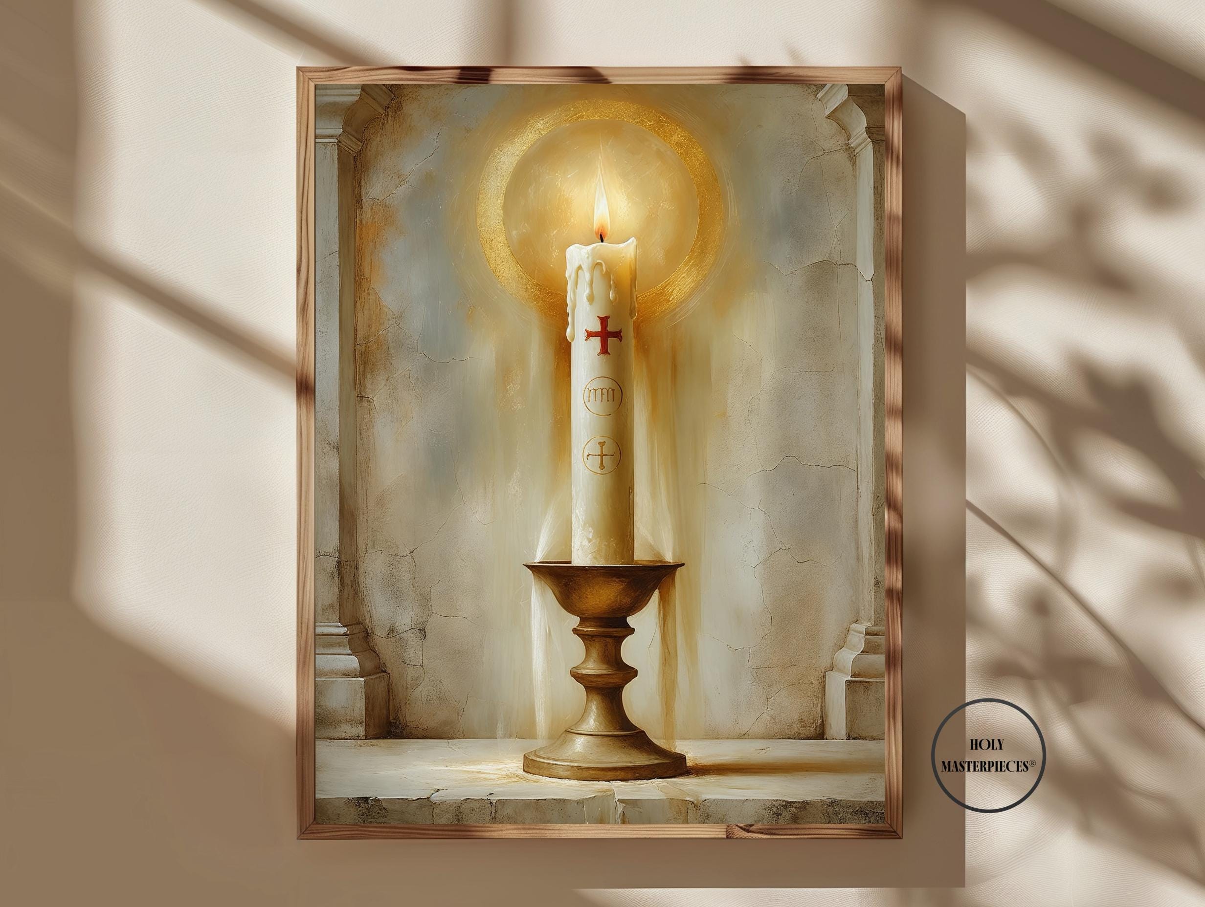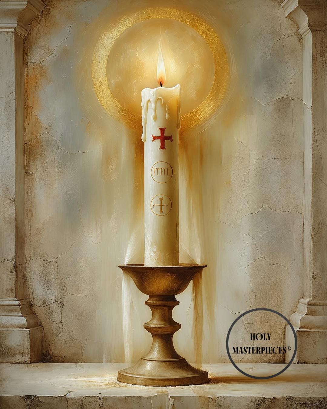 The artwork features a tall ivory candle bearing a simple red cross, standing in a classic brass holder. The flame glows softly within a radiant golden halo, with light spilling gently onto the surrounding stone and plaster. Muted architectural details frame the scene, giving the impression of a quiet chapel or altar niche.