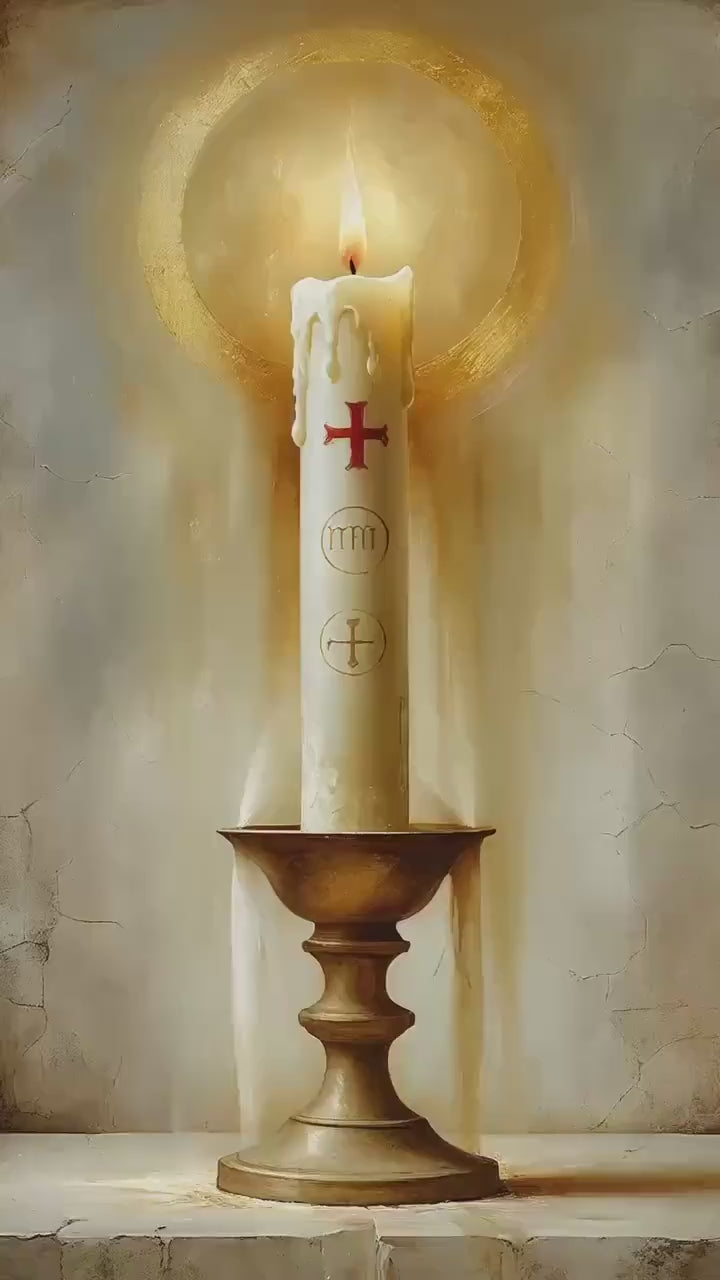 A reverent depiction of a single holy candle, rendered in a soft 17th-century sacred oil-painting style. Warm golden tones, gentle chiaroscuro, and cracked-plaster textures create a timeless devotional atmosphere inspired by Easter and the light of Christ.