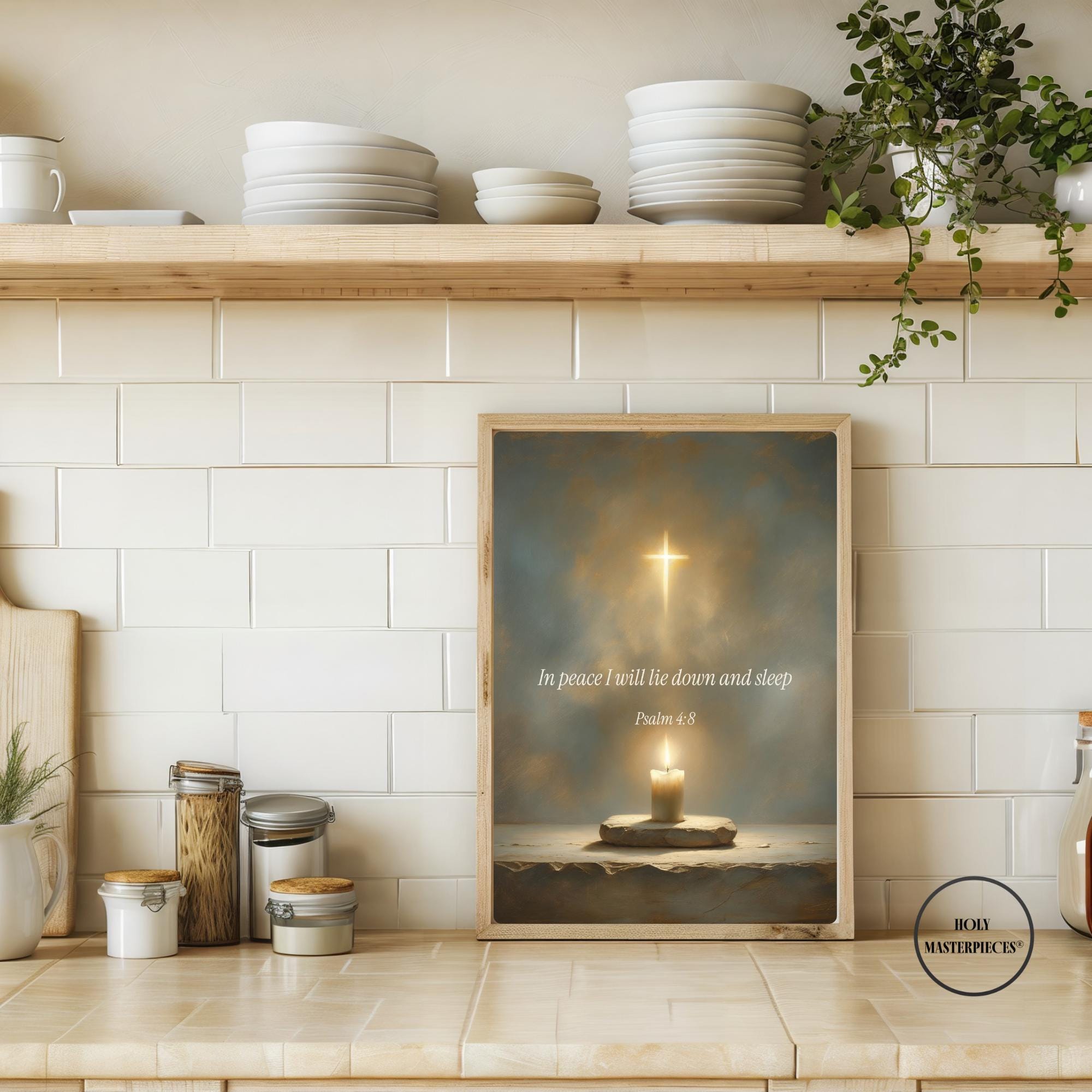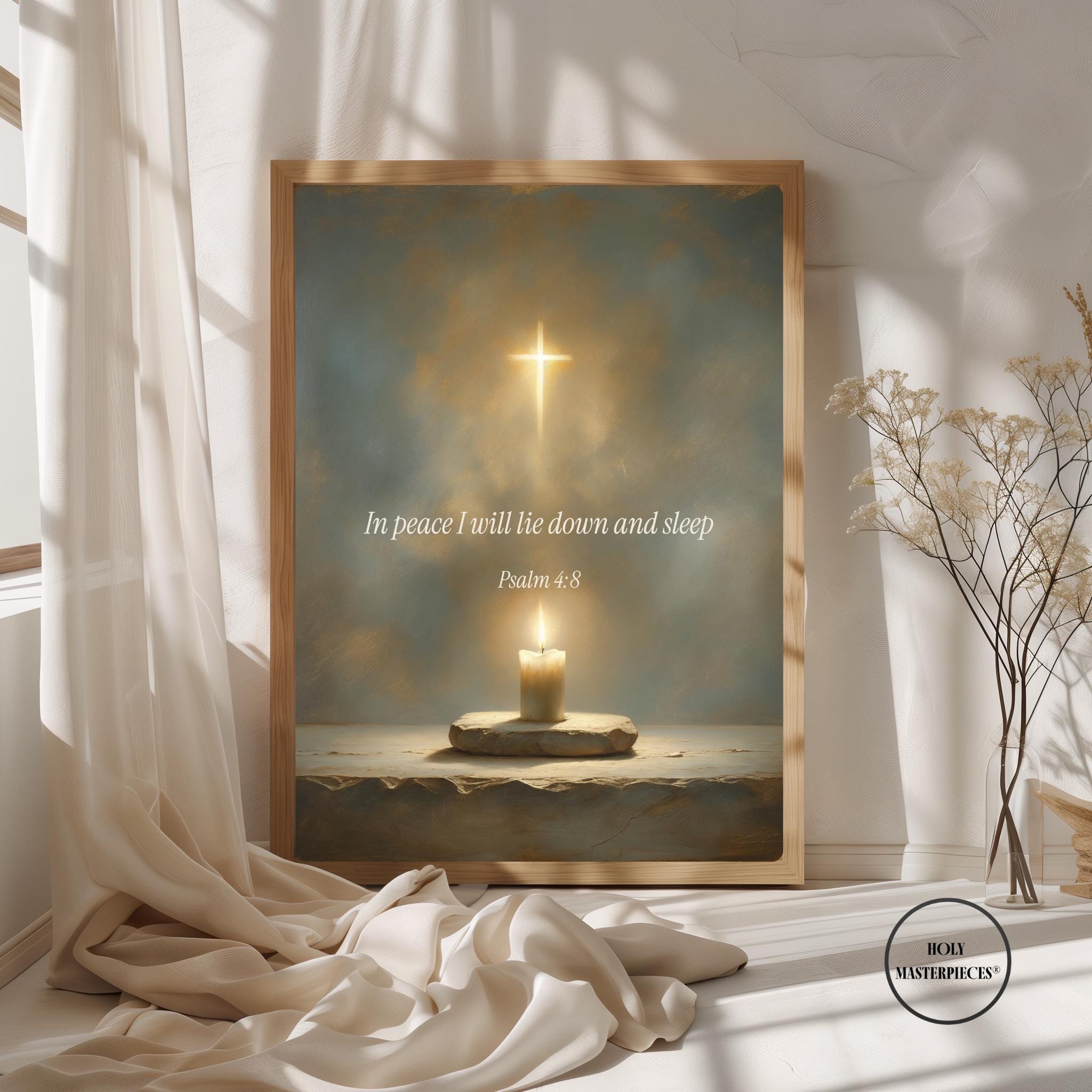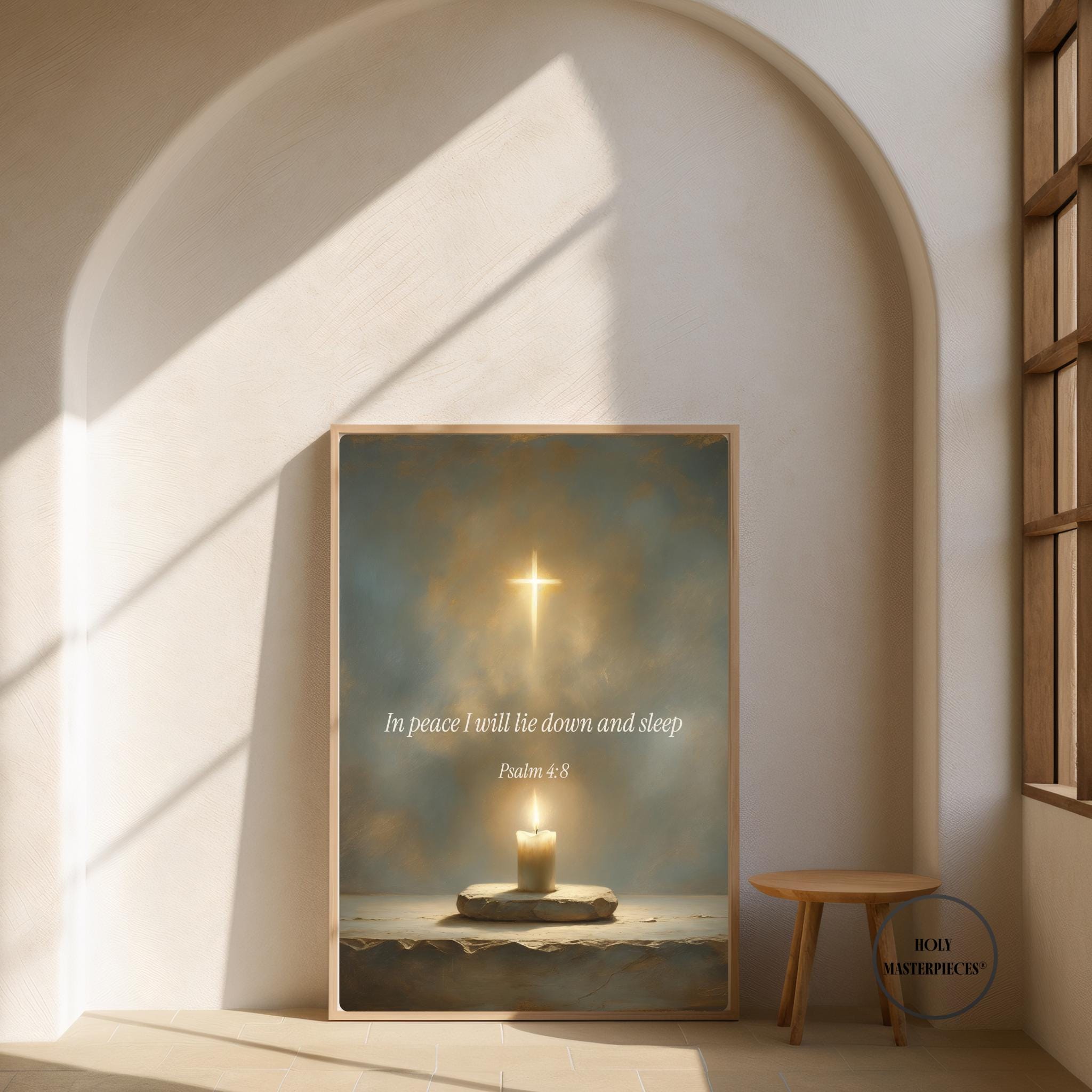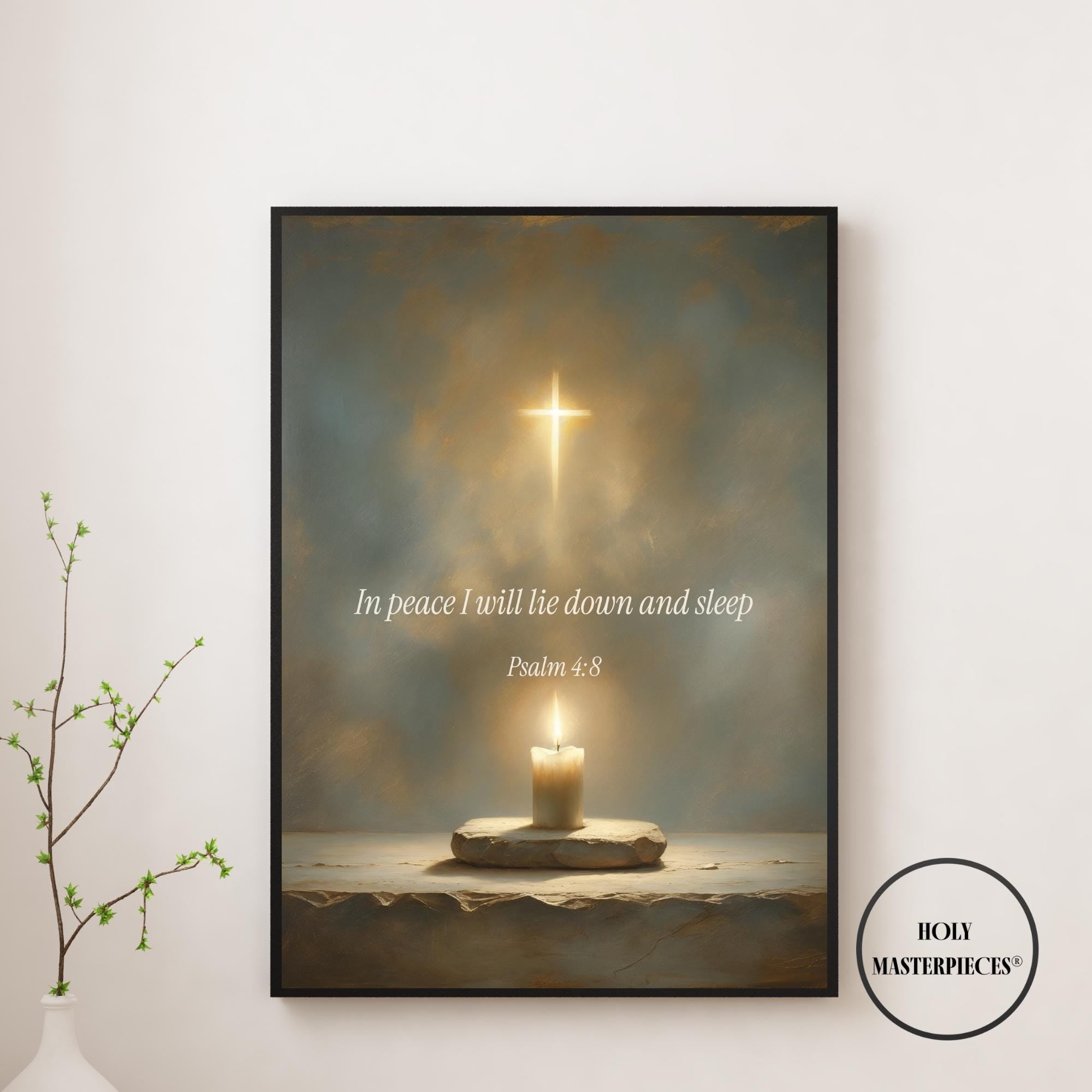 Created in the tradition of 17th-century Western sacred oil painting, the artwork uses a muted devotional palette, subtle chiaroscuro, and a warm, timeless glow. The verse is integrated delicately into the composition using a classical serif typeface, preserving the painterly integrity of the image while supporting its devotional purpose. This piece is designed to bring reassurance, quiet rest, and spiritual comfort into any prayer space or home.