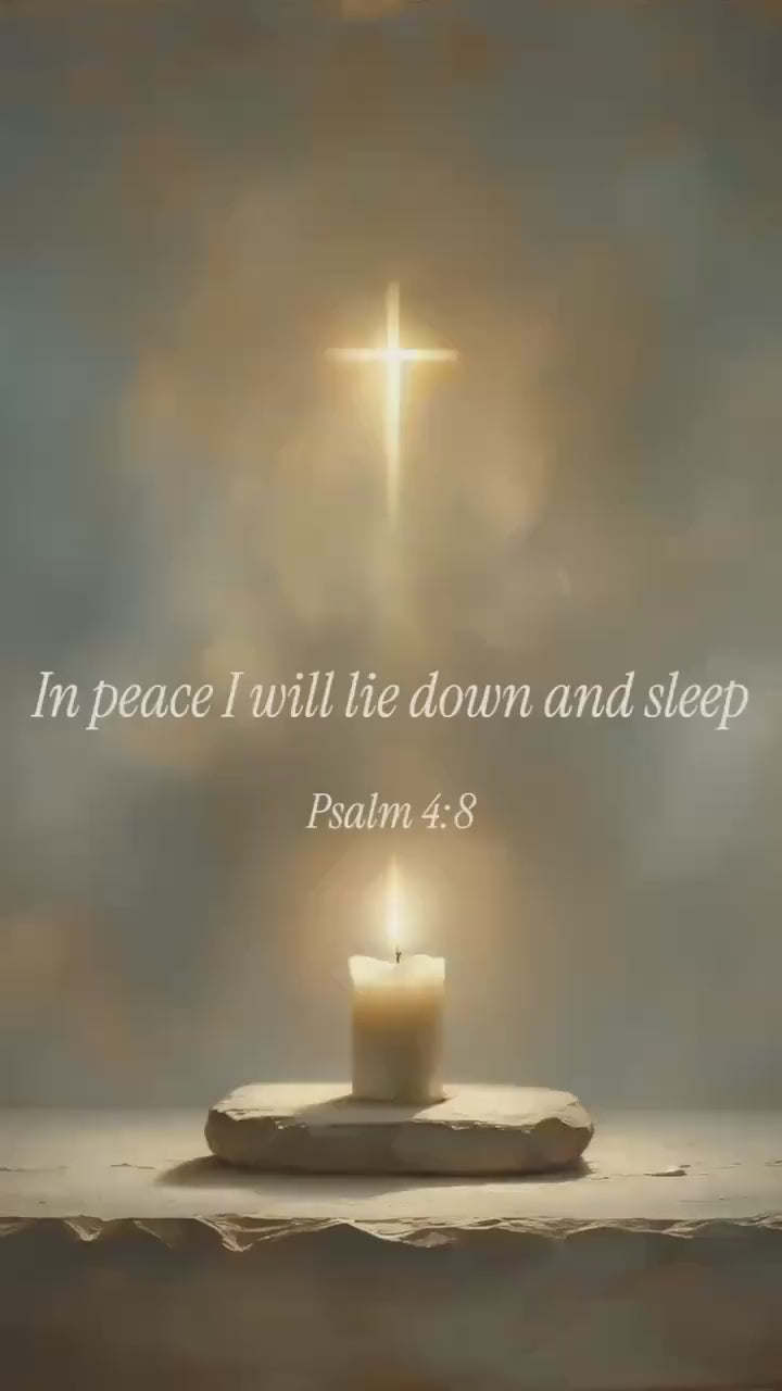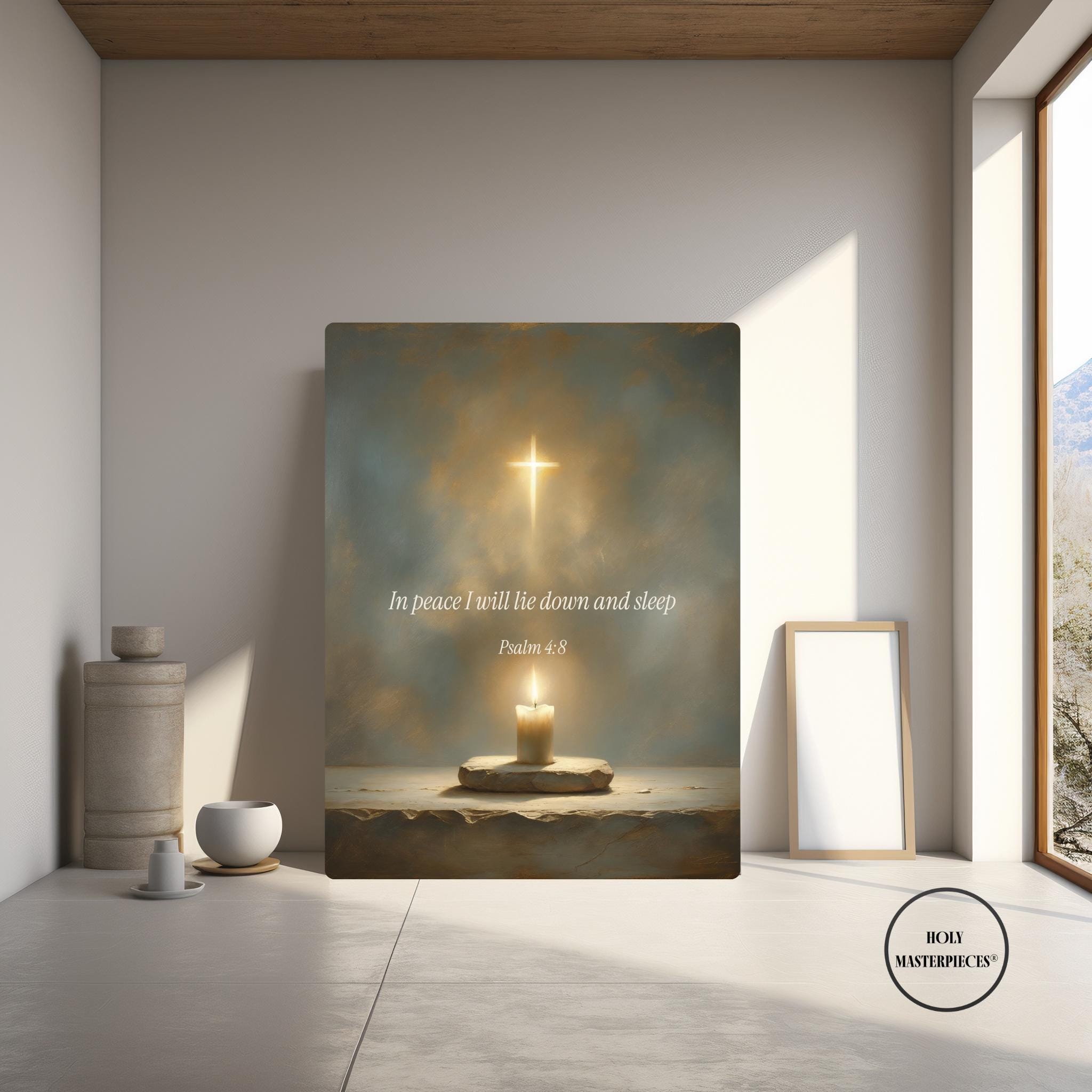 This contemplative scripture artwork is inspired by Psalm 4:8, presenting a quiet and reverent visual meditation on peace, rest, and trust in God’s protection. The composition features a single, faint symbol set within a subdued, atmospheric space, allowing the message of calm and surrender to remain central. The scene is intentionally restrained, creating room for stillness, reflection, and prayer.